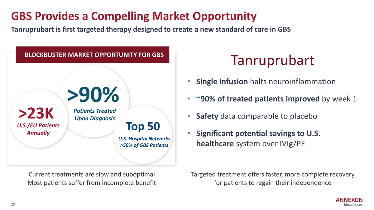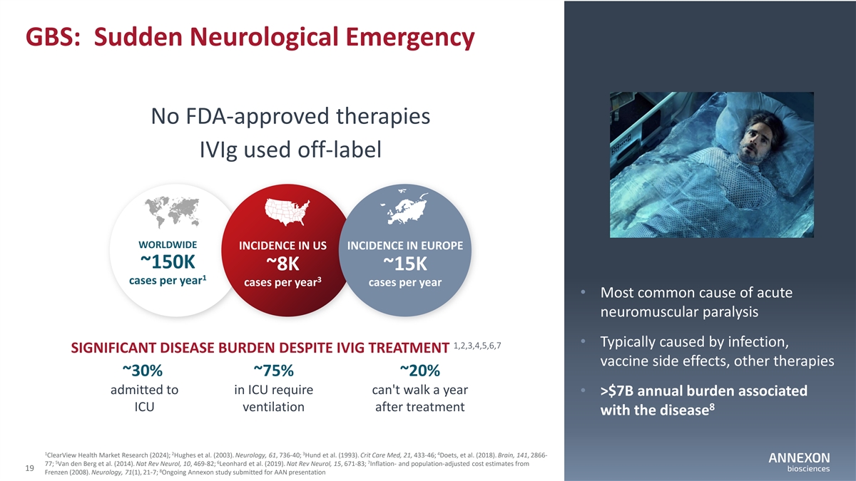 GBS: Sudden Neurological Emergency No FDA‐ approved therapies IVIg used off‐ label WORLDWIDE INCIDENCE IN US INCIDENCE IN EUROPE ~150K ~8K ~15K 1 3 cases per year cases per year cases per year • Most common cause of acute neuromuscular paralysis • Typically caused by infection, 1,2,3,4,5,6,7 SIGNIFICANT DISEASE BURDEN DESPITE IVIG TREATMENT vaccine side effects, other therapies ~30% ~75% ~20% admitted to in ICU require can't walk a year • >$7B annual burden associated 8 ICU ventilation after treatment with the disease 1 2 3 4 ClearView Health Market Research (2024); Hughes et al. (2003). Neurology, 61, 736‐ 40; Hund et al. (1993). Crit Care Med, 21, 433‐ 46; Doets, et al. (2018). Brain, 141, 2866‐ 5 6 7 77; Van den Berg et al. (2014). Nat Rev Neurol, 10, 469‐ 82; Leonhard et al. (2019). Nat Rev Neurol, 15, 671‐ 83; Inflation‐ and population‐ adjusted cost estimates from 19 8 Frenzen (2008). Neurology, 71(1), 21‐ 7; Ongoing Annexon study submitted for AAN presentation