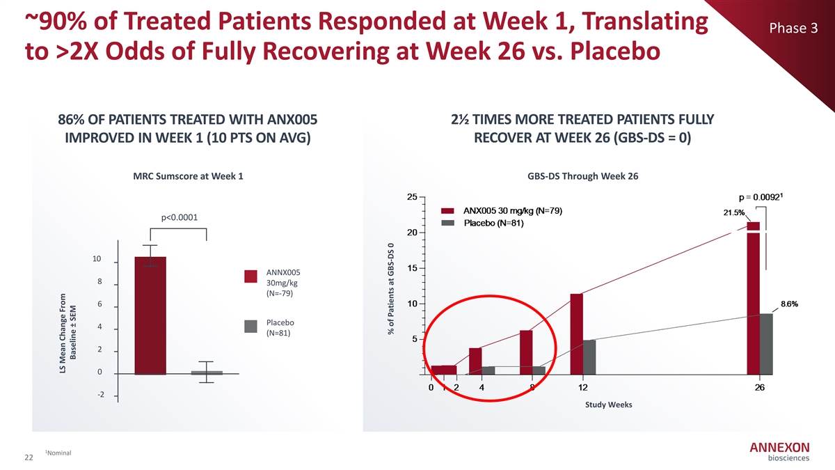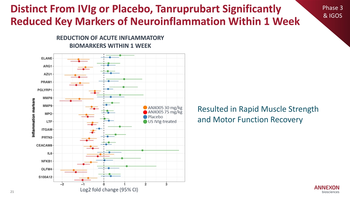 Phase 3 Distinct From IVIg or Placebo, Tanruprubart Significantly & IGOS Reduced Key Markers of Neuroinflammation Within 1 Week REDUCTION OF ACUTE INFLAMMATORY BIOMARKERS WITHIN 1 WEEK Resulted in Rapid Muscle Strength and Motor Function Recovery 21