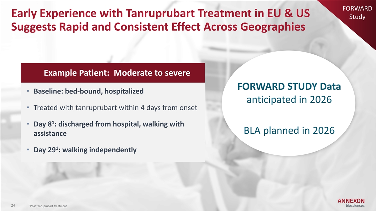 FORWARD Early Experience with Tanruprubart Treatment in EU & US Study Suggests Rapid and Consistent Effect Across Geographies Example Patient: Moderate to severe FORWARD STUDY Data • Baseline: bed-bound, hospitalized anticipated in 2026 • Treated with tanruprubart within 4 days from onset 1 • Day 8 : discharged from hospital, walking with BLA planned in 2026 assistance 1 • Day 29 : walking independently 1 24 Post tanruprubart treatment