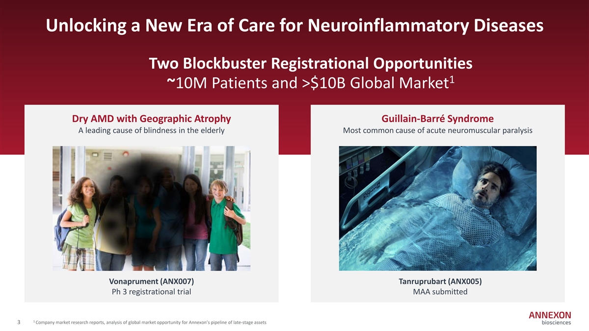 Unlocking a New Era of Care for Neuroinflammatory Diseases Two Blockbuster Registrational Opportunities 1 ~10M Patients and >$10B Global Market Dry AMD with Geographic Atrophy Guillain-Barré Syndrome A leading cause of blindness in the elderly Most common cause of acute neuromuscular paralysis Vonaprument (ANX007) Tanruprubart (ANX005) Ph 3 registrational trial MAA submitted 1 3 Company market research reports, analysis of global market opportunity for Annexon’s pipeline of late‐ stage assets