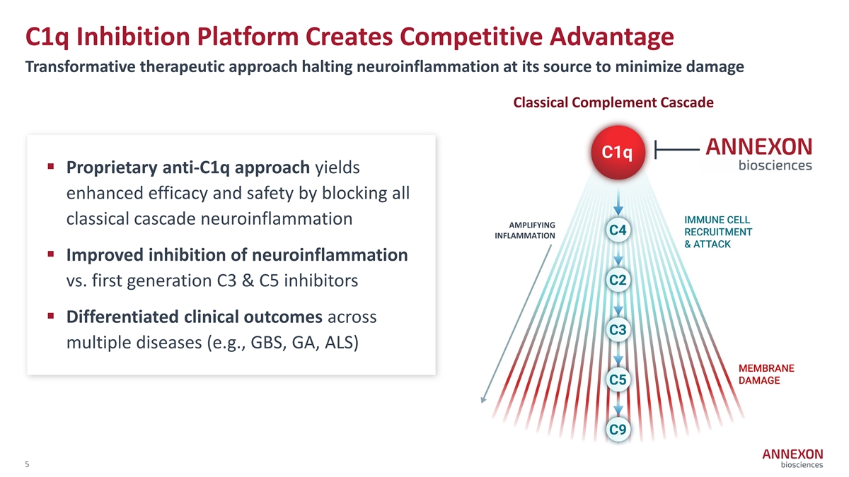 2026: A Pivotal Year of Potential Significant Value Creation Driving Value From Multiple Late-Stage Assets Clinically Validated Multiple Catalysts Well-positioned for C1q Platform in 2026 Market Development § Next gen targeted § Cash to fund anticipated key § Vonaprument (ANX007) Ph3 immunotherapies to halt milestones into late 2027 pivotal data neuroinflammation at the § Accelerating US medical § Tanruprubart (ANX005) source in diseases with limited education / pre‐ launch efforts EMA/FDA submissions or no approved therapies / potential partnering activities § ANX1502 proof-of-concept for § Diversified pipeline of drug first oral C1 inhibitor candidates for C1q‐ mediated neuroinflammatory diseases 4