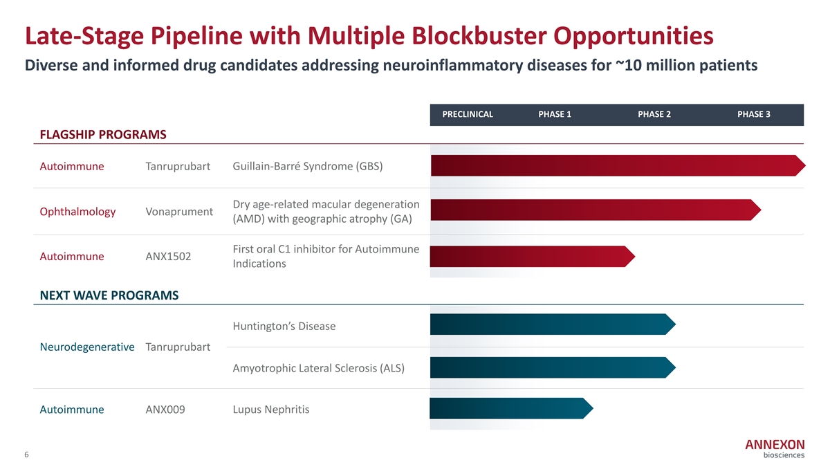 C1q Inhibition Platform Creates Competitive Advantage Transformative therapeutic approach halting neuroinflammation at its source to minimize damage Classical Complement Cascade § Proprietary anti-C1q approach yields enhanced efficacy and safety by blocking all classical cascade neuroinflammation AMPLIFYING INFLAMMATION § Improved inhibition of neuroinflammation vs. first generation C3 & C5 inhibitors § Differentiated clinical outcomes across multiple diseases (e.g., GBS, GA, ALS) 5