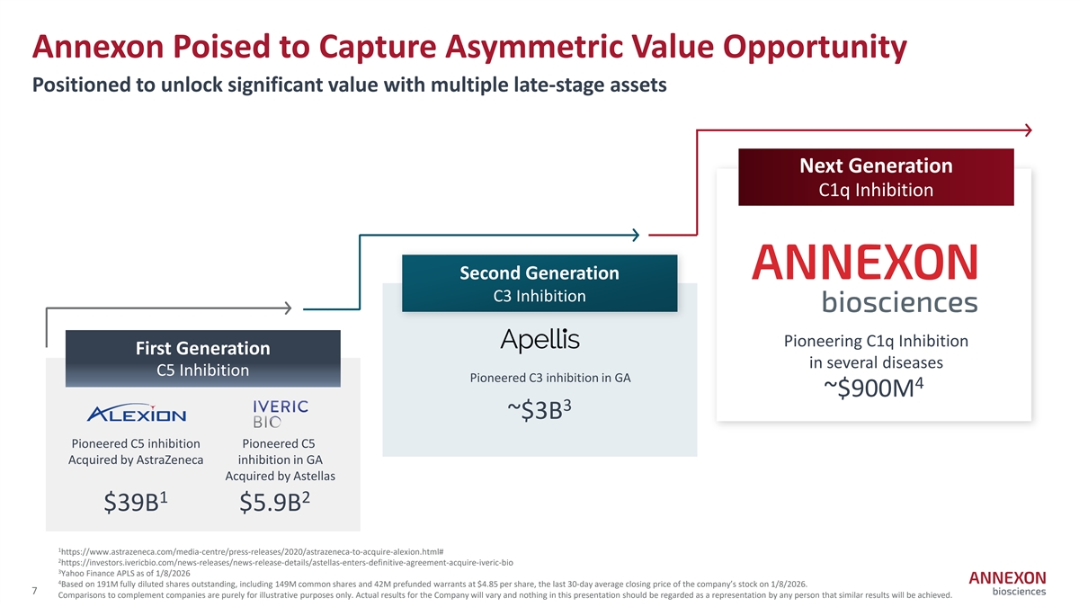 Annexon Poised to Capture Asymmetric Value Opportunity Positioned to unlock significant value with multiple late-stage assets Next Generation C1q Inhibition Second Generation C3 Inhibition Pioneering C1q Inhibition First Generation in several diseases C5 Inhibition Pioneered C3 inhibition in GA 4 ~$900M 3 ~$3B Pioneered C5 inhibition Pioneered C5 Acquired by AstraZeneca inhibition in GA Acquired by Astellas 1 2 $39B $5.9B 1 https://www.astrazeneca.com/media‐ centre/press‐ releases/2020/astrazeneca‐ to‐ acquire‐ alexion.html# 2 https://investors.ivericbio.com/news‐ releases/news‐ release‐ details/astellas‐ enters‐ definitive‐ agreement‐ acquire‐ iveric‐ bio 3 Yahoo Finance APLS as of 1/8/2026 4 Based on 191M fully diluted shares outstanding, including 149M common shares and 42M prefunded warrants at $4.85 per share, the last 30‐ day average closing price of the company’s stock on 1/8/2026. 7 Comparisons to complement companies are purely for illustrative purposes only. Actual results for the Company will vary and nothing in this presentation should be regarded as a representation by any person that similar results will be achieved.