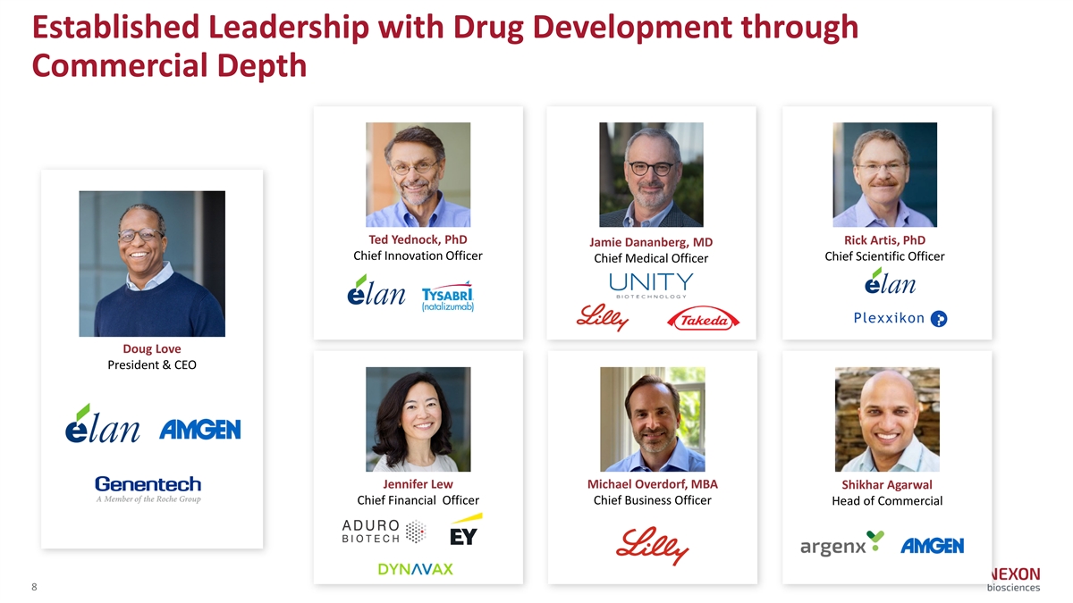 Established Leadership with Drug Development through Commercial Depth Ted Yednock, PhD Rick Artis, PhD Jamie Dananberg, MD Chief Innovation Officer Chief Scientific Officer Chief Medical Officer Doug Love President & CEO Jennifer Lew Michael Overdorf, MBA Shikhar Agarwal Chief Financial Officer Chief Business Officer Head of Commercial 8