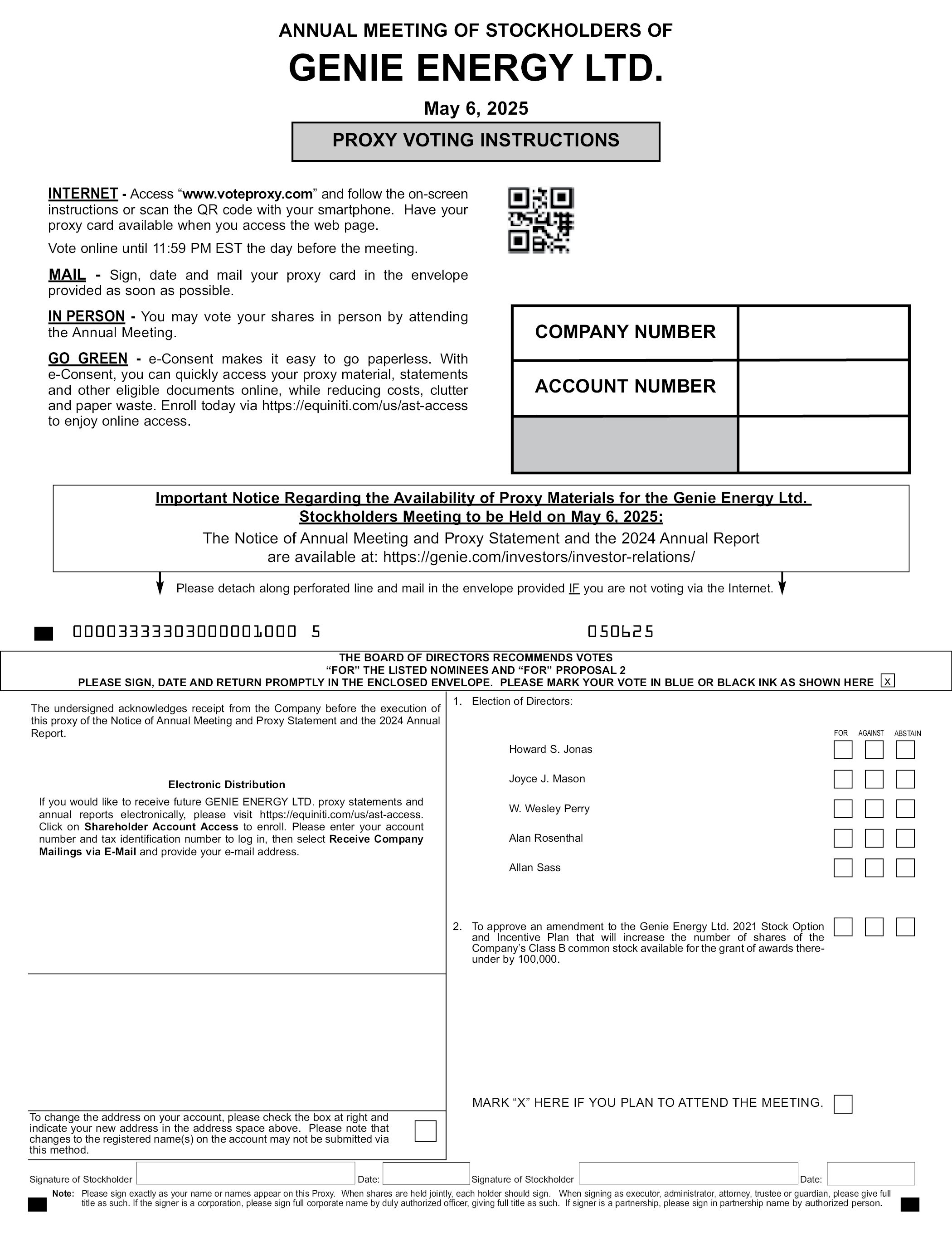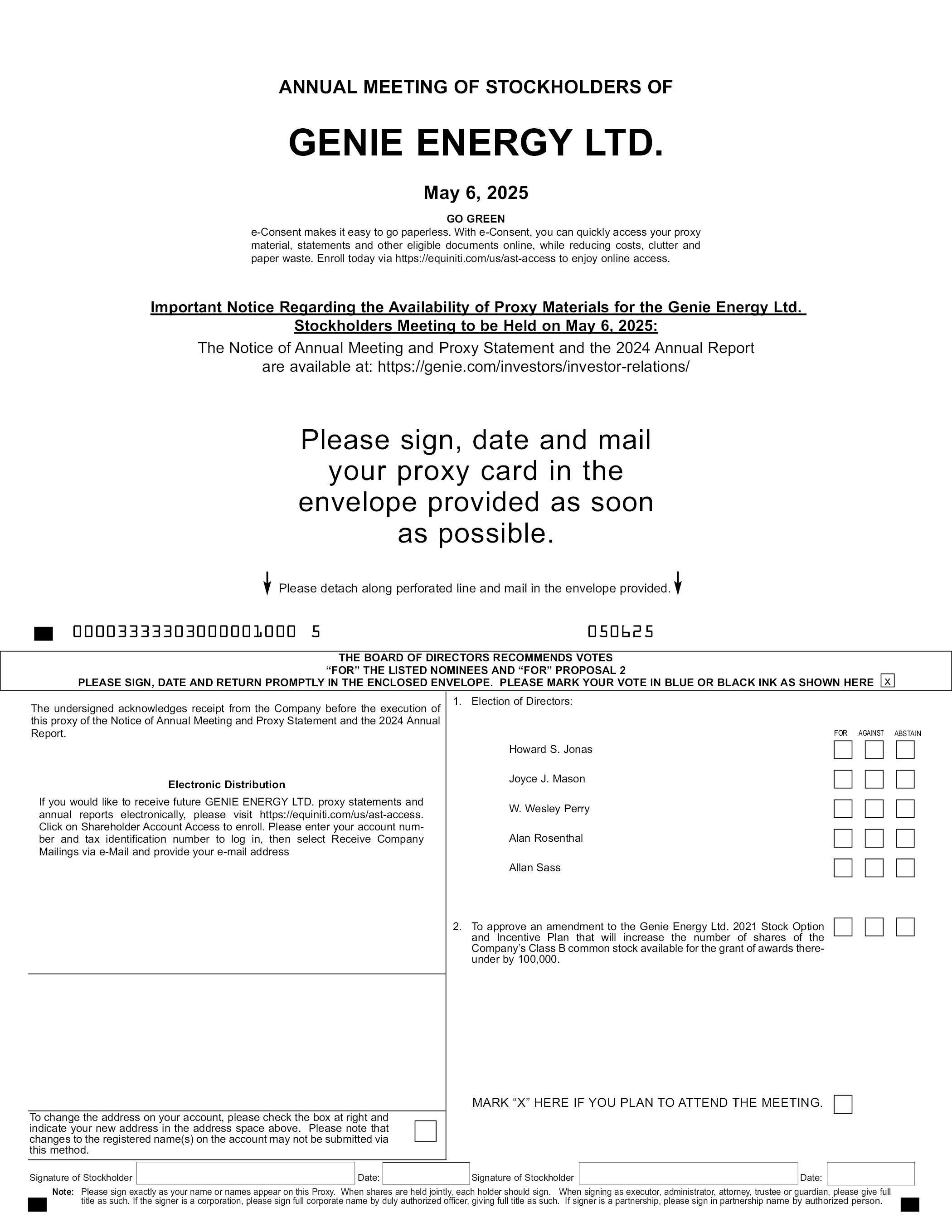 ANNUAL MEETING OF STOCKHOLDERS OF GENIE ENERGY LTD. May 6, 2025 GO GREEN e-Consent makes it easy to go paperless. With e-Consent, you can quickly access your proxy material, statements and other eligible documents online, while reducing costs, clutter and paper waste. Enroll today via https://equiniti.com/us/ast-access to enjoy online access. Important Notice Regarding the Availability of Proxy Materials for the Genie Energy Ltd. Stockholders Meeting to be Held on May 6, 2025: The Notice of Annual Meeting and Proxy Statement and the 2024 Annual Report are available at: https://genie.com/investors/investor-relations/ Please sign, date and mail your proxy card in the envelope provided as soon as possible. Please detach along perforated line and mail in the envelope provided. 00003333303000001000 5 050625 THE BOARD OF DIRECTORS RECOMMENDS VOTES “FOR” THE LISTED NOMINEES AND “FOR” PROPOSAL 2 PLEASE SIGN, DATE AND RETURN PROMPTLY IN THE ENCLOSED ENVELOPE. PLEASE MARK YOUR VOTE IN BLUE OR BLACK INK AS SHOWN HERE The undersigned acknowledges receipt from the Company before the execution of this proxy of the Notice of Annual Meeting and Proxy Statement and the 2024 Annual Report. Electronic Distribution If you would like to receive future GENIE ENERGY LTD. proxy statements and annual reports electronically, please visit https://equiniti.com/us/ast-access. Click on Shareholder Account Access to enroll. Please enter your account number and tax identification number to log in, then select Receive Company Mailings via e-Mail and provide your e-mail address To change the address on your account, please check the box at right and indicate your new address in the address space above. Please note that changes to the registered name(s) on the account may not be submitted via this method. 1. Election of Directors: Howard S. Jonas Joyce J. Mason W. Wesley Perry Alan Rosenthal Allan Sass 2. To approve an amendment to the Genie Energy Ltd. 2021 Stock Option and Incentive Plan that will increase the number of shares of the Company’s Class B common stock available for the grant of awards thereunder by 100,000. MARK “X” HERE IF YOU PLAN TO ATTEND THE MEETING. FOR AGAINST ABSTAIN Signature of Stockholder Date: Signature of Stockholder Date: Note: Please sign exactly as your name or names appear on this Proxy. When shares are held jointly, each holder should sign. When signing as executor, administrator, attorney, trustee or guardian, please give full title as such. If the signer is a corporation, please sign full corporate name by duly authorized officer, giving full title as such. If signer is a partnership, please sign in partnership name by authorized person.
