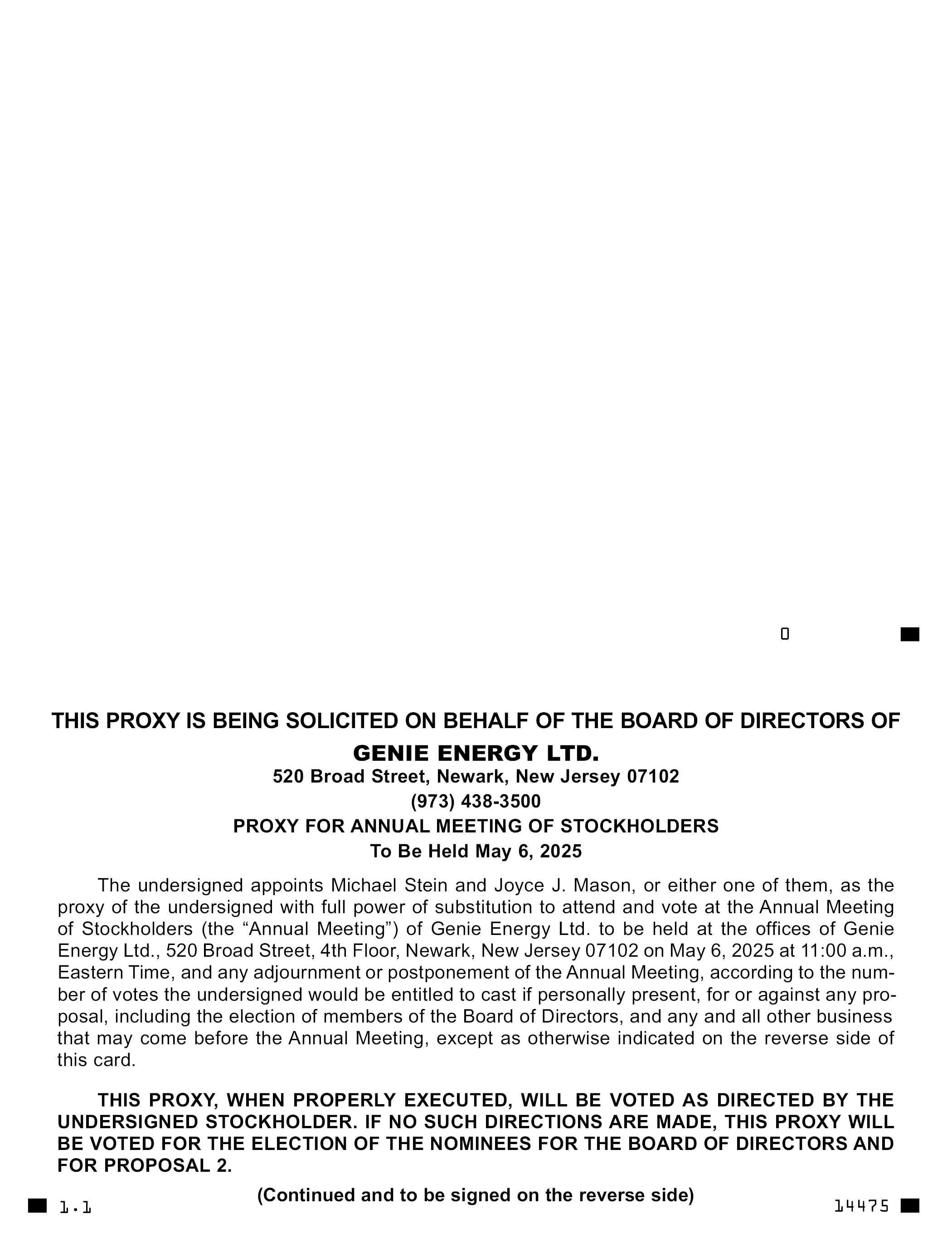 THIS PROXY IS BEING SOLICITED ON BEHALF OF THE BOARD OF DIRECTORS OF GENIE ENERGY LTD. 520 Broad Street, Newark, New Jersey 07102 (973) 438-3500 PROXY FOR ANNUAL MEETING OF STOCKHOLDERS To Be Held May 6, 2025 The undersigned appoints Michael Stein and Joyce J. Mason, or either one of them, as the proxy of the undersigned with full power of substitution to attend and vote at the Annual Meeting of Stockholders (the “Annual Meeting”) of Genie Energy Ltd. to be held at the offices of Genie Energy Ltd., 520 Broad Street, 4th Floor, Newark, New Jersey 07102 on May 6, 2025 at 11:00 a.m., Eastern Time, and any adjournment or postponement of the Annual Meeting, according to the number of votes the undersigned would be entitled to cast if personally present, for or against any proposal, including the election of members of the Board of Directors, and any and all other business that may come before the Annual Meeting, except as otherwise indicated on the reverse side of this card. THIS PROXY, WHEN PROPERLY EXECUTED, WILL BE VOTED AS DIRECTED BY THE UNDERSIGNED STOCKHOLDER. IF NO SUCH DIRECTIONS ARE MADE, THIS PROXY WILL BE VOTED FOR THE ELECTION OF THE NOMINEES FOR THE BOARD OF DIRECTORS AND FOR PROPOSAL 2. (Continued and to be signed on the reverse side) 1.1 14475