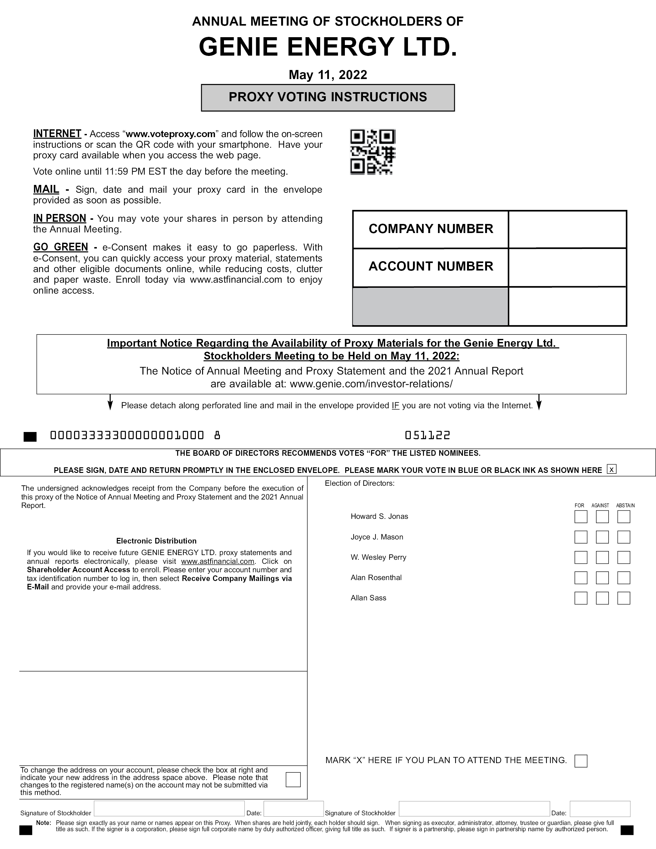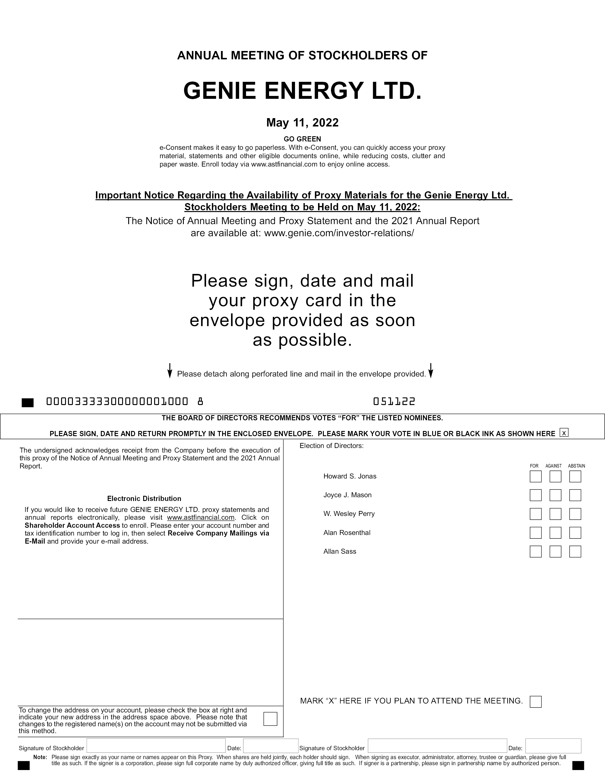 ANNUAL MEETING OF STOCKHOLDERS OF GENIE ENERGY LTD. May 11, 2022 GO GREEN e-Consent makes it easy to go paperless. With e-Consent, you can quickly access your proxy material, statements and other eligible documents online, while reducing costs, clutter and paper waste. Enroll today via www.astfinancial.com to enjoy online access. Important Notice Regarding the Availability of Proxy Materials for the Genie Energy Ltd. Stockholders Meeting to be Held on May 11, 2022: The Notice of Annual Meeting and Proxy Statement and the 2021 Annual Report are available at: www.genie.com/investor-relations/ Please sign, date and mail your proxy card in the envelope provided as soon as possible. Please detach along perforated line and mail in the envelope provided. 00003333300000001000 8 051122 THE BOARD OF DIRECTORS RECOMMENDS VOTES “FOR” THE LISTED NOMINEES. PLEASE SIGN, DATE AND RETURN PROMPTLY IN THE ENCLOSED ENVELOPE. PLEASE MARK YOUR VOTE IN BLUE OR BLACK INK AS SHOWN HERE x The undersigned acknowledges receipt from the Company before the execution of this proxy of the Notice of Annual Meeting and Proxy Statement and the 2021 Annual Report. Electronic Distribution If you would like to receive future GENIE ENERGY LTD. proxy statements and annual reports electronically, please visit www.astfinancial.com. Click on Shareholder Account Access to enroll. Please enter your account number and tax identification number to log in, then select Receive Company Mailings via E-Mail and provide your e-mail address. Election of Directors: Howard S. Jonas Joyce J. Mason W. Wesley Perry Alan Rosenthal Allan Sass To change the address on your account, please check the box at right and indicate your new address in the address space above. Please note that changes to the registered name(s) on the account may not be submitted via this method. MARK “X” HERE IF YOU PLAN TO ATTEND THE MEETING. Signature of Stockholder Date: Signature of Stockholder Date: Note: Please sign exactly as your name or names appear on this Proxy. When shares are held jointly, each holder should sign. When signing as executor, administrator, attorney, trustee or guardian, please give full title as such. If the signer is a corporation, please sign full corporate name by duly authorized officer, giving full title as such. If signer is a partnership, please sign in partnership name by authorized person