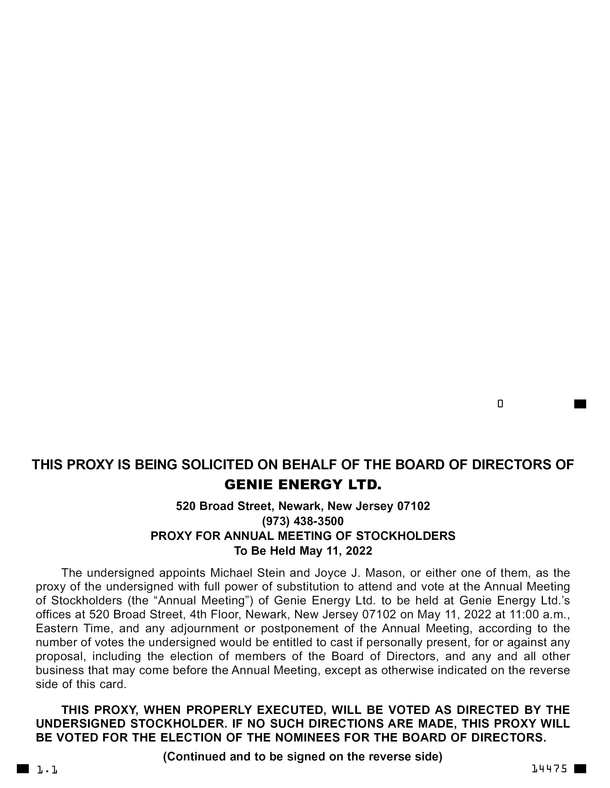 THIS PROXY IS BEING SOLICITED ON BEHALF OF THE BOARD OF DIRECTORS OF GENIE ENERGY LTD. 520 Broad Street, Newark, New Jersey 07102 (973) 438-3500 PROXY FOR ANNUAL MEETING OF STOCKHOLDERS To Be Held May 11, 2022 The undersigned appoints Michael Stein and Joyce J. Mason, or either one of them, as the proxy of the undersigned with full power of substitution to attend and vote at the Annual Meeting of Stockholders (the “Annual Meeting”) of Genie Energy Ltd. to be held at Genie Energy Ltd.’s offices at 520 Broad Street, 4th Floor, Newark, New Jersey 07102 on May 11, 2022 at 11:00 a.m., Eastern Time, and any adjournment or postponement of the Annual Meeting, according to the number of votes the undersigned would be entitled to cast if personally present, for or against any proposal, including the election of members of the Board of Directors, and any and all other business that may come before the Annual Meeting, except as otherwise indicated on the reverse side of this card. THIS PROXY, WHEN PROPERLY EXECUTED, WILL BE VOTED AS DIRECTED BY THE UNDERSIGNED STOCKHOLDER. IF NO SUCH DIRECTIONS ARE MADE, THIS PROXY WILL BE VOTED FOR THE ELECTION OF THE NOMINEES FOR THE BOARD OF DIRECTORS. (Continued and to be signed on the reverse side) 1.1 14475