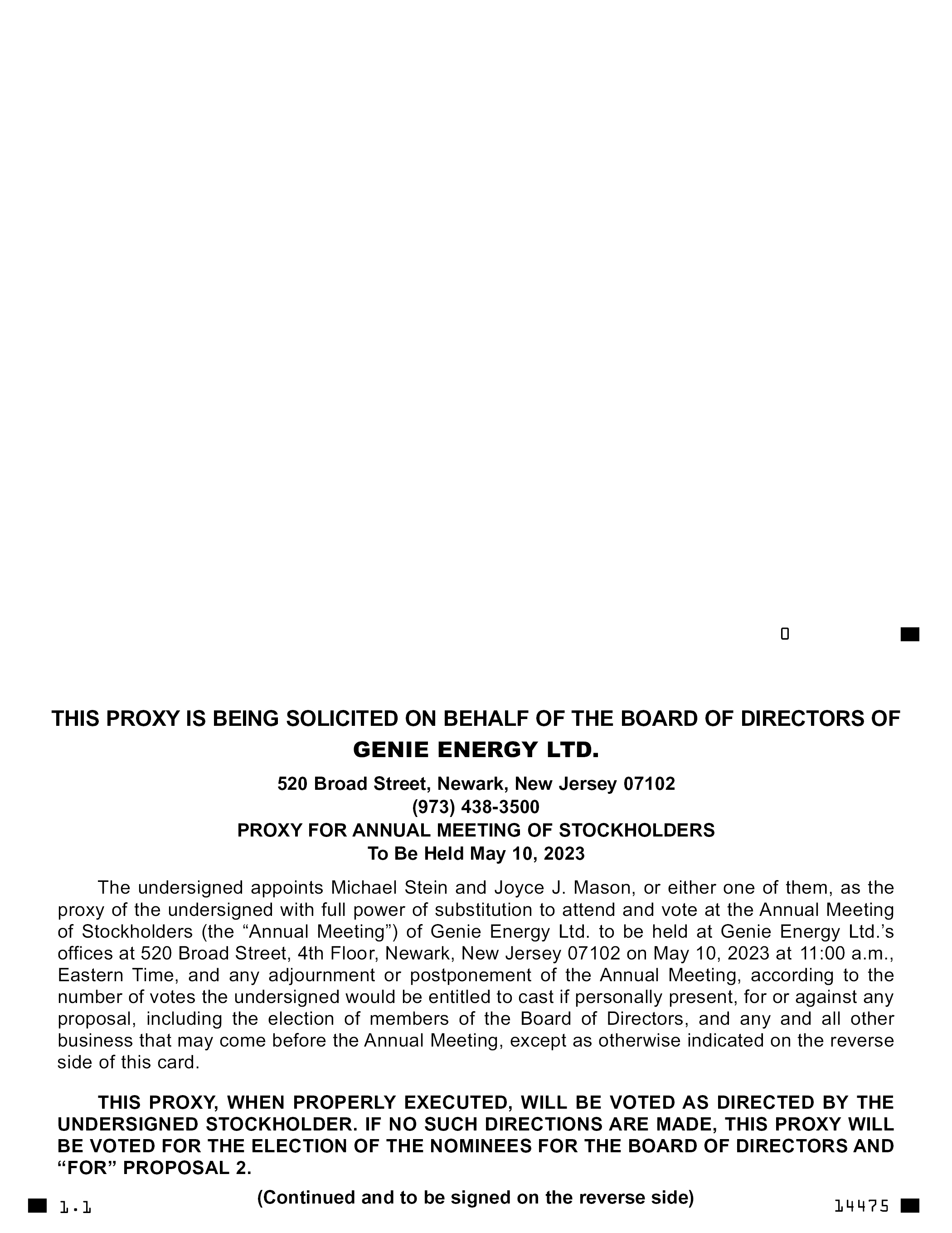 THIS PROXY IS BEING SOLICITED ON BEHALF OF THE BOARD OF DIRECTORS OF GENIE ENERGY LTD. 520 Broad Street, Newark, New Jersey 07102 (973) 438-3500 PROXY FOR ANNUAL MEETING OF STOCKHOLDERS To Be Held May 10, 2023 The undersigned appoints Michael Stein and Joyce J. Mason, or either one of them, as the proxy of the undersigned with full power of substitution to attend and vote at the Annual Meeting of Stockholders (the “Annual Meeting”) of Genie Energy Ltd. to be held at Genie Energy Ltd.’s offices at 520 Broad Street, 4th Floor, Newark, New Jersey 07102 on May 10, 2023 at 11:00 a.m., Eastern Time, and any adjournment or postponement of the Annual Meeting, according to the number of votes the undersigned would be entitled to cast if personally present, for or against any proposal, including the election of members of the Board of Directors, and any and all other business that may come before the Annual Meeting, except as otherwise indicated on the reverse side of this card. THIS PROXY, WHEN PROPERLY EXECUTED, WILL BE VOTED AS DIRECTED BY THE UNDERSIGNED STOCKHOLDER. IF NO SUCH DIRECTIONS ARE MADE, THIS PROXY WILL BE VOTED FOR THE ELECTION OF THE NOMINEES FOR THE BOARD OF DIRECTORS AND “FOR” PROPOSAL 2. (Continued and to be signed on 1.1 the reverse side)