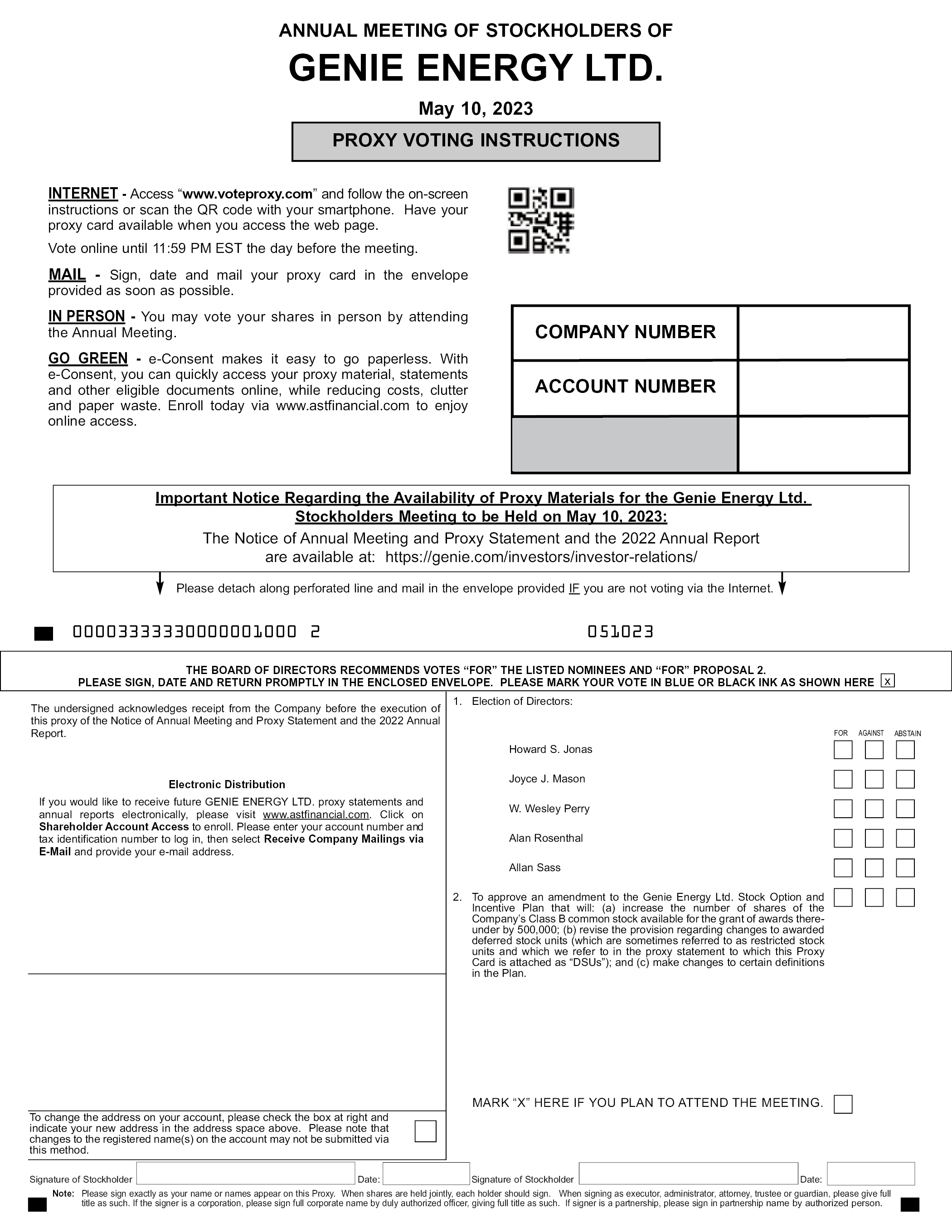 ANNUAL MEETING OF STOCKHOLDERS OF GENIE ENERGY LTD. May 10, 2023 GO GREEN e-Consent makes it easy to go paperless. With e-Consent, you can quickly access your proxy material, statements and other eligible documents online, while reducing costs, clutter and paper waste. Enroll today via www.astfinancial.com to enjoy online access. Important Notice Regarding the Availability of Proxy Materials for the Genie Energy Ltd. Stockholders Meeting to be Held on May 10, 2023: The Notice of Annual Meeting and Proxy Statement and the 2022 Annual Report are available at: https://genie.com/investors/investor-relations/ Please sign, date and mail your proxy card in the envelope provided as soon as possible. Please detach along perforated line and mail in the envelope provided. 00003333330000001000 2 051023 THE BOARD OF DIRECTORS RECOMMENDS VOTES “FOR” THE LISTED NOMINEES AND “FOR” PROPOSAL 2. PLEASE SIGN, DATE AND RETURN PROMPTLY IN THE ENCLOSED ENVELOPE. PLEASE MARK YOUR VOTE IN BLUE OR BLACK INK AS SHOWN HERE The undersigned acknowledges receipt from the Company before the execution of this proxy of the Notice of Annual Meeting and Proxy Statement and the 2022 Annual Report. Electronic Distribution If you would like to receive future GENIE ENERGY LTD. proxy statements and annual reports electronically, please visit www.astfinancial.com. Click on Shareholder Account Access to enroll. Please enter your account number and tax identification number to log in, then select Receive Company Mailings via E-Mail and provide your e-mail address. To change the address on your account, please check the box at right and indicate your new address in the address space above. Please note that changes to the registered name(s) on the account may not be submitted via this method. FOR AGAINST ABSTAIN Election of Directors: Howard S. Jonas Joyce J. Mason W. Wesley Perry Alan Rosenthal Allan Sass To approve an amendment to the Genie Energy Ltd. Stock Option and Incentive Plan that will: (a) increase the number of shares of the Company’s Class B common stock available for the grant of awards thereunder by 500,000; (b) revise the provision regarding changes to awarded deferred stock units (which are sometimes referred to as restricted stock units and which we refer to in the proxy statement to which this Proxy Card is attached as “DSUs”); and (c) make changes to certain definitions in the Plan. Signature of Stockholder Date: Signature of Stockholder Date: Note: Please sign exactly as your name or names appear on this Proxy. When shares are held jointly, each holder should sign. When signing as executor, administrator, attorney, trustee or guardian, please give full title as such. If the signer is a corporation, please sign full corporate name by duly authorized officer, giving full title as such. If signer is a partnership, please sign in partnership name by authorized person. MARK “X” HERE IF YOU PLAN TO ATTEND THE MEETING.