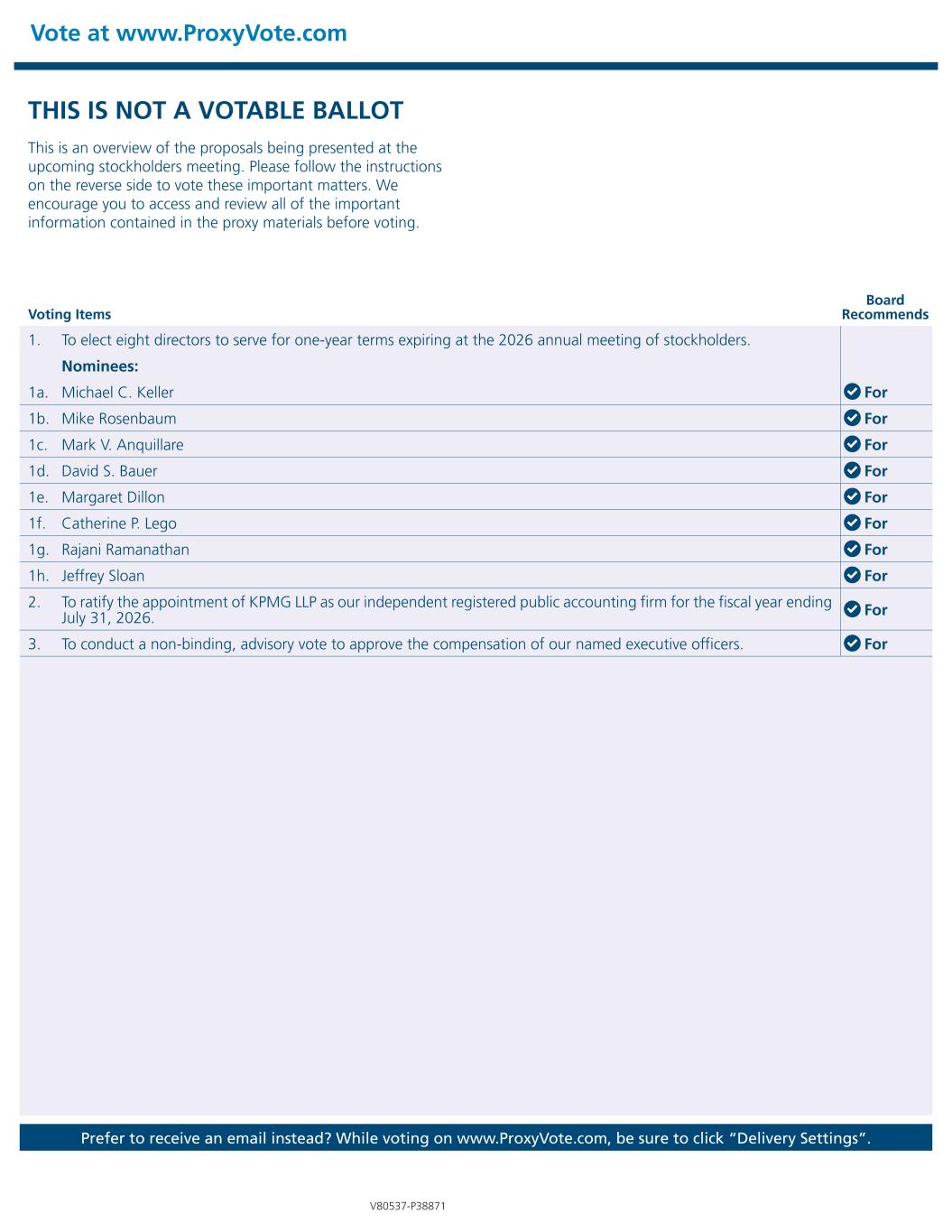 THIS IS NOT A VOTABLE BALLOT This is an overview of the proposals being presented at the upcoming stockholders meeting. Please follow the instructions on the reverse side to vote these important matters. We encourage you to access and review all of the important information contained in the proxy materials before voting. Vote at www.ProxyVote.com Prefer to receive an email instead? While voting on www.ProxyVote.com, be sure to click “Delivery Settings”. Voting Items Board Recommends V80537-P38871 1. To elect eight directors to serve for one-year terms expiring at the 2026 annual meeting of stockholders. Nominees: 1a. Michael C. Keller For 1b. Mike Rosenbaum For 1c. Mark V. Anquillare For 1d. David S. Bauer For 1e. Margaret Dillon For 1f. Catherine P. Lego For 1g. Rajani Ramanathan For 1h. Jeffrey Sloan For 2. To ratify the appointment of KPMG LLP as our independent registered public accounting firm for the fiscal year ending July 31, 2026. For 3. To conduct a non-binding, advisory vote to approve the compensation of our named executive officers. For
