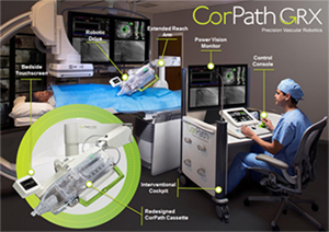 The CorPath GRX System enables the precise, robotic-assisted control of guide catheters, guidewires and balloon/stent devices from the safety of a radiation-shielded Interventional Cockpit. The CorPath GRX System consists of two components: a Bedside Unit and an Interventional Cockpit. The radiation-shielded Interventional Cockpit features a simple-to-use Control Console to precisely control the movement of guide catheters, guidewires, and balloon/stent catheters. Using joysticks and touch-screen controls, the physician is able to measure lengths of portions of anatomy to help in selecting the appropriate stent. At the Bedside Unit, the CorPath GRX System’s Robotic Drive and sterile, single-use cassette (“CorPath Cassette”) translate the physician’s commands into precise movements and manipulations of the guide catheters, guidewires, and balloon/stent catheters. The CorPath Cassette provides a single-use sterile interface with standard catheters, guidewires and devices. The CorPath GRX System empowers physicians with precise sub-millimeter measurement and 1mm advancement accuracy. By optimizing stent selection and positioning, the CorPath GRX System enables the deliberate advancement of devices, provides the ability to hold the guidewire and balloon/stent in place during device deployment and helps to ensure that there are no unintended wire/device movements during the procedure.