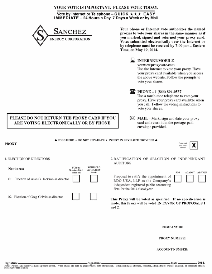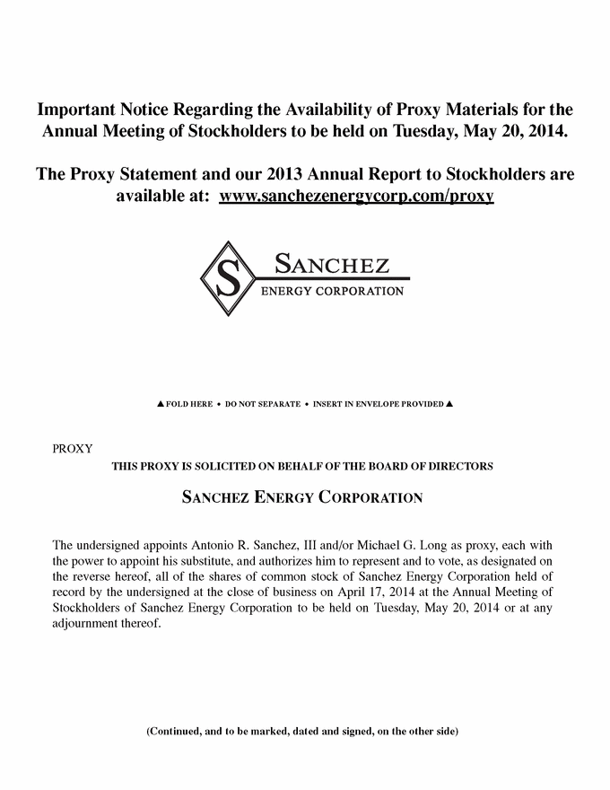 FOLD HERE • DO NOT SEPARATE • INSERT IN ENVELOPE PROVIDED THIS PROXY IS SOLICITED ON BEHALF OF THE BOARD OF DIRECTORS SANCHEZ ENERGY CORPORATION The undersigned appoints Antonio R. Sanchez, III and/or Michael G. Long as proxy, each with the power to appoint his substitute, and authorizes him to represent and to vote, as designated on the reverse hereof, all of the shares of common stock of Sanchez Energy Corporation held of record by the undersigned at the close of business on April 17, 2014 at the Annual Meeting of Stockholders of Sanchez Energy Corporation to be held on Tuesday, May 20, 2014 or at any adjournment thereof. (Continued, and to be marked, dated and signed, on the other side) PROXY Important Notice Regarding the Availability of Proxy Materials for the Annual Meeting of Stockholders to be held on Tuesday, May 20, 2014. The Proxy Statement and our 2013 Annual Report to Stockholders are available at: www.sanchezenergycorp.com/proxy |