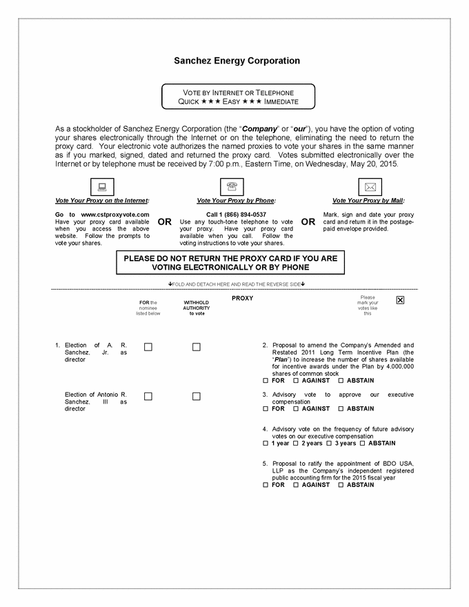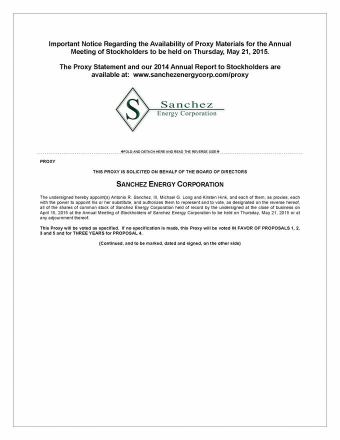 Important Notice Regarding the Availability of Proxy Materials for the Annual Meeting of Stockholders to be held on Thursday, May 21, 2015. The Proxy Statement and our 2014 Annual Report to Stockholders are available at: www.sanchezenergycorp.com/proxy .FOLD AND DETACH HERE AND READ THE REVERSE SIDE. PROXY THIS PROXY IS SOLICITED ON BEHALF OF THE BOARD OF DIRECTORS SANCHEZ ENERGY CORPORATION The undersigned hereby appoint(s) Antonio R. Sanchez, III, Michael G. Long and Kirsten Hink, and each of them, as proxies, each with the power to appoint his or her substitute, and authorizes them to represent and to vote, as designated on the reverse hereof, all of the shares of common stock of Sanchez Energy Corporation held of record by the undersigned at the close of business on April 15, 2015 at the Annual Meeting of Stockholders of Sanchez Energy Corporation to be held on Thursday, May 21, 2015 or at any adjournment thereof. This Proxy will be voted as specified. If no specification is made, this Proxy will be voted IN FAVOR OF PROPOSALS 1, 2, 3 and 5 and for THREE YEARS for PROPOSAL 4. (Continued, and to be marked, dated and signed, on the other side) |