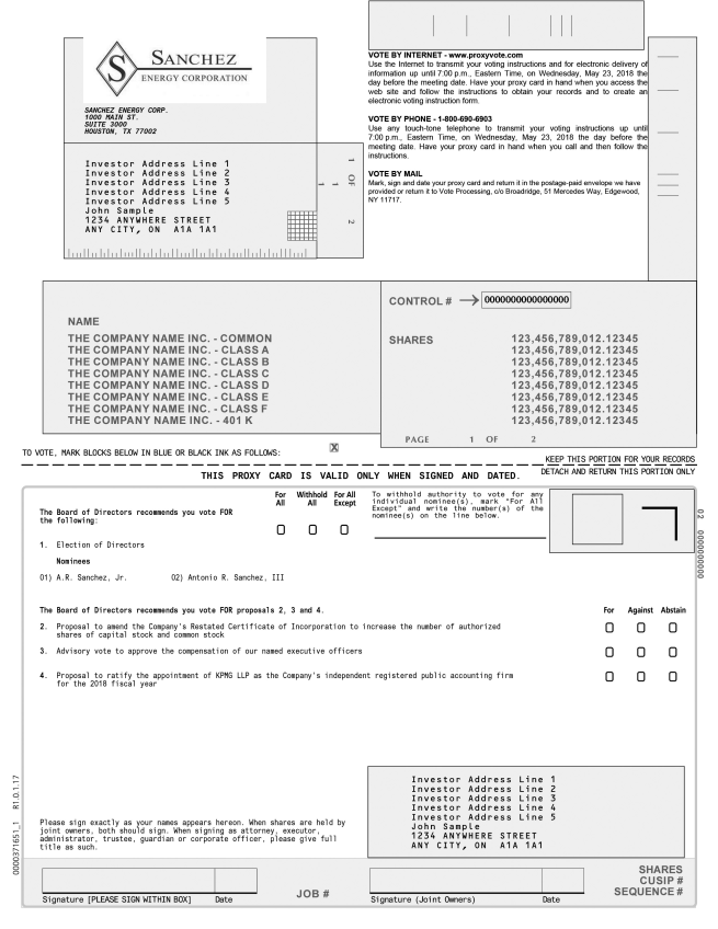 1234567 123,456,789,012.12345 TO VOTE, MARK BLOCKS BELOW IN BLUE OR BLACK INK AS FOLLOWS: KEEP THIS PORTION FOR YOUR RECORDS DETACH AND RETURN THIS PORTION ONLY THIS PROXY CARD IS VALID ONLY WHEN SIGNED AND DATED. For Withhold AllAll For All Except To withhold authority to vote for any individual nominee(s), mark “For All Except” and write the number(s) of the The Board of Directors recommends you vote FOR the following: nominee(s) on the line below. 0 0 0 1. Election of Directors Nominees 01) A.R. Sanchez, Jr. 02) Antonio R. Sanchez, III The Board of Directors recommends you vote FOR proposals 2, 3 and 4. For 0 0 0 Against 0 0 0 Abstain 0 0 0 2. Proposal to amend the Company's Restated Certificate of Incorporation to increase the number of authorized shares of capital stock and common stock Advisory vote to approve the compensation of our named executive officers 3. 4. Proposal to ratify the appointment of KPMG LLP as the Company's independent registered public accounting firm for the 2018 fiscal year John Sample joint owners, both should sign. When signing as attorney, executor, ANY CITY, ONA1A 1A1 Signature [PLEASE SIGN WITHIN BOX] Date Signature (Joint Owners) Date 02 0000000000 1 OF 1 1 2 0000371651_1 R1.0.1.17 Please sign exactly as your names appears hereon. When shares are held by administrator, trustee, guardian or corporate officer, please give full title as such. Investor Address Line 1 Investor Address Line 2 Investor Address Line 3 Investor Address Line 4 Investor Address Line 5 1234 ANYWHERE STREET SHARES CUSIP # JOB #SEQUENCE # VOTE BY INTERNET - www.proxyvote.com Use the Internet to transmit your voting instructions and for electronic delivery of information up until 7:00 p.m., Eastern Time, on Wednesday, May 23, 2018 the day before the meeting date. Have your proxy card in hand when you access the web site and follow the instructions to obtain your records and to create an electronic voting instruction form. VOTE BY PHONE - 1-800-690-6903 Use any touch-tone telephone to transmit your voting instructions up until 7:00 p.m., Eastern Time, on Wednesday, May 23, 2018 the day before the meeting date. Have your proxy card in hand when you call and then follow the instructions. VOTE BY MAIL Mark, sign and date your proxy card and return it in the postage-paid envelope we have provided or return it to Vote Processing, c/o Broadridge, 51 Mercedes Way, Edgewood, NY 11717. John Sample234567 234567 1234567 NAME THE COMPANY NAME INC. - COMMON THE COMPANY NAME INC. - CLASS A THE COMPANY NAME INC. - CLASS B THE COMPANY NAME INC. - CLASS C THE COMPANY NAME INC. - CLASS D THE COMPANY NAME INC. - CLASS E THE COMPANY NAME INC. - CLASS F THE COMPA N Y NAME INC. - 401 K CONTROL # SHARES123,456,789,012.12345 123,456,789,012.12345 123,456,789,012.12345 123,456,789,012.12345 123,456,789,012.12345 123,456,789,012.12345 123,456,789,012.12345 x PAGE1 OF 2 SANCHEZ ENERGY CORP. 1000 MAIN ST. SUITE 3000 HOUSTON, TX 77002 Investor Address Line 1 Investor Address Line 2 Investor Address Line 3 Investor Address Line 4 Investor Address Line 5 8 8 8 1 1234 ANYWHERE STREET ANY CITY, ONA1A 1A1 234567 234567 234567