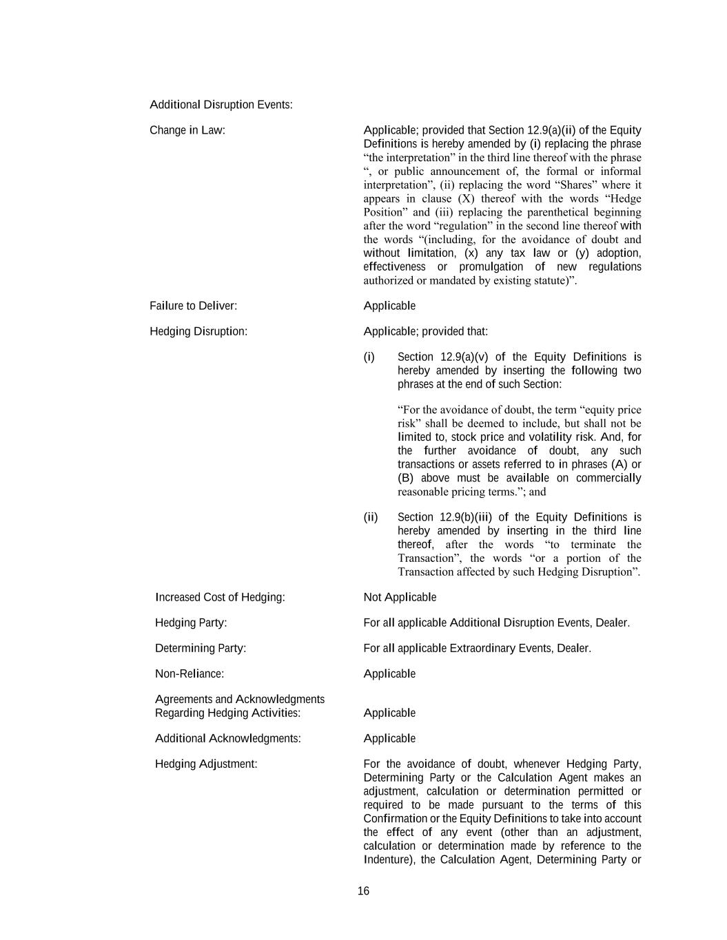 16 Additional Disruption Events: Change in Law: Applicable; provided that Section 12.9(a)(ii) of the Equity Definitions is hereby amended by (i) replacing the phrase “the interpretation” in the third line thereof with the phrase “, or public announcement of, the formal or informal interpretation”, (ii) replacing the word “Shares” where it appears in clause (X) thereof with the words “Hedge Position” and (iii) replacing the parenthetical beginning after the word “regulation” in the second line thereof with the words “(including, for the avoidance of doubt and without limitation, (x) any tax law or (y) adoption, effectiveness or promulgation of new regulations authorized or mandated by existing statute)”. Failure to Deliver: Applicable Hedging Disruption: Applicable; provided that: (i) Section 12.9(a)(v) of the Equity Definitions is hereby amended by inserting the following two phrases at the end of such Section: “For the avoidance of doubt, the term “equity price risk” shall be deemed to include, but shall not be limited to, stock price and volatility risk. And, for the further avoidance of doubt, any such transactions or assets referred to in phrases (A) or (B) above must be available on commercially reasonable pricing terms.”; and (ii) Section 12.9(b)(iii) of the Equity Definitions is hereby amended by inserting in the third line thereof, after the words “to terminate the Transaction”, the words “or a portion of the Transaction affected by such Hedging Disruption”. Increased Cost of Hedging: Not Applicable Hedging Party: For all applicable Additional Disruption Events, Dealer. Determining Party: For all applicable Extraordinary Events, Dealer. Non-Reliance: Applicable Agreements and Acknowledgments Regarding Hedging Activities: Applicable Additional Acknowledgments: Applicable Hedging Adjustment: For the avoidance of doubt, whenever Hedging Party, Determining Party or the Calculation Agent makes an adjustment, calculation or determination permitted or required to be made pursuant to the terms of this Confirmation or the Equity Definitions to take into account the effect of any event (other than an adjustment, calculation or determination made by reference to the Indenture), the Calculation Agent, Determining Party or