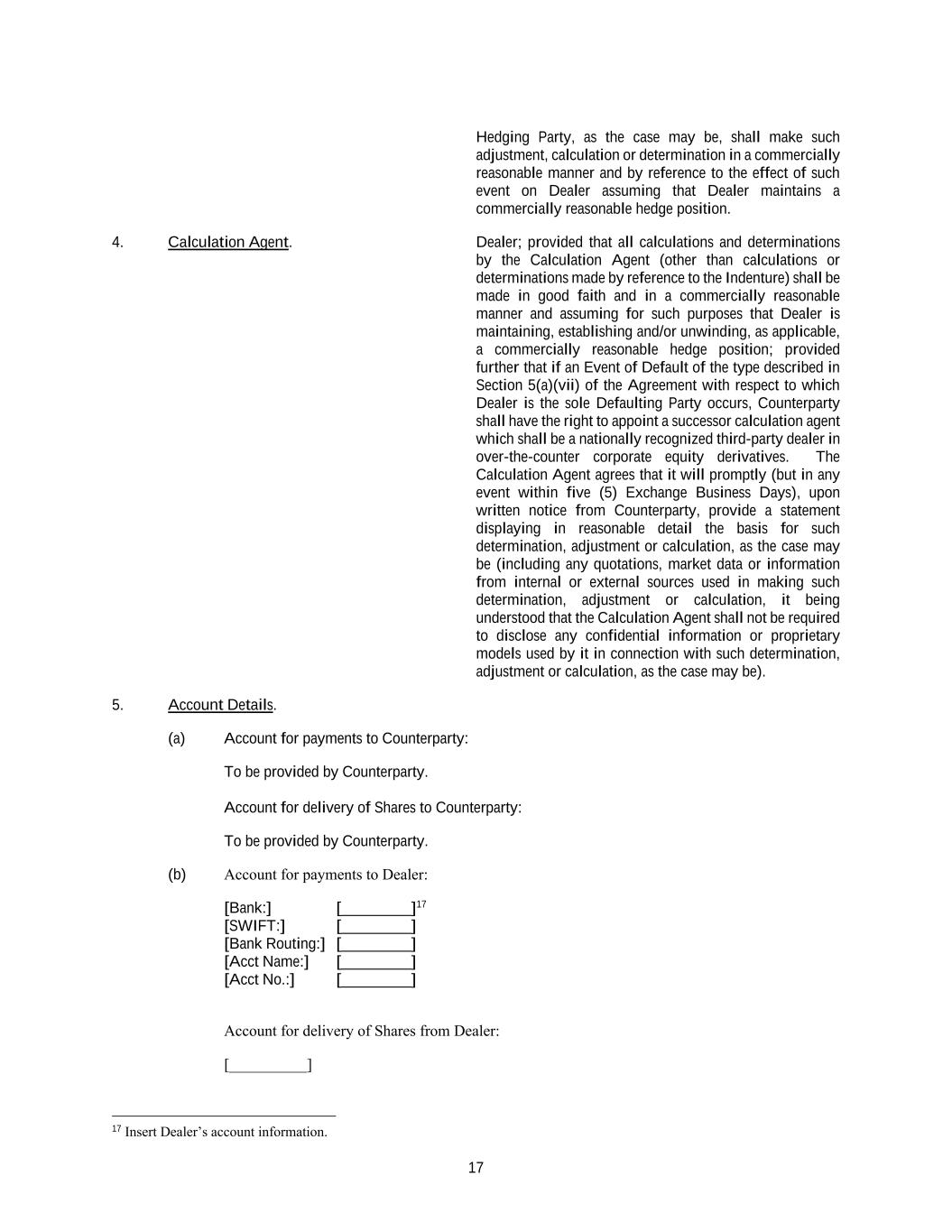 17 Hedging Party, as the case may be, shall make such adjustment, calculation or determination in a commercially reasonable manner and by reference to the effect of such event on Dealer assuming that Dealer maintains a commercially reasonable hedge position. 4. Calculation Agent. Dealer; provided that all calculations and determinations by the Calculation Agent (other than calculations or determinations made by reference to the Indenture) shall be made in good faith and in a commercially reasonable manner and assuming for such purposes that Dealer is maintaining, establishing and/or unwinding, as applicable, a commercially reasonable hedge position; provided further that if an Event of Default of the type described in Section 5(a)(vii) of the Agreement with respect to which Dealer is the sole Defaulting Party occurs, Counterparty shall have the right to appoint a successor calculation agent which shall be a nationally recognized third-party dealer in over-the-counter corporate equity derivatives. The Calculation Agent agrees that it will promptly (but in any event within five (5) Exchange Business Days), upon written notice from Counterparty, provide a statement displaying in reasonable detail the basis for such determination, adjustment or calculation, as the case may be (including any quotations, market data or information from internal or external sources used in making such determination, adjustment or calculation, it being understood that the Calculation Agent shall not be required to disclose any confidential information or proprietary models used by it in connection with such determination, adjustment or calculation, as the case may be). 5. Account Details. (a) Account for payments to Counterparty: To be provided by Counterparty. Account for delivery of Shares to Counterparty: To be provided by Counterparty. (b) Account for payments to Dealer: [Bank:] [_________]17 [SWIFT:] [_________] [Bank Routing:] [_________] [Acct Name:] [_________] [Acct No.:] [_________] Account for delivery of Shares from Dealer: [__________] 17 Insert Dealer’s account information.