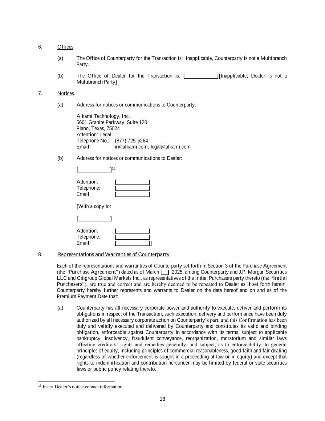 18 6. Offices. (a) The Office of Counterparty for the Transaction is: Inapplicable, Counterparty is not a Multibranch Party. (b) The Office of Dealer for the Transaction is: [____________][Inapplicable; Dealer is not a Multibranch Party] 7. Notices. (a) Address for notices or communications to Counterparty: Alkami Technology, Inc. 5601 Granite Parkway, Suite 120 Plano, Texas, 75024 Attention: Legal Telephone No.: (877) 725-5264 Email: ir@alkami.com; legal@alkami.com (b) Address for notices or communications to Dealer: [____________]18 Attention: [____________] Telephone: [____________] Email: [____________] [With a copy to: [____________] Attention: [____________] Telephone: [____________] Email: [____________]] 8. Representations and Warranties of Counterparty. Each of the representations and warranties of Counterparty set forth in Section 3 of the Purchase Agreement (the “Purchase Agreement”) dated as of March [__], 2025, among Counterparty and J.P. Morgan Securities LLC and Citigroup Global Markets Inc., as representatives of the Initial Purchasers party thereto (the “Initial Purchasers”), are true and correct and are hereby deemed to be repeated to Dealer as if set forth herein. Counterparty hereby further represents and warrants to Dealer on the date hereof and on and as of the Premium Payment Date that: (a) Counterparty has all necessary corporate power and authority to execute, deliver and perform its obligations in respect of the Transaction; such execution, delivery and performance have been duly authorized by all necessary corporate action on Counterparty’s part; and this Confirmation has been duly and validly executed and delivered by Counterparty and constitutes its valid and binding obligation, enforceable against Counterparty in accordance with its terms, subject to applicable bankruptcy, insolvency, fraudulent conveyance, reorganization, moratorium and similar laws affecting creditors’ rights and remedies generally, and subject, as to enforceability, to general principles of equity, including principles of commercial reasonableness, good faith and fair dealing (regardless of whether enforcement is sought in a proceeding at law or in equity) and except that rights to indemnification and contribution hereunder may be limited by federal or state securities laws or public policy relating thereto. 18 Insert Dealer’s notice contact information.