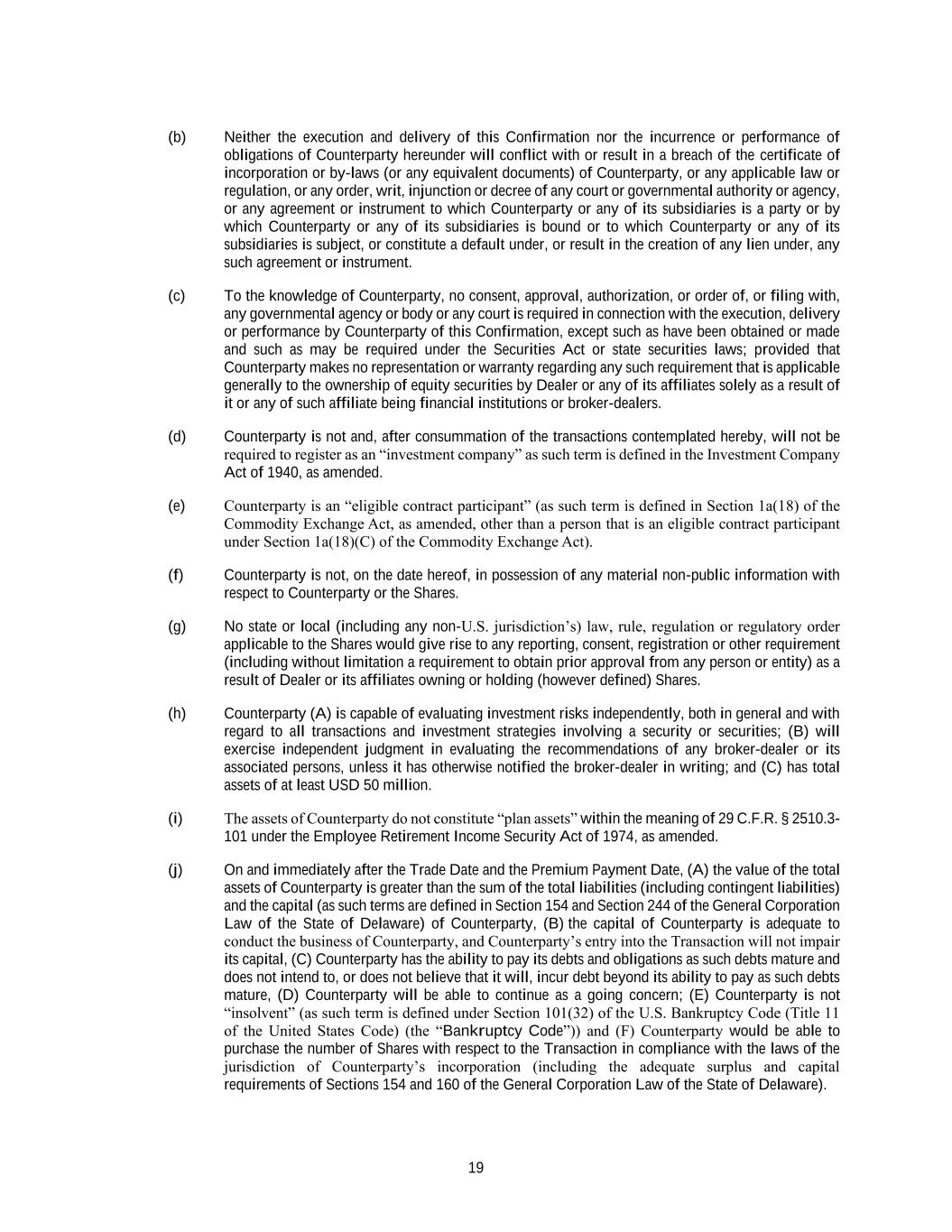 19 (b) Neither the execution and delivery of this Confirmation nor the incurrence or performance of obligations of Counterparty hereunder will conflict with or result in a breach of the certificate of incorporation or by-laws (or any equivalent documents) of Counterparty, or any applicable law or regulation, or any order, writ, injunction or decree of any court or governmental authority or agency, or any agreement or instrument to which Counterparty or any of its subsidiaries is a party or by which Counterparty or any of its subsidiaries is bound or to which Counterparty or any of its subsidiaries is subject, or constitute a default under, or result in the creation of any lien under, any such agreement or instrument. (c) To the knowledge of Counterparty, no consent, approval, authorization, or order of, or filing with, any governmental agency or body or any court is required in connection with the execution, delivery or performance by Counterparty of this Confirmation, except such as have been obtained or made and such as may be required under the Securities Act or state securities laws; provided that Counterparty makes no representation or warranty regarding any such requirement that is applicable generally to the ownership of equity securities by Dealer or any of its affiliates solely as a result of it or any of such affiliate being financial institutions or broker-dealers. (d) Counterparty is not and, after consummation of the transactions contemplated hereby, will not be required to register as an “investment company” as such term is defined in the Investment Company Act of 1940, as amended. (e) Counterparty is an “eligible contract participant” (as such term is defined in Section 1a(18) of the Commodity Exchange Act, as amended, other than a person that is an eligible contract participant under Section 1a(18)(C) of the Commodity Exchange Act). (f) Counterparty is not, on the date hereof, in possession of any material non-public information with respect to Counterparty or the Shares. (g) No state or local (including any non-U.S. jurisdiction’s) law, rule, regulation or regulatory order applicable to the Shares would give rise to any reporting, consent, registration or other requirement (including without limitation a requirement to obtain prior approval from any person or entity) as a result of Dealer or its affiliates owning or holding (however defined) Shares. (h) Counterparty (A) is capable of evaluating investment risks independently, both in general and with regard to all transactions and investment strategies involving a security or securities; (B) will exercise independent judgment in evaluating the recommendations of any broker-dealer or its associated persons, unless it has otherwise notified the broker-dealer in writing; and (C) has total assets of at least USD 50 million. (i) The assets of Counterparty do not constitute “plan assets” within the meaning of 29 C.F.R. § 2510.3- 101 under the Employee Retirement Income Security Act of 1974, as amended. (j) On and immediately after the Trade Date and the Premium Payment Date, (A) the value of the total assets of Counterparty is greater than the sum of the total liabilities (including contingent liabilities) and the capital (as such terms are defined in Section 154 and Section 244 of the General Corporation Law of the State of Delaware) of Counterparty, (B) the capital of Counterparty is adequate to conduct the business of Counterparty, and Counterparty’s entry into the Transaction will not impair its capital, (C) Counterparty has the ability to pay its debts and obligations as such debts mature and does not intend to, or does not believe that it will, incur debt beyond its ability to pay as such debts mature, (D) Counterparty will be able to continue as a going concern; (E) Counterparty is not “insolvent” (as such term is defined under Section 101(32) of the U.S. Bankruptcy Code (Title 11 of the United States Code) (the “Bankruptcy Code”)) and (F) Counterparty would be able to purchase the number of Shares with respect to the Transaction in compliance with the laws of the jurisdiction of Counterparty’s incorporation (including the adequate surplus and capital requirements of Sections 154 and 160 of the General Corporation Law of the State of Delaware).