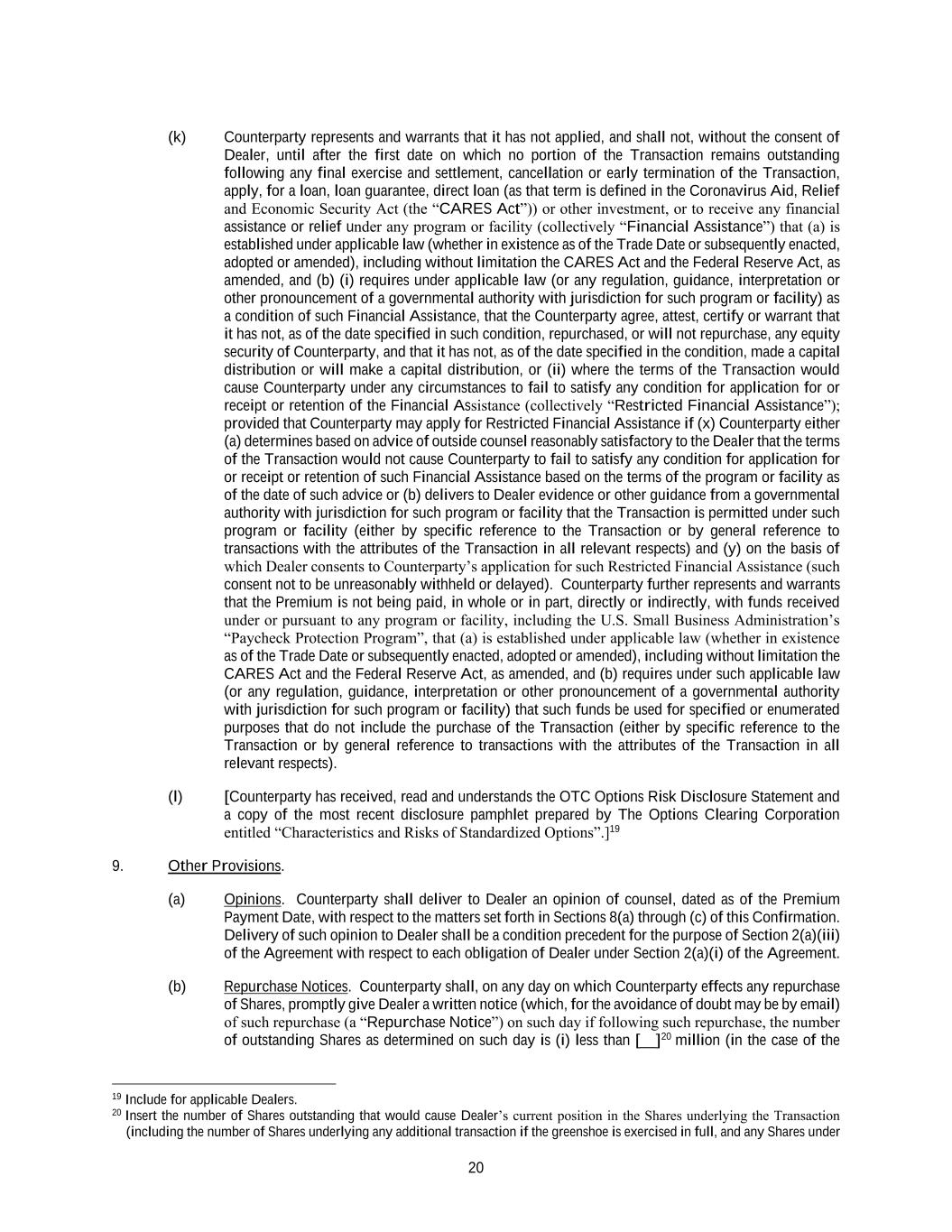 20 (k) Counterparty represents and warrants that it has not applied, and shall not, without the consent of Dealer, until after the first date on which no portion of the Transaction remains outstanding following any final exercise and settlement, cancellation or early termination of the Transaction, apply, for a loan, loan guarantee, direct loan (as that term is defined in the Coronavirus Aid, Relief and Economic Security Act (the “CARES Act”)) or other investment, or to receive any financial assistance or relief under any program or facility (collectively “Financial Assistance”) that (a) is established under applicable law (whether in existence as of the Trade Date or subsequently enacted, adopted or amended), including without limitation the CARES Act and the Federal Reserve Act, as amended, and (b) (i) requires under applicable law (or any regulation, guidance, interpretation or other pronouncement of a governmental authority with jurisdiction for such program or facility) as a condition of such Financial Assistance, that the Counterparty agree, attest, certify or warrant that it has not, as of the date specified in such condition, repurchased, or will not repurchase, any equity security of Counterparty, and that it has not, as of the date specified in the condition, made a capital distribution or will make a capital distribution, or (ii) where the terms of the Transaction would cause Counterparty under any circumstances to fail to satisfy any condition for application for or receipt or retention of the Financial Assistance (collectively “Restricted Financial Assistance”); provided that Counterparty may apply for Restricted Financial Assistance if (x) Counterparty either (a) determines based on advice of outside counsel reasonably satisfactory to the Dealer that the terms of the Transaction would not cause Counterparty to fail to satisfy any condition for application for or receipt or retention of such Financial Assistance based on the terms of the program or facility as of the date of such advice or (b) delivers to Dealer evidence or other guidance from a governmental authority with jurisdiction for such program or facility that the Transaction is permitted under such program or facility (either by specific reference to the Transaction or by general reference to transactions with the attributes of the Transaction in all relevant respects) and (y) on the basis of which Dealer consents to Counterparty’s application for such Restricted Financial Assistance (such consent not to be unreasonably withheld or delayed). Counterparty further represents and warrants that the Premium is not being paid, in whole or in part, directly or indirectly, with funds received under or pursuant to any program or facility, including the U.S. Small Business Administration’s “Paycheck Protection Program”, that (a) is established under applicable law (whether in existence as of the Trade Date or subsequently enacted, adopted or amended), including without limitation the CARES Act and the Federal Reserve Act, as amended, and (b) requires under such applicable law (or any regulation, guidance, interpretation or other pronouncement of a governmental authority with jurisdiction for such program or facility) that such funds be used for specified or enumerated purposes that do not include the purchase of the Transaction (either by specific reference to the Transaction or by general reference to transactions with the attributes of the Transaction in all relevant respects). (l) [Counterparty has received, read and understands the OTC Options Risk Disclosure Statement and a copy of the most recent disclosure pamphlet prepared by The Options Clearing Corporation entitled “Characteristics and Risks of Standardized Options”.]19 9. Other Provisions. (a) Opinions. Counterparty shall deliver to Dealer an opinion of counsel, dated as of the Premium Payment Date, with respect to the matters set forth in Sections 8(a) through (c) of this Confirmation. Delivery of such opinion to Dealer shall be a condition precedent for the purpose of Section 2(a)(iii) of the Agreement with respect to each obligation of Dealer under Section 2(a)(i) of the Agreement. (b) Repurchase Notices. Counterparty shall, on any day on which Counterparty effects any repurchase of Shares, promptly give Dealer a written notice (which, for the avoidance of doubt may be by email) of such repurchase (a “Repurchase Notice”) on such day if following such repurchase, the number of outstanding Shares as determined on such day is (i) less than [__]20 million (in the case of the 19 Include for applicable Dealers. 20 Insert the number of Shares outstanding that would cause Dealer’s current position in the Shares underlying the Transaction (including the number of Shares underlying any additional transaction if the greenshoe is exercised in full, and any Shares under