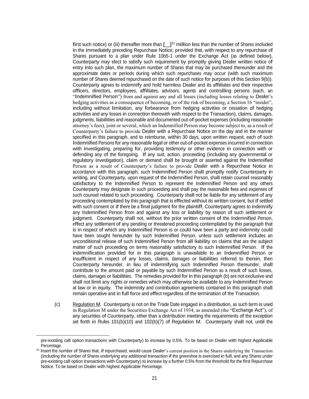 21 first such notice) or (ii) thereafter more than [__]21 million less than the number of Shares included in the immediately preceding Repurchase Notice; provided that, with respect to any repurchase of Shares pursuant to a plan under Rule 10b5-1 under the Exchange Act (as defined below), Counterparty may elect to satisfy such requirement by promptly giving Dealer written notice of entry into such plan, the maximum number of Shares that may be purchased thereunder and the approximate dates or periods during which such repurchases may occur (with such maximum number of Shares deemed repurchased on the date of such notice for purposes of this Section 9(b)). Counterparty agrees to indemnify and hold harmless Dealer and its affiliates and their respective officers, directors, employees, affiliates, advisors, agents and controlling persons (each, an “Indemnified Person”) from and against any and all losses (including losses relating to Dealer’s hedging activities as a consequence of becoming, or of the risk of becoming, a Section 16 “insider”, including without limitation, any forbearance from hedging activities or cessation of hedging activities and any losses in connection therewith with respect to the Transaction), claims, damages, judgments, liabilities and reasonable and documented out-of-pocket expenses (including reasonable attorney’s fees), joint or several, which an Indemnified Person may become subject to, as a result of Counterparty’s failure to provide Dealer with a Repurchase Notice on the day and in the manner specified in this paragraph, and to reimburse, within 30 days, upon written request, each of such Indemnified Persons for any reasonable legal or other out-of-pocket expenses incurred in connection with investigating, preparing for, providing testimony or other evidence in connection with or defending any of the foregoing. If any suit, action, proceeding (including any governmental or regulatory investigation), claim or demand shall be brought or asserted against the Indemnified Person as a result of Counterparty’s failure to provide Dealer with a Repurchase Notice in accordance with this paragraph, such Indemnified Person shall promptly notify Counterparty in writing, and Counterparty, upon request of the Indemnified Person, shall retain counsel reasonably satisfactory to the Indemnified Person to represent the Indemnified Person and any others Counterparty may designate in such proceeding and shall pay the reasonable fees and expenses of such counsel related to such proceeding. Counterparty shall not be liable for any settlement of any proceeding contemplated by this paragraph that is effected without its written consent, but if settled with such consent or if there be a final judgment for the plaintiff, Counterparty agrees to indemnify any Indemnified Person from and against any loss or liability by reason of such settlement or judgment. Counterparty shall not, without the prior written consent of the Indemnified Person, effect any settlement of any pending or threatened proceeding contemplated by this paragraph that is in respect of which any Indemnified Person is or could have been a party and indemnity could have been sought hereunder by such Indemnified Person, unless such settlement includes an unconditional release of such Indemnified Person from all liability on claims that are the subject matter of such proceeding on terms reasonably satisfactory to such Indemnified Person. If the indemnification provided for in this paragraph is unavailable to an Indemnified Person or insufficient in respect of any losses, claims, damages or liabilities referred to therein, then Counterparty hereunder, in lieu of indemnifying such Indemnified Person thereunder, shall contribute to the amount paid or payable by such Indemnified Person as a result of such losses, claims, damages or liabilities. The remedies provided for in this paragraph (b) are not exclusive and shall not limit any rights or remedies which may otherwise be available to any Indemnified Person at law or in equity. The indemnity and contribution agreements contained in this paragraph shall remain operative and in full force and effect regardless of the termination of the Transaction. (c) Regulation M. Counterparty is not on the Trade Date engaged in a distribution, as such term is used in Regulation M under the Securities Exchange Act of 1934, as amended (the “Exchange Act”), of any securities of Counterparty, other than a distribution meeting the requirements of the exception set forth in Rules 101(b)(10) and 102(b)(7) of Regulation M. Counterparty shall not, until the pre-existing call option transactions with Counterparty) to increase by 0.5%. To be based on Dealer with highest Applicable Percentage. 21 Insert the number of Shares that, if repurchased, would cause Dealer’s current position in the Shares underlying the Transaction (including the number of Shares underlying any additional transaction if the greenshoe is exercised in full, and any Shares under pre-existing call option transactions with Counterparty) to increase by a further 0.5% from the threshold for the first Repurchase Notice. To be based on Dealer with highest Applicable Percentage.