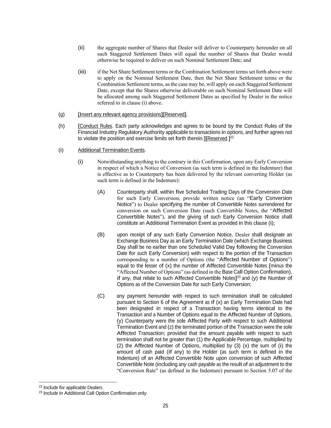 25 (ii) the aggregate number of Shares that Dealer will deliver to Counterparty hereunder on all such Staggered Settlement Dates will equal the number of Shares that Dealer would otherwise be required to deliver on such Nominal Settlement Date; and (iii) if the Net Share Settlement terms or the Combination Settlement terms set forth above were to apply on the Nominal Settlement Date, then the Net Share Settlement terms or the Combination Settlement terms, as the case may be, will apply on each Staggered Settlement Date, except that the Shares otherwise deliverable on such Nominal Settlement Date will be allocated among such Staggered Settlement Dates as specified by Dealer in the notice referred to in clause (i) above. (g) [Insert any relevant agency provisions][Reserved]. (h) [Conduct Rules. Each party acknowledges and agrees to be bound by the Conduct Rules of the Financial Industry Regulatory Authority applicable to transactions in options, and further agrees not to violate the position and exercise limits set forth therein.][Reserved.]22 (i) Additional Termination Events. (i) Notwithstanding anything to the contrary in this Confirmation, upon any Early Conversion in respect of which a Notice of Conversion (as such term is defined in the Indenture) that is effective as to Counterparty has been delivered by the relevant converting Holder (as such term is defined in the Indenture): (A) Counterparty shall, within five Scheduled Trading Days of the Conversion Date for such Early Conversion, provide written notice (an “Early Conversion Notice”) to Dealer specifying the number of Convertible Notes surrendered for conversion on such Conversion Date (such Convertible Notes, the “Affected Convertible Notes”), and the giving of such Early Conversion Notice shall constitute an Additional Termination Event as provided in this clause (i); (B) upon receipt of any such Early Conversion Notice, Dealer shall designate an Exchange Business Day as an Early Termination Date (which Exchange Business Day shall be no earlier than one Scheduled Valid Day following the Conversion Date for such Early Conversion) with respect to the portion of the Transaction corresponding to a number of Options (the “Affected Number of Options”) equal to the lesser of (x) the number of Affected Convertible Notes [minus the “Affected Number of Options” (as defined in the Base Call Option Confirmation), if any, that relate to such Affected Convertible Notes]23 and (y) the Number of Options as of the Conversion Date for such Early Conversion; (C) any payment hereunder with respect to such termination shall be calculated pursuant to Section 6 of the Agreement as if (x) an Early Termination Date had been designated in respect of a Transaction having terms identical to the Transaction and a Number of Options equal to the Affected Number of Options, (y) Counterparty were the sole Affected Party with respect to such Additional Termination Event and (z) the terminated portion of the Transaction were the sole Affected Transaction; provided that the amount payable with respect to such termination shall not be greater than (1) the Applicable Percentage, multiplied by (2) the Affected Number of Options, multiplied by (3) (x) the sum of (i) the amount of cash paid (if any) to the Holder (as such term is defined in the Indenture) of an Affected Convertible Note upon conversion of such Affected Convertible Note (including any cash payable as the result of an adjustment to the “Conversion Rate” (as defined in the Indenture) pursuant to Section 5.07 of the 22 Include for applicable Dealers. 23 Include in Additional Call Option Confirmation only.