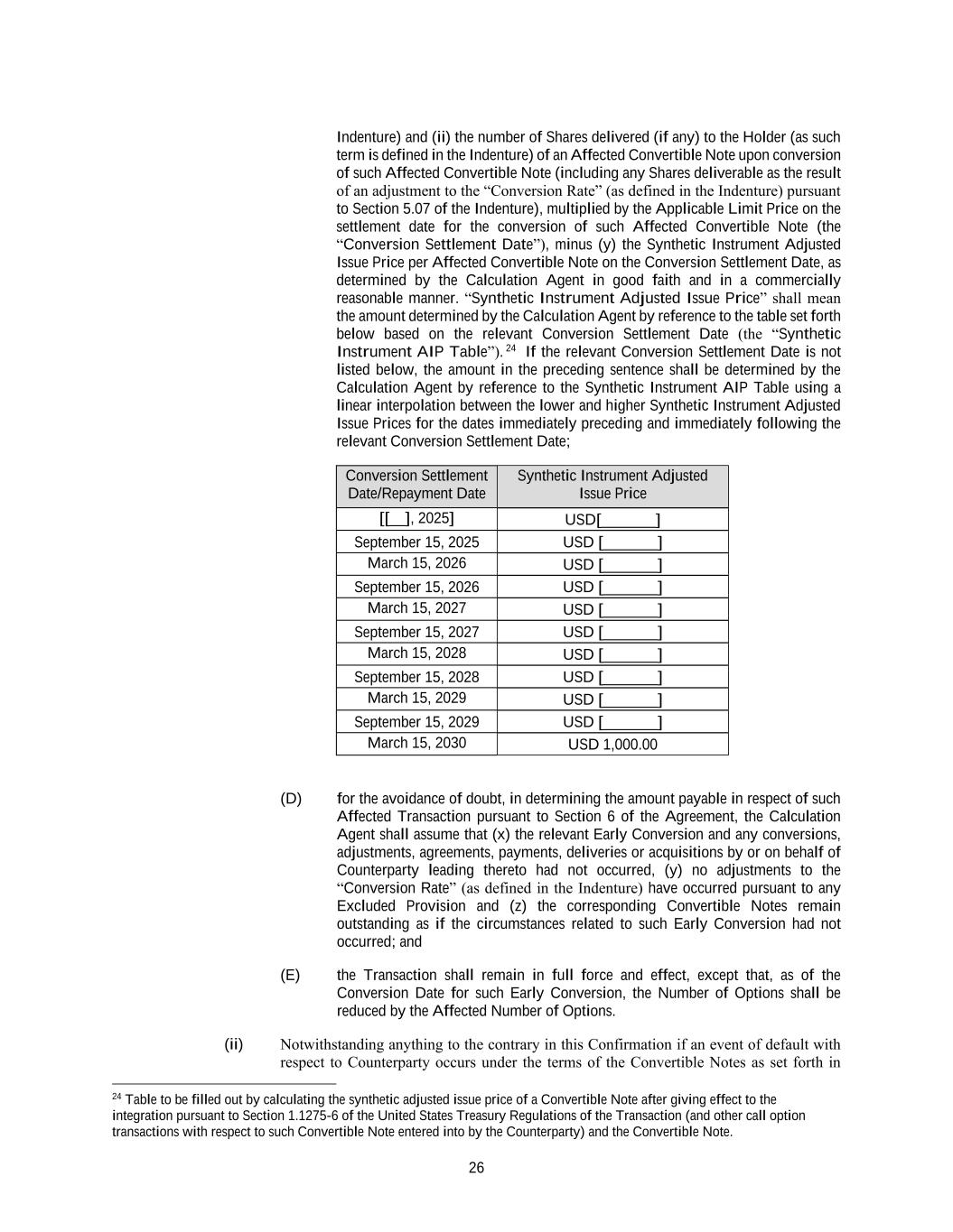 26 Indenture) and (ii) the number of Shares delivered (if any) to the Holder (as such term is defined in the Indenture) of an Affected Convertible Note upon conversion of such Affected Convertible Note (including any Shares deliverable as the result of an adjustment to the “Conversion Rate” (as defined in the Indenture) pursuant to Section 5.07 of the Indenture), multiplied by the Applicable Limit Price on the settlement date for the conversion of such Affected Convertible Note (the “Conversion Settlement Date”), minus (y) the Synthetic Instrument Adjusted Issue Price per Affected Convertible Note on the Conversion Settlement Date, as determined by the Calculation Agent in good faith and in a commercially reasonable manner. “Synthetic Instrument Adjusted Issue Price” shall mean the amount determined by the Calculation Agent by reference to the table set forth below based on the relevant Conversion Settlement Date (the “Synthetic Instrument AIP Table”). 24 If the relevant Conversion Settlement Date is not listed below, the amount in the preceding sentence shall be determined by the Calculation Agent by reference to the Synthetic Instrument AIP Table using a linear interpolation between the lower and higher Synthetic Instrument Adjusted Issue Prices for the dates immediately preceding and immediately following the relevant Conversion Settlement Date; Conversion Settlement Date/Repayment Date Synthetic Instrument Adjusted Issue Price [[__], 2025] USD[_______] September 15, 2025 USD [_______] March 15, 2026 USD [_______] September 15, 2026 USD [_______] March 15, 2027 USD [_______] September 15, 2027 USD [_______] March 15, 2028 USD [_______] September 15, 2028 USD [_______] March 15, 2029 USD [_______] September 15, 2029 USD [_______] March 15, 2030 USD 1,000.00 (D) for the avoidance of doubt, in determining the amount payable in respect of such Affected Transaction pursuant to Section 6 of the Agreement, the Calculation Agent shall assume that (x) the relevant Early Conversion and any conversions, adjustments, agreements, payments, deliveries or acquisitions by or on behalf of Counterparty leading thereto had not occurred, (y) no adjustments to the “Conversion Rate” (as defined in the Indenture) have occurred pursuant to any Excluded Provision and (z) the corresponding Convertible Notes remain outstanding as if the circumstances related to such Early Conversion had not occurred; and (E) the Transaction shall remain in full force and effect, except that, as of the Conversion Date for such Early Conversion, the Number of Options shall be reduced by the Affected Number of Options. (ii) Notwithstanding anything to the contrary in this Confirmation if an event of default with respect to Counterparty occurs under the terms of the Convertible Notes as set forth in 24 Table to be filled out by calculating the synthetic adjusted issue price of a Convertible Note after giving effect to the integration pursuant to Section 1.1275-6 of the United States Treasury Regulations of the Transaction (and other call option transactions with respect to such Convertible Note entered into by the Counterparty) and the Convertible Note.