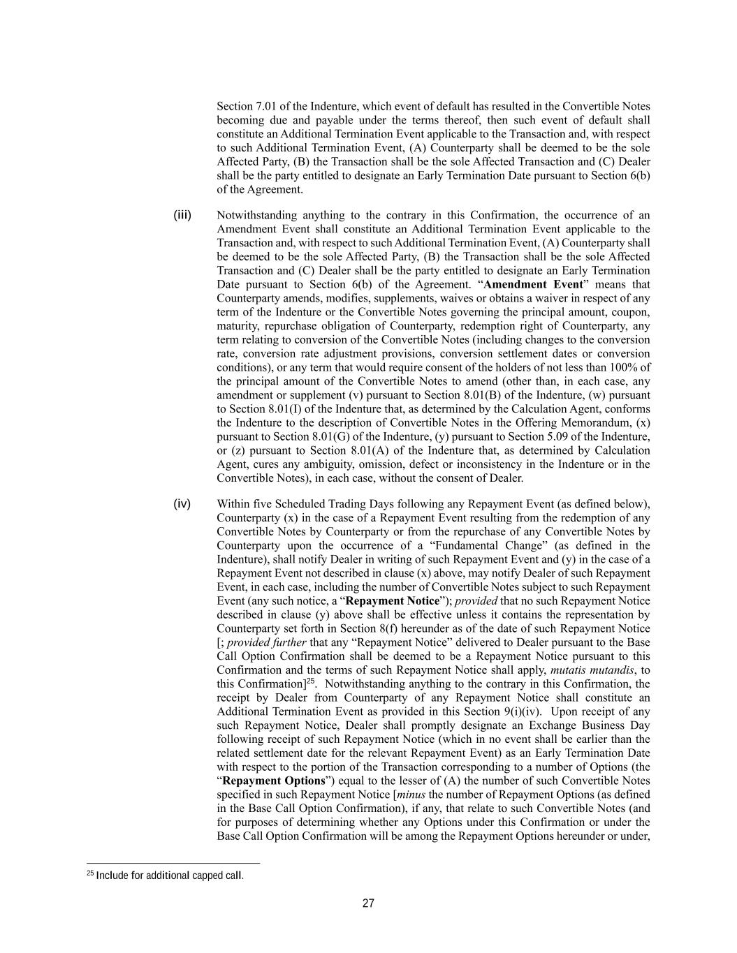 27 Section 7.01 of the Indenture, which event of default has resulted in the Convertible Notes becoming due and payable under the terms thereof, then such event of default shall constitute an Additional Termination Event applicable to the Transaction and, with respect to such Additional Termination Event, (A) Counterparty shall be deemed to be the sole Affected Party, (B) the Transaction shall be the sole Affected Transaction and (C) Dealer shall be the party entitled to designate an Early Termination Date pursuant to Section 6(b) of the Agreement. (iii) Notwithstanding anything to the contrary in this Confirmation, the occurrence of an Amendment Event shall constitute an Additional Termination Event applicable to the Transaction and, with respect to such Additional Termination Event, (A) Counterparty shall be deemed to be the sole Affected Party, (B) the Transaction shall be the sole Affected Transaction and (C) Dealer shall be the party entitled to designate an Early Termination Date pursuant to Section 6(b) of the Agreement. “Amendment Event” means that Counterparty amends, modifies, supplements, waives or obtains a waiver in respect of any term of the Indenture or the Convertible Notes governing the principal amount, coupon, maturity, repurchase obligation of Counterparty, redemption right of Counterparty, any term relating to conversion of the Convertible Notes (including changes to the conversion rate, conversion rate adjustment provisions, conversion settlement dates or conversion conditions), or any term that would require consent of the holders of not less than 100% of the principal amount of the Convertible Notes to amend (other than, in each case, any amendment or supplement (v) pursuant to Section 8.01(B) of the Indenture, (w) pursuant to Section 8.01(I) of the Indenture that, as determined by the Calculation Agent, conforms the Indenture to the description of Convertible Notes in the Offering Memorandum, (x) pursuant to Section 8.01(G) of the Indenture, (y) pursuant to Section 5.09 of the Indenture, or (z) pursuant to Section 8.01(A) of the Indenture that, as determined by Calculation Agent, cures any ambiguity, omission, defect or inconsistency in the Indenture or in the Convertible Notes), in each case, without the consent of Dealer. (iv) Within five Scheduled Trading Days following any Repayment Event (as defined below), Counterparty (x) in the case of a Repayment Event resulting from the redemption of any Convertible Notes by Counterparty or from the repurchase of any Convertible Notes by Counterparty upon the occurrence of a “Fundamental Change” (as defined in the Indenture), shall notify Dealer in writing of such Repayment Event and (y) in the case of a Repayment Event not described in clause (x) above, may notify Dealer of such Repayment Event, in each case, including the number of Convertible Notes subject to such Repayment Event (any such notice, a “Repayment Notice”); provided that no such Repayment Notice described in clause (y) above shall be effective unless it contains the representation by Counterparty set forth in Section 8(f) hereunder as of the date of such Repayment Notice [; provided further that any “Repayment Notice” delivered to Dealer pursuant to the Base Call Option Confirmation shall be deemed to be a Repayment Notice pursuant to this Confirmation and the terms of such Repayment Notice shall apply, mutatis mutandis, to this Confirmation]25. Notwithstanding anything to the contrary in this Confirmation, the receipt by Dealer from Counterparty of any Repayment Notice shall constitute an Additional Termination Event as provided in this Section 9(i)(iv). Upon receipt of any such Repayment Notice, Dealer shall promptly designate an Exchange Business Day following receipt of such Repayment Notice (which in no event shall be earlier than the related settlement date for the relevant Repayment Event) as an Early Termination Date with respect to the portion of the Transaction corresponding to a number of Options (the “Repayment Options”) equal to the lesser of (A) the number of such Convertible Notes specified in such Repayment Notice [minus the number of Repayment Options (as defined in the Base Call Option Confirmation), if any, that relate to such Convertible Notes (and for purposes of determining whether any Options under this Confirmation or under the Base Call Option Confirmation will be among the Repayment Options hereunder or under, 25 Include for additional capped call.