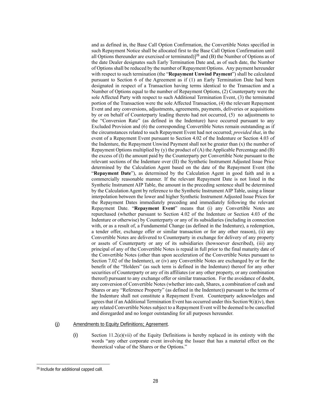 28 and as defined in, the Base Call Option Confirmation, the Convertible Notes specified in such Repayment Notice shall be allocated first to the Base Call Option Confirmation until all Options thereunder are exercised or terminated)]26 and (B) the Number of Options as of the date Dealer designates such Early Termination Date and, as of such date, the Number of Options shall be reduced by the number of Repayment Options. Any payment hereunder with respect to such termination (the “Repayment Unwind Payment”) shall be calculated pursuant to Section 6 of the Agreement as if (1) an Early Termination Date had been designated in respect of a Transaction having terms identical to the Transaction and a Number of Options equal to the number of Repayment Options, (2) Counterparty were the sole Affected Party with respect to such Additional Termination Event, (3) the terminated portion of the Transaction were the sole Affected Transaction, (4) the relevant Repayment Event and any conversions, adjustments, agreements, payments, deliveries or acquisitions by or on behalf of Counterparty leading thereto had not occurred, (5) no adjustments to the “Conversion Rate” (as defined in the Indenture) have occurred pursuant to any Excluded Provision and (6) the corresponding Convertible Notes remain outstanding as if the circumstances related to such Repayment Event had not occurred; provided that, in the event of a Repayment Event pursuant to Section 4.02 of the Indenture or Section 4.03 of the Indenture, the Repayment Unwind Payment shall not be greater than (x) the number of Repayment Options multiplied by (y) the product of (A) the Applicable Percentage and (B) the excess of (I) the amount paid by the Counterparty per Convertible Note pursuant to the relevant sections of the Indenture over (II) the Synthetic Instrument Adjusted Issue Price determined by the Calculation Agent based on the date of the Repayment Event (the “Repayment Date”), as determined by the Calculation Agent in good faith and in a commercially reasonable manner. If the relevant Repayment Date is not listed in the Synthetic Instrument AIP Table, the amount in the preceding sentence shall be determined by the Calculation Agent by reference to the Synthetic Instrument AIP Table, using a linear interpolation between the lower and higher Synthetic Instrument Adjusted Issue Prices for the Repayment Dates immediately preceding and immediately following the relevant Repayment Date. “Repayment Event” means that (i) any Convertible Notes are repurchased (whether pursuant to Section 4.02 of the Indenture or Section 4.03 of the Indenture or otherwise) by Counterparty or any of its subsidiaries (including in connection with, or as a result of, a Fundamental Change (as defined in the Indenture), a redemption, a tender offer, exchange offer or similar transaction or for any other reason), (ii) any Convertible Notes are delivered to Counterparty in exchange for delivery of any property or assets of Counterparty or any of its subsidiaries (howsoever described), (iii) any principal of any of the Convertible Notes is repaid in full prior to the final maturity date of the Convertible Notes (other than upon acceleration of the Convertible Notes pursuant to Section 7.02 of the Indenture), or (iv) any Convertible Notes are exchanged by or for the benefit of the “Holders” (as such term is defined in the Indenture) thereof for any other securities of Counterparty or any of its affiliates (or any other property, or any combination thereof) pursuant to any exchange offer or similar transaction. For the avoidance of doubt, any conversion of Convertible Notes (whether into cash, Shares, a combination of cash and Shares or any “Reference Property” (as defined in the Indenture)) pursuant to the terms of the Indenture shall not constitute a Repayment Event. Counterparty acknowledges and agrees that if an Additional Termination Event has occurred under this Section 9(i)(iv), then any related Convertible Notes subject to a Repayment Event will be deemed to be cancelled and disregarded and no longer outstanding for all purposes hereunder. (j) Amendments to Equity Definitions; Agreement. (i) Section 11.2(e)(vii) of the Equity Definitions is hereby replaced in its entirety with the words “any other corporate event involving the Issuer that has a material effect on the theoretical value of the Shares or the Options.” 26 Include for additional capped call.