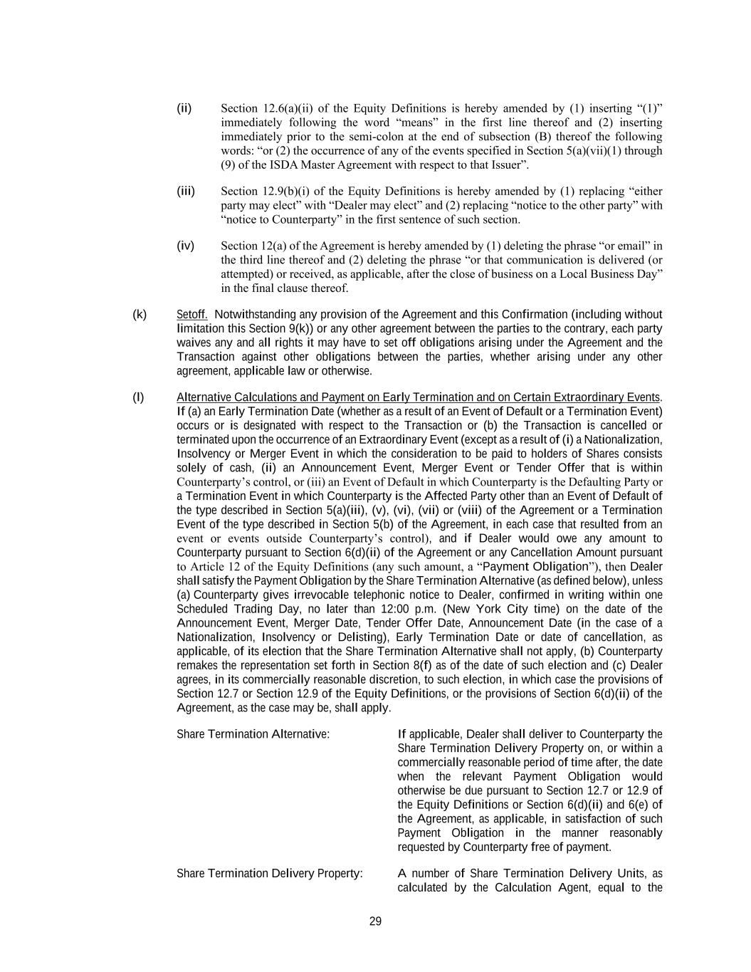 29 (ii) Section 12.6(a)(ii) of the Equity Definitions is hereby amended by (1) inserting “(1)” immediately following the word “means” in the first line thereof and (2) inserting immediately prior to the semi-colon at the end of subsection (B) thereof the following words: “or (2) the occurrence of any of the events specified in Section 5(a)(vii)(1) through (9) of the ISDA Master Agreement with respect to that Issuer”. (iii) Section 12.9(b)(i) of the Equity Definitions is hereby amended by (1) replacing “either party may elect” with “Dealer may elect” and (2) replacing “notice to the other party” with “notice to Counterparty” in the first sentence of such section. (iv) Section 12(a) of the Agreement is hereby amended by (1) deleting the phrase “or email” in the third line thereof and (2) deleting the phrase “or that communication is delivered (or attempted) or received, as applicable, after the close of business on a Local Business Day” in the final clause thereof. (k) Setoff. Notwithstanding any provision of the Agreement and this Confirmation (including without limitation this Section 9(k)) or any other agreement between the parties to the contrary, each party waives any and all rights it may have to set off obligations arising under the Agreement and the Transaction against other obligations between the parties, whether arising under any other agreement, applicable law or otherwise. (l) Alternative Calculations and Payment on Early Termination and on Certain Extraordinary Events. If (a) an Early Termination Date (whether as a result of an Event of Default or a Termination Event) occurs or is designated with respect to the Transaction or (b) the Transaction is cancelled or terminated upon the occurrence of an Extraordinary Event (except as a result of (i) a Nationalization, Insolvency or Merger Event in which the consideration to be paid to holders of Shares consists solely of cash, (ii) an Announcement Event, Merger Event or Tender Offer that is within Counterparty’s control, or (iii) an Event of Default in which Counterparty is the Defaulting Party or a Termination Event in which Counterparty is the Affected Party other than an Event of Default of the type described in Section 5(a)(iii), (v), (vi), (vii) or (viii) of the Agreement or a Termination Event of the type described in Section 5(b) of the Agreement, in each case that resulted from an event or events outside Counterparty’s control), and if Dealer would owe any amount to Counterparty pursuant to Section 6(d)(ii) of the Agreement or any Cancellation Amount pursuant to Article 12 of the Equity Definitions (any such amount, a “Payment Obligation”), then Dealer shall satisfy the Payment Obligation by the Share Termination Alternative (as defined below), unless (a) Counterparty gives irrevocable telephonic notice to Dealer, confirmed in writing within one Scheduled Trading Day, no later than 12:00 p.m. (New York City time) on the date of the Announcement Event, Merger Date, Tender Offer Date, Announcement Date (in the case of a Nationalization, Insolvency or Delisting), Early Termination Date or date of cancellation, as applicable, of its election that the Share Termination Alternative shall not apply, (b) Counterparty remakes the representation set forth in Section 8(f) as of the date of such election and (c) Dealer agrees, in its commercially reasonable discretion, to such election, in which case the provisions of Section 12.7 or Section 12.9 of the Equity Definitions, or the provisions of Section 6(d)(ii) of the Agreement, as the case may be, shall apply. Share Termination Alternative: If applicable, Dealer shall deliver to Counterparty the Share Termination Delivery Property on, or within a commercially reasonable period of time after, the date when the relevant Payment Obligation would otherwise be due pursuant to Section 12.7 or 12.9 of the Equity Definitions or Section 6(d)(ii) and 6(e) of the Agreement, as applicable, in satisfaction of such Payment Obligation in the manner reasonably requested by Counterparty free of payment. Share Termination Delivery Property: A number of Share Termination Delivery Units, as calculated by the Calculation Agent, equal to the