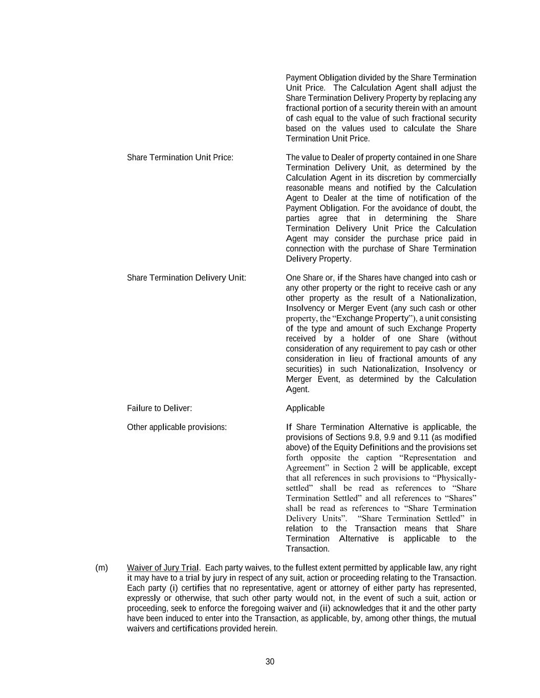 30 Payment Obligation divided by the Share Termination Unit Price. The Calculation Agent shall adjust the Share Termination Delivery Property by replacing any fractional portion of a security therein with an amount of cash equal to the value of such fractional security based on the values used to calculate the Share Termination Unit Price. Share Termination Unit Price: The value to Dealer of property contained in one Share Termination Delivery Unit, as determined by the Calculation Agent in its discretion by commercially reasonable means and notified by the Calculation Agent to Dealer at the time of notification of the Payment Obligation. For the avoidance of doubt, the parties agree that in determining the Share Termination Delivery Unit Price the Calculation Agent may consider the purchase price paid in connection with the purchase of Share Termination Delivery Property. Share Termination Delivery Unit: One Share or, if the Shares have changed into cash or any other property or the right to receive cash or any other property as the result of a Nationalization, Insolvency or Merger Event (any such cash or other property, the “Exchange Property”), a unit consisting of the type and amount of such Exchange Property received by a holder of one Share (without consideration of any requirement to pay cash or other consideration in lieu of fractional amounts of any securities) in such Nationalization, Insolvency or Merger Event, as determined by the Calculation Agent. Failure to Deliver: Applicable Other applicable provisions: If Share Termination Alternative is applicable, the provisions of Sections 9.8, 9.9 and 9.11 (as modified above) of the Equity Definitions and the provisions set forth opposite the caption “Representation and Agreement” in Section 2 will be applicable, except that all references in such provisions to “Physically- settled” shall be read as references to “Share Termination Settled” and all references to “Shares” shall be read as references to “Share Termination Delivery Units”. “Share Termination Settled” in relation to the Transaction means that Share Termination Alternative is applicable to the Transaction. (m) Waiver of Jury Trial. Each party waives, to the fullest extent permitted by applicable law, any right it may have to a trial by jury in respect of any suit, action or proceeding relating to the Transaction. Each party (i) certifies that no representative, agent or attorney of either party has represented, expressly or otherwise, that such other party would not, in the event of such a suit, action or proceeding, seek to enforce the foregoing waiver and (ii) acknowledges that it and the other party have been induced to enter into the Transaction, as applicable, by, among other things, the mutual waivers and certifications provided herein.