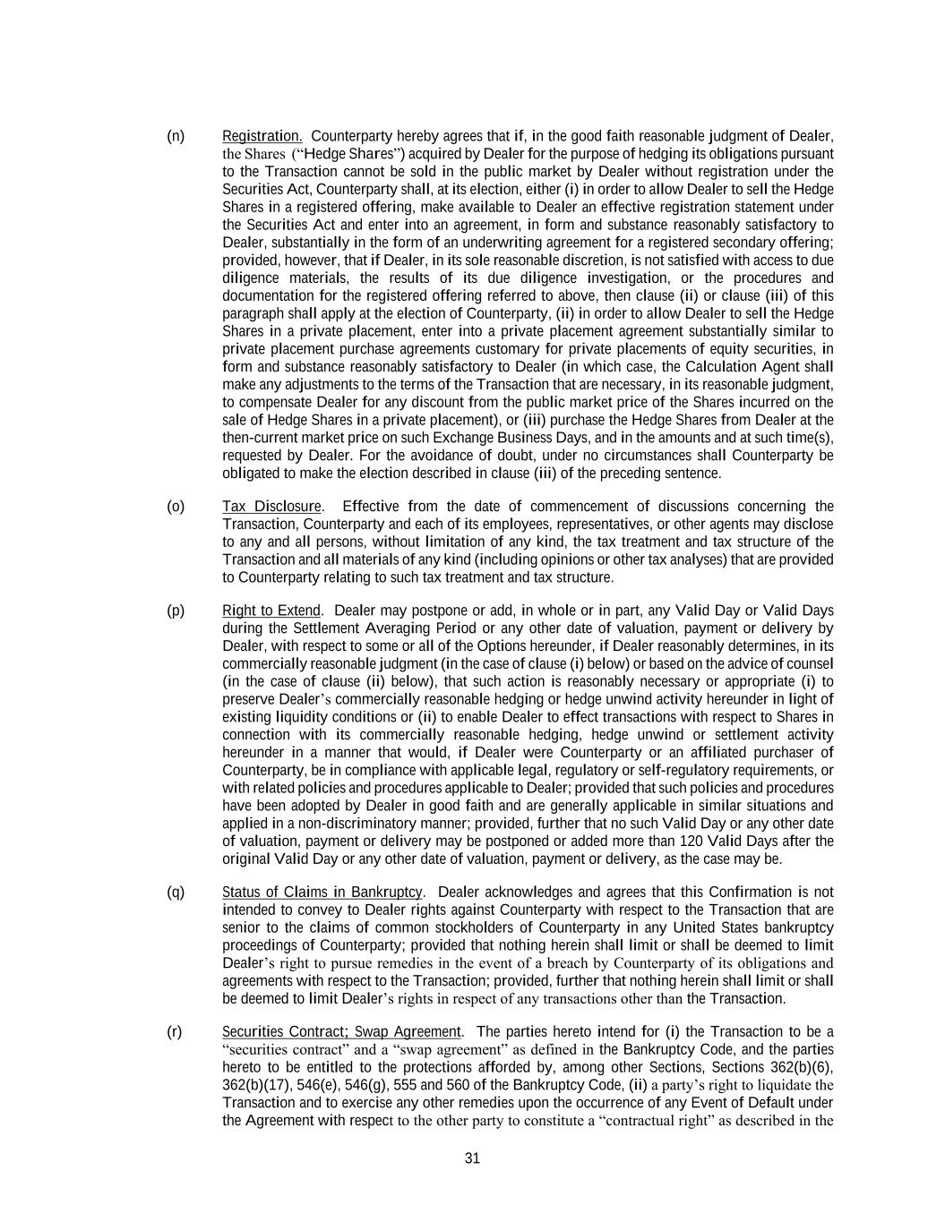 31 (n) Registration. Counterparty hereby agrees that if, in the good faith reasonable judgment of Dealer, the Shares (“Hedge Shares”) acquired by Dealer for the purpose of hedging its obligations pursuant to the Transaction cannot be sold in the public market by Dealer without registration under the Securities Act, Counterparty shall, at its election, either (i) in order to allow Dealer to sell the Hedge Shares in a registered offering, make available to Dealer an effective registration statement under the Securities Act and enter into an agreement, in form and substance reasonably satisfactory to Dealer, substantially in the form of an underwriting agreement for a registered secondary offering; provided, however, that if Dealer, in its sole reasonable discretion, is not satisfied with access to due diligence materials, the results of its due diligence investigation, or the procedures and documentation for the registered offering referred to above, then clause (ii) or clause (iii) of this paragraph shall apply at the election of Counterparty, (ii) in order to allow Dealer to sell the Hedge Shares in a private placement, enter into a private placement agreement substantially similar to private placement purchase agreements customary for private placements of equity securities, in form and substance reasonably satisfactory to Dealer (in which case, the Calculation Agent shall make any adjustments to the terms of the Transaction that are necessary, in its reasonable judgment, to compensate Dealer for any discount from the public market price of the Shares incurred on the sale of Hedge Shares in a private placement), or (iii) purchase the Hedge Shares from Dealer at the then-current market price on such Exchange Business Days, and in the amounts and at such time(s), requested by Dealer. For the avoidance of doubt, under no circumstances shall Counterparty be obligated to make the election described in clause (iii) of the preceding sentence. (o) Tax Disclosure. Effective from the date of commencement of discussions concerning the Transaction, Counterparty and each of its employees, representatives, or other agents may disclose to any and all persons, without limitation of any kind, the tax treatment and tax structure of the Transaction and all materials of any kind (including opinions or other tax analyses) that are provided to Counterparty relating to such tax treatment and tax structure. (p) Right to Extend. Dealer may postpone or add, in whole or in part, any Valid Day or Valid Days during the Settlement Averaging Period or any other date of valuation, payment or delivery by Dealer, with respect to some or all of the Options hereunder, if Dealer reasonably determines, in its commercially reasonable judgment (in the case of clause (i) below) or based on the advice of counsel (in the case of clause (ii) below), that such action is reasonably necessary or appropriate (i) to preserve Dealer’s commercially reasonable hedging or hedge unwind activity hereunder in light of existing liquidity conditions or (ii) to enable Dealer to effect transactions with respect to Shares in connection with its commercially reasonable hedging, hedge unwind or settlement activity hereunder in a manner that would, if Dealer were Counterparty or an affiliated purchaser of Counterparty, be in compliance with applicable legal, regulatory or self-regulatory requirements, or with related policies and procedures applicable to Dealer; provided that such policies and procedures have been adopted by Dealer in good faith and are generally applicable in similar situations and applied in a non-discriminatory manner; provided, further that no such Valid Day or any other date of valuation, payment or delivery may be postponed or added more than 120 Valid Days after the original Valid Day or any other date of valuation, payment or delivery, as the case may be. (q) Status of Claims in Bankruptcy. Dealer acknowledges and agrees that this Confirmation is not intended to convey to Dealer rights against Counterparty with respect to the Transaction that are senior to the claims of common stockholders of Counterparty in any United States bankruptcy proceedings of Counterparty; provided that nothing herein shall limit or shall be deemed to limit Dealer’s right to pursue remedies in the event of a breach by Counterparty of its obligations and agreements with respect to the Transaction; provided, further that nothing herein shall limit or shall be deemed to limit Dealer’s rights in respect of any transactions other than the Transaction. (r) Securities Contract; Swap Agreement. The parties hereto intend for (i) the Transaction to be a “securities contract” and a “swap agreement” as defined in the Bankruptcy Code, and the parties hereto to be entitled to the protections afforded by, among other Sections, Sections 362(b)(6), 362(b)(17), 546(e), 546(g), 555 and 560 of the Bankruptcy Code, (ii) a party’s right to liquidate the Transaction and to exercise any other remedies upon the occurrence of any Event of Default under the Agreement with respect to the other party to constitute a “contractual right” as described in the
