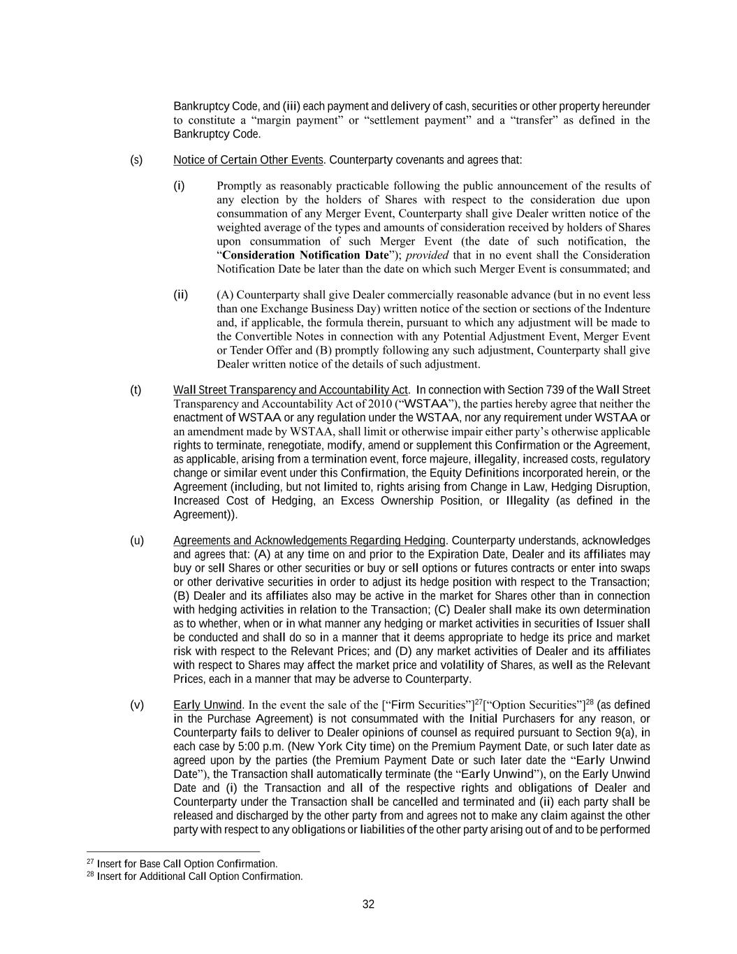 32 Bankruptcy Code, and (iii) each payment and delivery of cash, securities or other property hereunder to constitute a “margin payment” or “settlement payment” and a “transfer” as defined in the Bankruptcy Code. (s) Notice of Certain Other Events. Counterparty covenants and agrees that: (i) Promptly as reasonably practicable following the public announcement of the results of any election by the holders of Shares with respect to the consideration due upon consummation of any Merger Event, Counterparty shall give Dealer written notice of the weighted average of the types and amounts of consideration received by holders of Shares upon consummation of such Merger Event (the date of such notification, the “Consideration Notification Date”); provided that in no event shall the Consideration Notification Date be later than the date on which such Merger Event is consummated; and (ii) (A) Counterparty shall give Dealer commercially reasonable advance (but in no event less than one Exchange Business Day) written notice of the section or sections of the Indenture and, if applicable, the formula therein, pursuant to which any adjustment will be made to the Convertible Notes in connection with any Potential Adjustment Event, Merger Event or Tender Offer and (B) promptly following any such adjustment, Counterparty shall give Dealer written notice of the details of such adjustment. (t) Wall Street Transparency and Accountability Act. In connection with Section 739 of the Wall Street Transparency and Accountability Act of 2010 (“WSTAA”), the parties hereby agree that neither the enactment of WSTAA or any regulation under the WSTAA, nor any requirement under WSTAA or an amendment made by WSTAA, shall limit or otherwise impair either party’s otherwise applicable rights to terminate, renegotiate, modify, amend or supplement this Confirmation or the Agreement, as applicable, arising from a termination event, force majeure, illegality, increased costs, regulatory change or similar event under this Confirmation, the Equity Definitions incorporated herein, or the Agreement (including, but not limited to, rights arising from Change in Law, Hedging Disruption, Increased Cost of Hedging, an Excess Ownership Position, or Illegality (as defined in the Agreement)). (u) Agreements and Acknowledgements Regarding Hedging. Counterparty understands, acknowledges and agrees that: (A) at any time on and prior to the Expiration Date, Dealer and its affiliates may buy or sell Shares or other securities or buy or sell options or futures contracts or enter into swaps or other derivative securities in order to adjust its hedge position with respect to the Transaction; (B) Dealer and its affiliates also may be active in the market for Shares other than in connection with hedging activities in relation to the Transaction; (C) Dealer shall make its own determination as to whether, when or in what manner any hedging or market activities in securities of Issuer shall be conducted and shall do so in a manner that it deems appropriate to hedge its price and market risk with respect to the Relevant Prices; and (D) any market activities of Dealer and its affiliates with respect to Shares may affect the market price and volatility of Shares, as well as the Relevant Prices, each in a manner that may be adverse to Counterparty. (v) Early Unwind. In the event the sale of the [“Firm Securities”]27[“Option Securities”]28 (as defined in the Purchase Agreement) is not consummated with the Initial Purchasers for any reason, or Counterparty fails to deliver to Dealer opinions of counsel as required pursuant to Section 9(a), in each case by 5:00 p.m. (New York City time) on the Premium Payment Date, or such later date as agreed upon by the parties (the Premium Payment Date or such later date the “Early Unwind Date”), the Transaction shall automatically terminate (the “Early Unwind”), on the Early Unwind Date and (i) the Transaction and all of the respective rights and obligations of Dealer and Counterparty under the Transaction shall be cancelled and terminated and (ii) each party shall be released and discharged by the other party from and agrees not to make any claim against the other party with respect to any obligations or liabilities of the other party arising out of and to be performed 27 Insert for Base Call Option Confirmation. 28 Insert for Additional Call Option Confirmation.