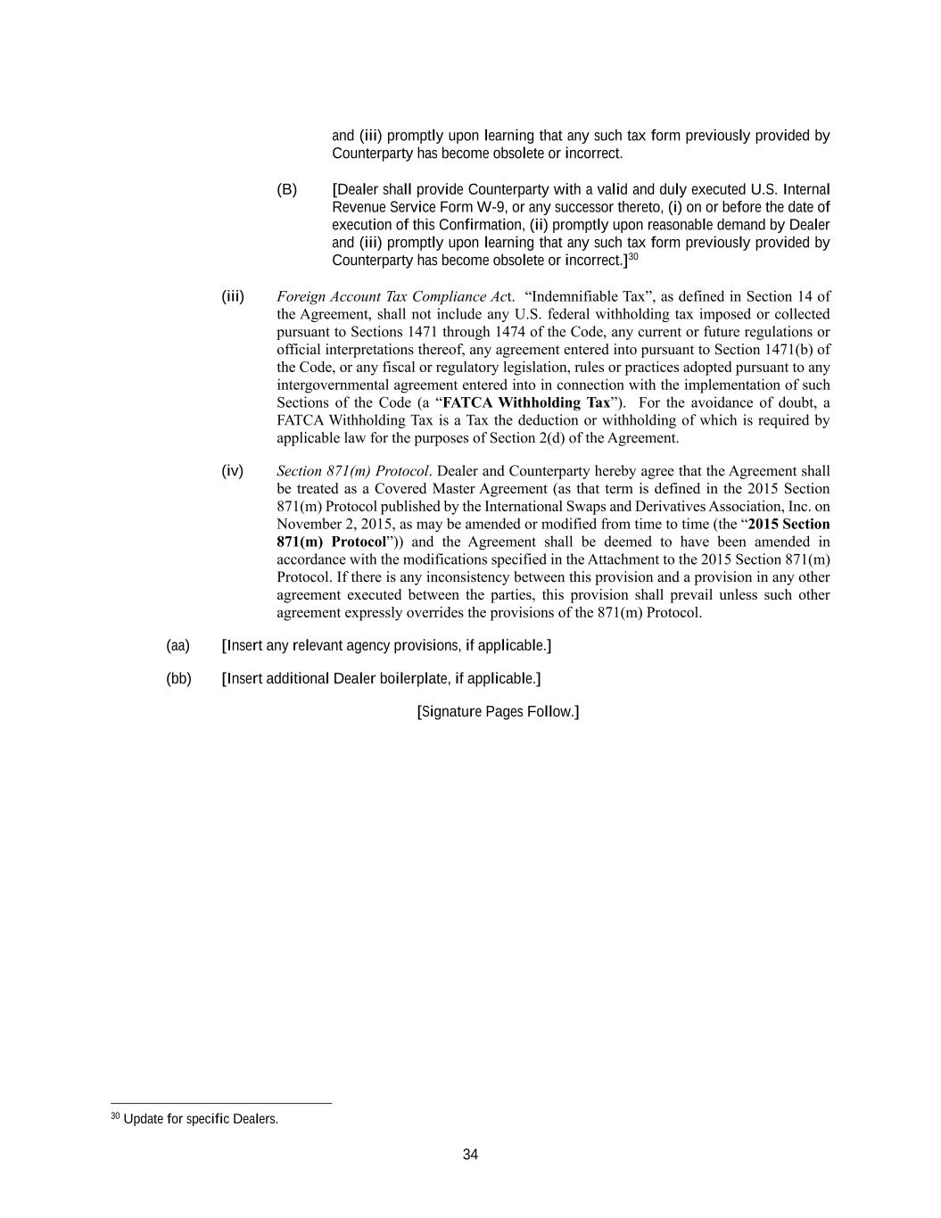 34 and (iii) promptly upon learning that any such tax form previously provided by Counterparty has become obsolete or incorrect. (B) [Dealer shall provide Counterparty with a valid and duly executed U.S. Internal Revenue Service Form W-9, or any successor thereto, (i) on or before the date of execution of this Confirmation, (ii) promptly upon reasonable demand by Dealer and (iii) promptly upon learning that any such tax form previously provided by Counterparty has become obsolete or incorrect.]30 (iii) Foreign Account Tax Compliance Act. “Indemnifiable Tax”, as defined in Section 14 of the Agreement, shall not include any U.S. federal withholding tax imposed or collected pursuant to Sections 1471 through 1474 of the Code, any current or future regulations or official interpretations thereof, any agreement entered into pursuant to Section 1471(b) of the Code, or any fiscal or regulatory legislation, rules or practices adopted pursuant to any intergovernmental agreement entered into in connection with the implementation of such Sections of the Code (a “FATCA Withholding Tax”). For the avoidance of doubt, a FATCA Withholding Tax is a Tax the deduction or withholding of which is required by applicable law for the purposes of Section 2(d) of the Agreement. (iv) Section 871(m) Protocol. Dealer and Counterparty hereby agree that the Agreement shall be treated as a Covered Master Agreement (as that term is defined in the 2015 Section 871(m) Protocol published by the International Swaps and Derivatives Association, Inc. on November 2, 2015, as may be amended or modified from time to time (the “2015 Section 871(m) Protocol”)) and the Agreement shall be deemed to have been amended in accordance with the modifications specified in the Attachment to the 2015 Section 871(m) Protocol. If there is any inconsistency between this provision and a provision in any other agreement executed between the parties, this provision shall prevail unless such other agreement expressly overrides the provisions of the 871(m) Protocol. (aa) [Insert any relevant agency provisions, if applicable.] (bb) [Insert additional Dealer boilerplate, if applicable.] [Signature Pages Follow.] 30 Update for specific Dealers.