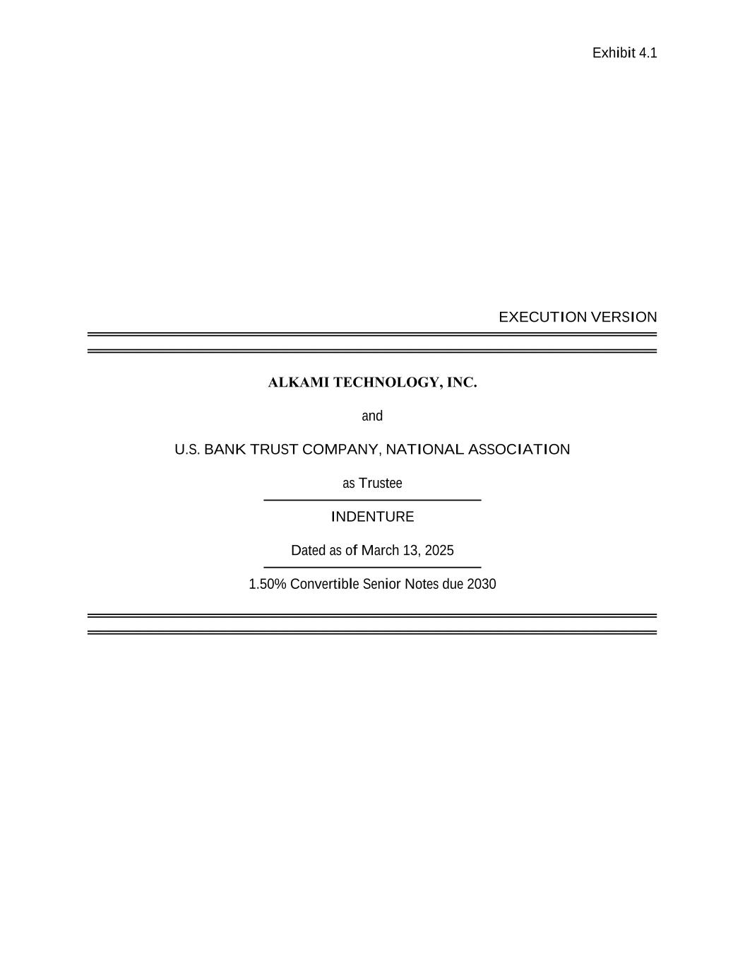 Exhibit 4.1 EXECUTION VERSION ═══════════════════════════════════════════════════════ ═══════════════════════════════════════════════════════ ALKAMI TECHNOLOGY, INC. and U.S. BANK TRUST COMPANY, NATIONAL ASSOCIATION as Trustee ───────────────────── INDENTURE Dated as of March 13, 2025 ───────────────────── 1.50% Convertible Senior Notes due 2030 ═══════════════════════════════════════════════════════ ═══════════════════════════════════════════════════════