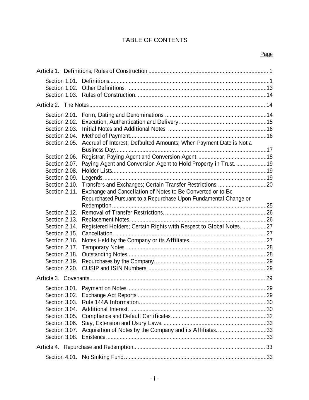 - i - TABLE OF CONTENTS Page Article 1. Definitions; Rules of Construction ............................................................................... 1 Section 1.01. Definitions..........................................................................................................1 Section 1.02. Other Definitions. ............................................................................................13 Section 1.03. Rules of Construction. .....................................................................................14 Article 2. The Notes .................................................................................................................... 14 Section 2.01. Form, Dating and Denominations. ...................................................................14 Section 2.02. Execution, Authentication and Delivery. .........................................................15 Section 2.03. Initial Notes and Additional Notes. .................................................................16 Section 2.04. Method of Payment. .........................................................................................16 Section 2.05. Accrual of Interest; Defaulted Amounts; When Payment Date is Not a Business Day. ...................................................................................................17 Section 2.06. Registrar, Paying Agent and Conversion Agent. .............................................18 Section 2.07. Paying Agent and Conversion Agent to Hold Property in Trust. ....................19 Section 2.08. Holder Lists. .....................................................................................................19 Section 2.09. Legends. ...........................................................................................................19 Section 2.10. Transfers and Exchanges; Certain Transfer Restrictions. ................................20 Section 2.11. Exchange and Cancellation of Notes to Be Converted or to Be Repurchased Pursuant to a Repurchase Upon Fundamental Change or Redemption. .....................................................................................................25 Section 2.12. Removal of Transfer Restrictions. ...................................................................26 Section 2.13. Replacement Notes. .........................................................................................26 Section 2.14. Registered Holders; Certain Rights with Respect to Global Notes. ................27 Section 2.15. Cancellation. ....................................................................................................27 Section 2.16. Notes Held by the Company or its Affiliates. ..................................................27 Section 2.17. Temporary Notes. ............................................................................................28 Section 2.18. Outstanding Notes. ...........................................................................................28 Section 2.19. Repurchases by the Company. .........................................................................29 Section 2.20. CUSIP and ISIN Numbers. ..............................................................................29 Article 3. Covenants .................................................................................................................... 29 Section 3.01. Payment on Notes. ...........................................................................................29 Section 3.02. Exchange Act Reports. .....................................................................................29 Section 3.03. Rule 144A Information. ...................................................................................30 Section 3.04. Additional Interest. ..........................................................................................30 Section 3.05. Compliance and Default Certificates. ..............................................................32 Section 3.06. Stay, Extension and Usury Laws. ....................................................................33 Section 3.07. Acquisition of Notes by the Company and its Affiliates. ................................33 Section 3.08. Existence. .........................................................................................................33 Article 4. Repurchase and Redemption ....................................................................................... 33 Section 4.01. No Sinking Fund. .............................................................................................33
