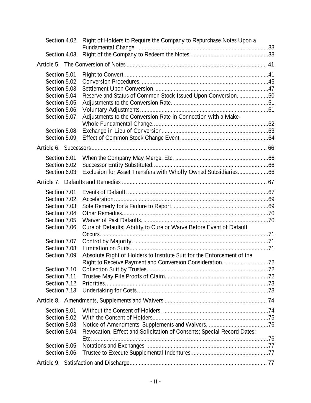 - ii - Section 4.02. Right of Holders to Require the Company to Repurchase Notes Upon a Fundamental Change. ......................................................................................33 Section 4.03. Right of the Company to Redeem the Notes. ..................................................38 Article 5. The Conversion of Notes ............................................................................................ 41 Section 5.01. Right to Convert. ..............................................................................................41 Section 5.02. Conversion Procedures. ...................................................................................45 Section 5.03. Settlement Upon Conversion. ..........................................................................47 Section 5.04. Reserve and Status of Common Stock Issued Upon Conversion. ...................50 Section 5.05. Adjustments to the Conversion Rate. ...............................................................51 Section 5.06. Voluntary Adjustments. ...................................................................................61 Section 5.07. Adjustments to the Conversion Rate in Connection with a Make- Whole Fundamental Change. ...........................................................................62 Section 5.08. Exchange in Lieu of Conversion. .....................................................................63 Section 5.09. Effect of Common Stock Change Event. .........................................................64 Article 6. Successors ................................................................................................................... 66 Section 6.01. When the Company May Merge, Etc. .............................................................66 Section 6.02. Successor Entity Substituted. ...........................................................................66 Section 6.03. Exclusion for Asset Transfers with Wholly Owned Subsidiaries. ...................66 Article 7. Defaults and Remedies ............................................................................................... 67 Section 7.01. Events of Default. ............................................................................................67 Section 7.02. Acceleration. ....................................................................................................69 Section 7.03. Sole Remedy for a Failure to Report. ..............................................................69 Section 7.04. Other Remedies. ...............................................................................................70 Section 7.05. Waiver of Past Defaults. ..................................................................................70 Section 7.06. Cure of Defaults; Ability to Cure or Waive Before Event of Default Occurs. .............................................................................................................71 Section 7.07. Control by Majority. ........................................................................................71 Section 7.08. Limitation on Suits. ..........................................................................................71 Section 7.09. Absolute Right of Holders to Institute Suit for the Enforcement of the Right to Receive Payment and Conversion Consideration. .............................72 Section 7.10. Collection Suit by Trustee. ..............................................................................72 Section 7.11. Trustee May File Proofs of Claim. ..................................................................72 Section 7.12. Priorities. ..........................................................................................................73 Section 7.13. Undertaking for Costs. .....................................................................................73 Article 8. Amendments, Supplements and Waivers ................................................................... 74 Section 8.01. Without the Consent of Holders. .....................................................................74 Section 8.02. With the Consent of Holders............................................................................75 Section 8.03. Notice of Amendments, Supplements and Waivers. .......................................76 Section 8.04. Revocation, Effect and Solicitation of Consents; Special Record Dates; Etc. ...................................................................................................................76 Section 8.05. Notations and Exchanges. ................................................................................77 Section 8.06. Trustee to Execute Supplemental Indentures. ..................................................77 Article 9. Satisfaction and Discharge .......................................................................................... 77