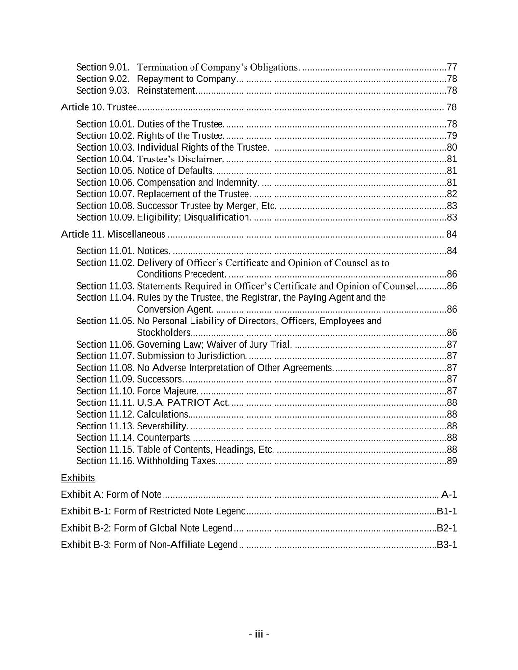 - iii - Section 9.01. Termination of Company’s Obligations. .........................................................77 Section 9.02. Repayment to Company. ..................................................................................78 Section 9.03. Reinstatement. ..................................................................................................78 Article 10. Trustee......................................................................................................................... 78 Section 10.01. Duties of the Trustee. .......................................................................................78 Section 10.02. Rights of the Trustee. .......................................................................................79 Section 10.03. Individual Rights of the Trustee. .....................................................................80 Section 10.04. Trustee’s Disclaimer. .......................................................................................81 Section 10.05. Notice of Defaults. ...........................................................................................81 Section 10.06. Compensation and Indemnity. .........................................................................81 Section 10.07. Replacement of the Trustee. ............................................................................82 Section 10.08. Successor Trustee by Merger, Etc. ..................................................................83 Section 10.09. Eligibility; Disqualification. ............................................................................83 Article 11. Miscellaneous ............................................................................................................. 84 Section 11.01. Notices. ............................................................................................................84 Section 11.02. Delivery of Officer’s Certificate and Opinion of Counsel as to Conditions Precedent. ......................................................................................86 Section 11.03. Statements Required in Officer’s Certificate and Opinion of Counsel............86 Section 11.04. Rules by the Trustee, the Registrar, the Paying Agent and the Conversion Agent. ...........................................................................................86 Section 11.05. No Personal Liability of Directors, Officers, Employees and Stockholders. ....................................................................................................86 Section 11.06. Governing Law; Waiver of Jury Trial. ............................................................87 Section 11.07. Submission to Jurisdiction. ..............................................................................87 Section 11.08. No Adverse Interpretation of Other Agreements. ............................................87 Section 11.09. Successors. .......................................................................................................87 Section 11.10. Force Majeure. .................................................................................................87 Section 11.11. U.S.A. PATRIOT Act. .....................................................................................88 Section 11.12. Calculations......................................................................................................88 Section 11.13. Severability. .....................................................................................................88 Section 11.14. Counterparts. ....................................................................................................88 Section 11.15. Table of Contents, Headings, Etc. ...................................................................88 Section 11.16. Withholding Taxes. ..........................................................................................89 Exhibits Exhibit A: Form of Note ............................................................................................................. A-1 Exhibit B-1: Form of Restricted Note Legend ...........................................................................B1-1 Exhibit B-2: Form of Global Note Legend ................................................................................B2-1 Exhibit B-3: Form of Non-Affiliate Legend ..............................................................................B3-1