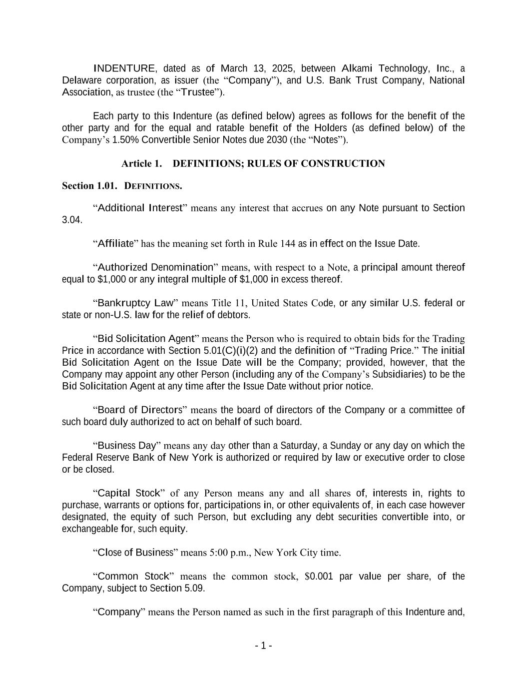 - 1 - INDENTURE, dated as of March 13, 2025, between Alkami Technology, Inc., a Delaware corporation, as issuer (the “Company”), and U.S. Bank Trust Company, National Association, as trustee (the “Trustee”). Each party to this Indenture (as defined below) agrees as follows for the benefit of the other party and for the equal and ratable benefit of the Holders (as defined below) of the Company’s 1.50% Convertible Senior Notes due 2030 (the “Notes”). Article 1. DEFINITIONS; RULES OF CONSTRUCTION Section 1.01. DEFINITIONS. “Additional Interest” means any interest that accrues on any Note pursuant to Section 3.04. “Affiliate” has the meaning set forth in Rule 144 as in effect on the Issue Date. “Authorized Denomination” means, with respect to a Note, a principal amount thereof equal to $1,000 or any integral multiple of $1,000 in excess thereof. “Bankruptcy Law” means Title 11, United States Code, or any similar U.S. federal or state or non-U.S. law for the relief of debtors. “Bid Solicitation Agent” means the Person who is required to obtain bids for the Trading Price in accordance with Section 5.01(C)(i)(2) and the definition of “Trading Price.” The initial Bid Solicitation Agent on the Issue Date will be the Company; provided, however, that the Company may appoint any other Person (including any of the Company’s Subsidiaries) to be the Bid Solicitation Agent at any time after the Issue Date without prior notice. “Board of Directors” means the board of directors of the Company or a committee of such board duly authorized to act on behalf of such board. “Business Day” means any day other than a Saturday, a Sunday or any day on which the Federal Reserve Bank of New York is authorized or required by law or executive order to close or be closed. “Capital Stock” of any Person means any and all shares of, interests in, rights to purchase, warrants or options for, participations in, or other equivalents of, in each case however designated, the equity of such Person, but excluding any debt securities convertible into, or exchangeable for, such equity. “Close of Business” means 5:00 p.m., New York City time. “Common Stock” means the common stock, $0.001 par value per share, of the Company, subject to Section 5.09. “Company” means the Person named as such in the first paragraph of this Indenture and,