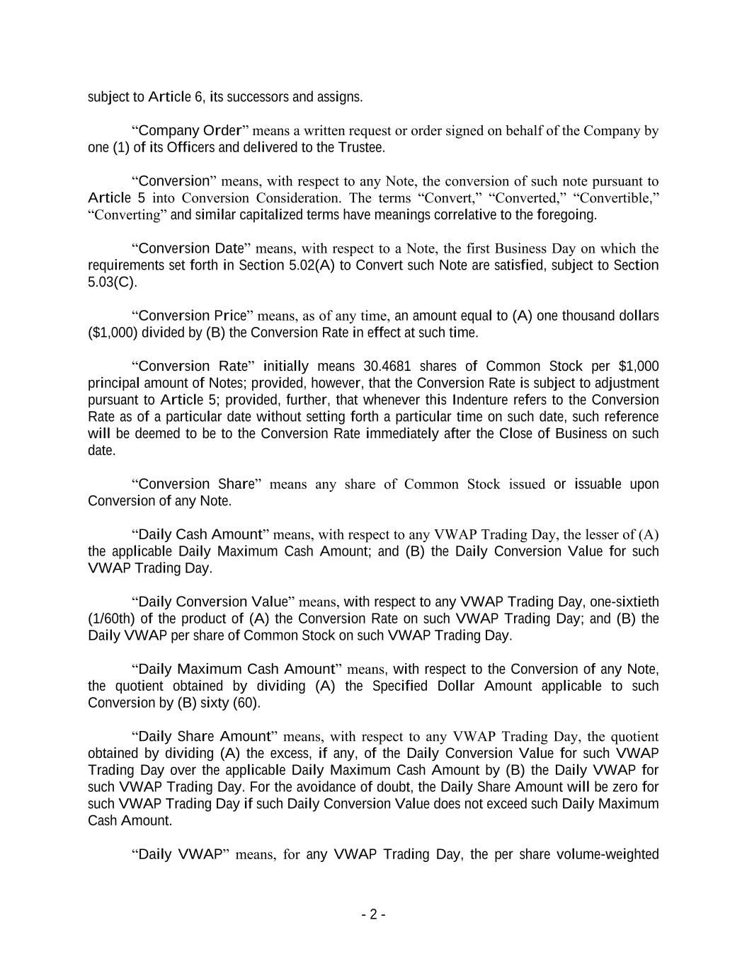 - 2 - subject to Article 6, its successors and assigns. “Company Order” means a written request or order signed on behalf of the Company by one (1) of its Officers and delivered to the Trustee. “Conversion” means, with respect to any Note, the conversion of such note pursuant to Article 5 into Conversion Consideration. The terms “Convert,” “Converted,” “Convertible,” “Converting” and similar capitalized terms have meanings correlative to the foregoing. “Conversion Date” means, with respect to a Note, the first Business Day on which the requirements set forth in Section 5.02(A) to Convert such Note are satisfied, subject to Section 5.03(C). “Conversion Price” means, as of any time, an amount equal to (A) one thousand dollars ($1,000) divided by (B) the Conversion Rate in effect at such time. “Conversion Rate” initially means 30.4681 shares of Common Stock per $1,000 principal amount of Notes; provided, however, that the Conversion Rate is subject to adjustment pursuant to Article 5; provided, further, that whenever this Indenture refers to the Conversion Rate as of a particular date without setting forth a particular time on such date, such reference will be deemed to be to the Conversion Rate immediately after the Close of Business on such date. “Conversion Share” means any share of Common Stock issued or issuable upon Conversion of any Note. “Daily Cash Amount” means, with respect to any VWAP Trading Day, the lesser of (A) the applicable Daily Maximum Cash Amount; and (B) the Daily Conversion Value for such VWAP Trading Day. “Daily Conversion Value” means, with respect to any VWAP Trading Day, one-sixtieth (1/60th) of the product of (A) the Conversion Rate on such VWAP Trading Day; and (B) the Daily VWAP per share of Common Stock on such VWAP Trading Day. “Daily Maximum Cash Amount” means, with respect to the Conversion of any Note, the quotient obtained by dividing (A) the Specified Dollar Amount applicable to such Conversion by (B) sixty (60). “Daily Share Amount” means, with respect to any VWAP Trading Day, the quotient obtained by dividing (A) the excess, if any, of the Daily Conversion Value for such VWAP Trading Day over the applicable Daily Maximum Cash Amount by (B) the Daily VWAP for such VWAP Trading Day. For the avoidance of doubt, the Daily Share Amount will be zero for such VWAP Trading Day if such Daily Conversion Value does not exceed such Daily Maximum Cash Amount. “Daily VWAP” means, for any VWAP Trading Day, the per share volume-weighted