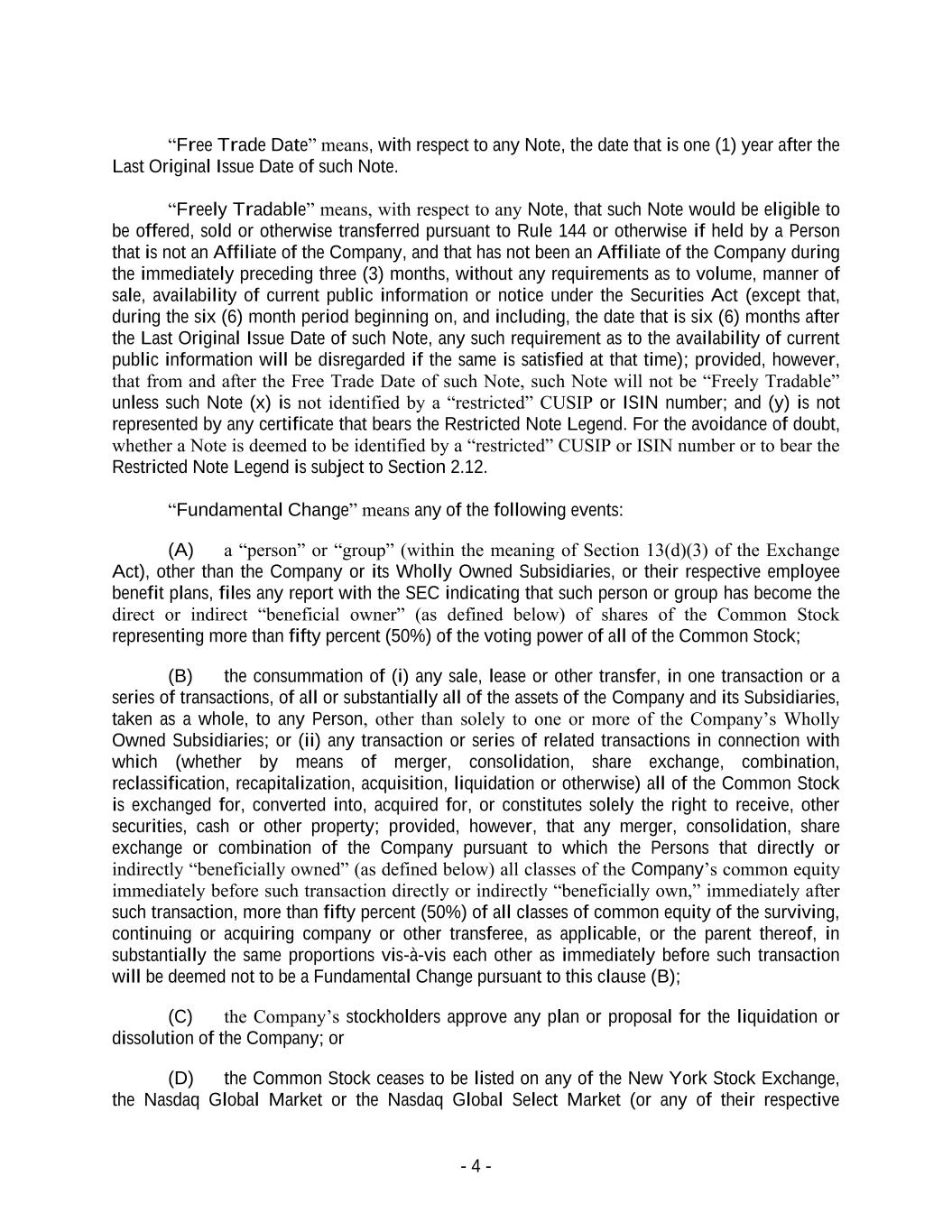 - 4 - “Free Trade Date” means, with respect to any Note, the date that is one (1) year after the Last Original Issue Date of such Note. “Freely Tradable” means, with respect to any Note, that such Note would be eligible to be offered, sold or otherwise transferred pursuant to Rule 144 or otherwise if held by a Person that is not an Affiliate of the Company, and that has not been an Affiliate of the Company during the immediately preceding three (3) months, without any requirements as to volume, manner of sale, availability of current public information or notice under the Securities Act (except that, during the six (6) month period beginning on, and including, the date that is six (6) months after the Last Original Issue Date of such Note, any such requirement as to the availability of current public information will be disregarded if the same is satisfied at that time); provided, however, that from and after the Free Trade Date of such Note, such Note will not be “Freely Tradable” unless such Note (x) is not identified by a “restricted” CUSIP or ISIN number; and (y) is not represented by any certificate that bears the Restricted Note Legend. For the avoidance of doubt, whether a Note is deemed to be identified by a “restricted” CUSIP or ISIN number or to bear the Restricted Note Legend is subject to Section 2.12. “Fundamental Change” means any of the following events: (A) a “person” or “group” (within the meaning of Section 13(d)(3) of the Exchange Act), other than the Company or its Wholly Owned Subsidiaries, or their respective employee benefit plans, files any report with the SEC indicating that such person or group has become the direct or indirect “beneficial owner” (as defined below) of shares of the Common Stock representing more than fifty percent (50%) of the voting power of all of the Common Stock; (B) the consummation of (i) any sale, lease or other transfer, in one transaction or a series of transactions, of all or substantially all of the assets of the Company and its Subsidiaries, taken as a whole, to any Person, other than solely to one or more of the Company’s Wholly Owned Subsidiaries; or (ii) any transaction or series of related transactions in connection with which (whether by means of merger, consolidation, share exchange, combination, reclassification, recapitalization, acquisition, liquidation or otherwise) all of the Common Stock is exchanged for, converted into, acquired for, or constitutes solely the right to receive, other securities, cash or other property; provided, however, that any merger, consolidation, share exchange or combination of the Company pursuant to which the Persons that directly or indirectly “beneficially owned” (as defined below) all classes of the Company’s common equity immediately before such transaction directly or indirectly “beneficially own,” immediately after such transaction, more than fifty percent (50%) of all classes of common equity of the surviving, continuing or acquiring company or other transferee, as applicable, or the parent thereof, in substantially the same proportions vis-à-vis each other as immediately before such transaction will be deemed not to be a Fundamental Change pursuant to this clause (B); (C) the Company’s stockholders approve any plan or proposal for the liquidation or dissolution of the Company; or (D) the Common Stock ceases to be listed on any of the New York Stock Exchange, the Nasdaq Global Market or the Nasdaq Global Select Market (or any of their respective