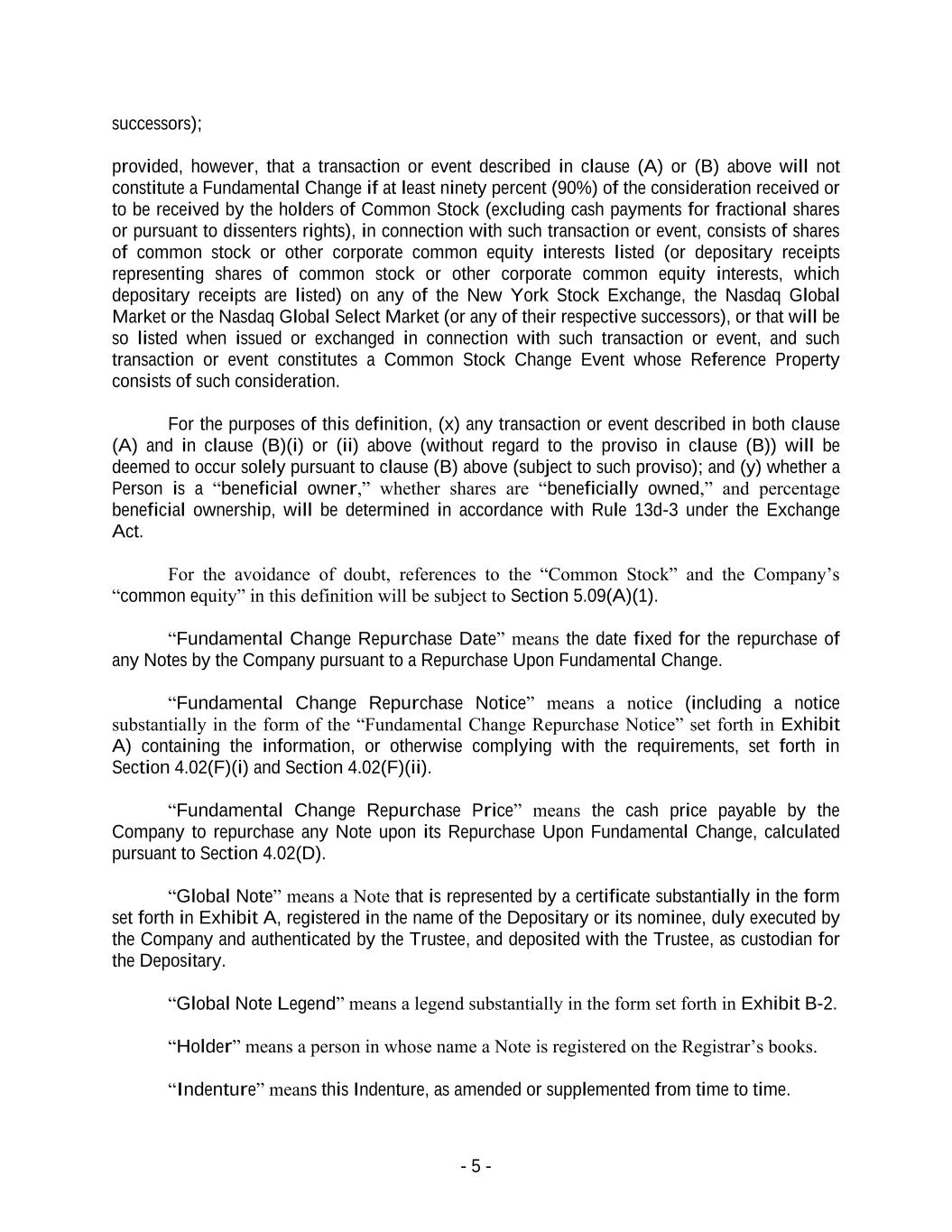 - 5 - successors); provided, however, that a transaction or event described in clause (A) or (B) above will not constitute a Fundamental Change if at least ninety percent (90%) of the consideration received or to be received by the holders of Common Stock (excluding cash payments for fractional shares or pursuant to dissenters rights), in connection with such transaction or event, consists of shares of common stock or other corporate common equity interests listed (or depositary receipts representing shares of common stock or other corporate common equity interests, which depositary receipts are listed) on any of the New York Stock Exchange, the Nasdaq Global Market or the Nasdaq Global Select Market (or any of their respective successors), or that will be so listed when issued or exchanged in connection with such transaction or event, and such transaction or event constitutes a Common Stock Change Event whose Reference Property consists of such consideration. For the purposes of this definition, (x) any transaction or event described in both clause (A) and in clause (B)(i) or (ii) above (without regard to the proviso in clause (B)) will be deemed to occur solely pursuant to clause (B) above (subject to such proviso); and (y) whether a Person is a “beneficial owner,” whether shares are “beneficially owned,” and percentage beneficial ownership, will be determined in accordance with Rule 13d-3 under the Exchange Act. For the avoidance of doubt, references to the “Common Stock” and the Company’s “common equity” in this definition will be subject to Section 5.09(A)(1). “Fundamental Change Repurchase Date” means the date fixed for the repurchase of any Notes by the Company pursuant to a Repurchase Upon Fundamental Change. “Fundamental Change Repurchase Notice” means a notice (including a notice substantially in the form of the “Fundamental Change Repurchase Notice” set forth in Exhibit A) containing the information, or otherwise complying with the requirements, set forth in Section 4.02(F)(i) and Section 4.02(F)(ii). “Fundamental Change Repurchase Price” means the cash price payable by the Company to repurchase any Note upon its Repurchase Upon Fundamental Change, calculated pursuant to Section 4.02(D). “Global Note” means a Note that is represented by a certificate substantially in the form set forth in Exhibit A, registered in the name of the Depositary or its nominee, duly executed by the Company and authenticated by the Trustee, and deposited with the Trustee, as custodian for the Depositary. “Global Note Legend” means a legend substantially in the form set forth in Exhibit B-2. “Holder” means a person in whose name a Note is registered on the Registrar’s books. “Indenture” means this Indenture, as amended or supplemented from time to time.
