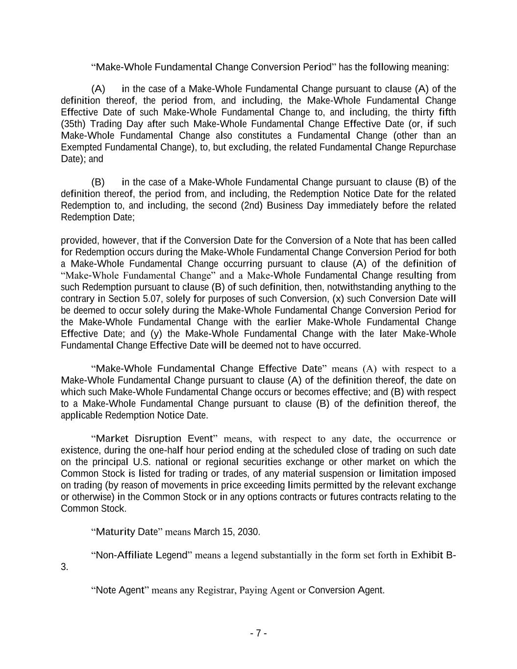 - 7 - “Make-Whole Fundamental Change Conversion Period” has the following meaning: (A) in the case of a Make-Whole Fundamental Change pursuant to clause (A) of the definition thereof, the period from, and including, the Make-Whole Fundamental Change Effective Date of such Make-Whole Fundamental Change to, and including, the thirty fifth (35th) Trading Day after such Make-Whole Fundamental Change Effective Date (or, if such Make-Whole Fundamental Change also constitutes a Fundamental Change (other than an Exempted Fundamental Change), to, but excluding, the related Fundamental Change Repurchase Date); and (B) in the case of a Make-Whole Fundamental Change pursuant to clause (B) of the definition thereof, the period from, and including, the Redemption Notice Date for the related Redemption to, and including, the second (2nd) Business Day immediately before the related Redemption Date; provided, however, that if the Conversion Date for the Conversion of a Note that has been called for Redemption occurs during the Make-Whole Fundamental Change Conversion Period for both a Make-Whole Fundamental Change occurring pursuant to clause (A) of the definition of “Make-Whole Fundamental Change” and a Make-Whole Fundamental Change resulting from such Redemption pursuant to clause (B) of such definition, then, notwithstanding anything to the contrary in Section 5.07, solely for purposes of such Conversion, (x) such Conversion Date will be deemed to occur solely during the Make-Whole Fundamental Change Conversion Period for the Make-Whole Fundamental Change with the earlier Make-Whole Fundamental Change Effective Date; and (y) the Make-Whole Fundamental Change with the later Make-Whole Fundamental Change Effective Date will be deemed not to have occurred. “Make-Whole Fundamental Change Effective Date” means (A) with respect to a Make-Whole Fundamental Change pursuant to clause (A) of the definition thereof, the date on which such Make-Whole Fundamental Change occurs or becomes effective; and (B) with respect to a Make-Whole Fundamental Change pursuant to clause (B) of the definition thereof, the applicable Redemption Notice Date. “Market Disruption Event” means, with respect to any date, the occurrence or existence, during the one-half hour period ending at the scheduled close of trading on such date on the principal U.S. national or regional securities exchange or other market on which the Common Stock is listed for trading or trades, of any material suspension or limitation imposed on trading (by reason of movements in price exceeding limits permitted by the relevant exchange or otherwise) in the Common Stock or in any options contracts or futures contracts relating to the Common Stock. “Maturity Date” means March 15, 2030. “Non-Affiliate Legend” means a legend substantially in the form set forth in Exhibit B- 3. “Note Agent” means any Registrar, Paying Agent or Conversion Agent.