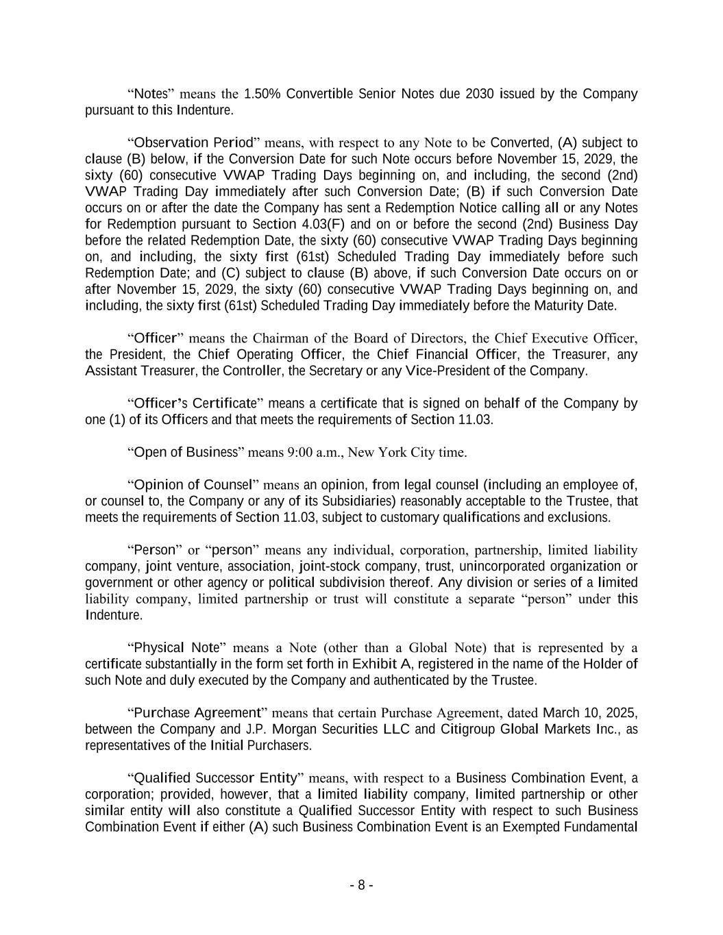 - 8 - “Notes” means the 1.50% Convertible Senior Notes due 2030 issued by the Company pursuant to this Indenture. “Observation Period” means, with respect to any Note to be Converted, (A) subject to clause (B) below, if the Conversion Date for such Note occurs before November 15, 2029, the sixty (60) consecutive VWAP Trading Days beginning on, and including, the second (2nd) VWAP Trading Day immediately after such Conversion Date; (B) if such Conversion Date occurs on or after the date the Company has sent a Redemption Notice calling all or any Notes for Redemption pursuant to Section 4.03(F) and on or before the second (2nd) Business Day before the related Redemption Date, the sixty (60) consecutive VWAP Trading Days beginning on, and including, the sixty first (61st) Scheduled Trading Day immediately before such Redemption Date; and (C) subject to clause (B) above, if such Conversion Date occurs on or after November 15, 2029, the sixty (60) consecutive VWAP Trading Days beginning on, and including, the sixty first (61st) Scheduled Trading Day immediately before the Maturity Date. “Officer” means the Chairman of the Board of Directors, the Chief Executive Officer, the President, the Chief Operating Officer, the Chief Financial Officer, the Treasurer, any Assistant Treasurer, the Controller, the Secretary or any Vice-President of the Company. “Officer’s Certificate” means a certificate that is signed on behalf of the Company by one (1) of its Officers and that meets the requirements of Section 11.03. “Open of Business” means 9:00 a.m., New York City time. “Opinion of Counsel” means an opinion, from legal counsel (including an employee of, or counsel to, the Company or any of its Subsidiaries) reasonably acceptable to the Trustee, that meets the requirements of Section 11.03, subject to customary qualifications and exclusions. “Person” or “person” means any individual, corporation, partnership, limited liability company, joint venture, association, joint-stock company, trust, unincorporated organization or government or other agency or political subdivision thereof. Any division or series of a limited liability company, limited partnership or trust will constitute a separate “person” under this Indenture. “Physical Note” means a Note (other than a Global Note) that is represented by a certificate substantially in the form set forth in Exhibit A, registered in the name of the Holder of such Note and duly executed by the Company and authenticated by the Trustee. “Purchase Agreement” means that certain Purchase Agreement, dated March 10, 2025, between the Company and J.P. Morgan Securities LLC and Citigroup Global Markets Inc., as representatives of the Initial Purchasers. “Qualified Successor Entity” means, with respect to a Business Combination Event, a corporation; provided, however, that a limited liability company, limited partnership or other similar entity will also constitute a Qualified Successor Entity with respect to such Business Combination Event if either (A) such Business Combination Event is an Exempted Fundamental