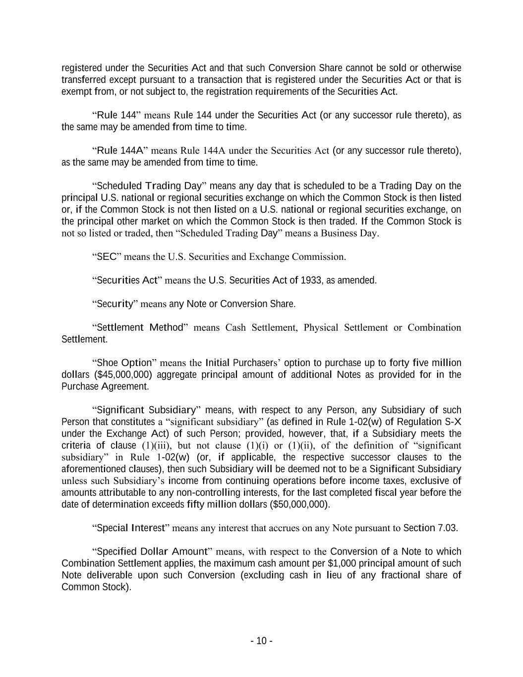 - 10 - registered under the Securities Act and that such Conversion Share cannot be sold or otherwise transferred except pursuant to a transaction that is registered under the Securities Act or that is exempt from, or not subject to, the registration requirements of the Securities Act. “Rule 144” means Rule 144 under the Securities Act (or any successor rule thereto), as the same may be amended from time to time. “Rule 144A” means Rule 144A under the Securities Act (or any successor rule thereto), as the same may be amended from time to time. “Scheduled Trading Day” means any day that is scheduled to be a Trading Day on the principal U.S. national or regional securities exchange on which the Common Stock is then listed or, if the Common Stock is not then listed on a U.S. national or regional securities exchange, on the principal other market on which the Common Stock is then traded. If the Common Stock is not so listed or traded, then “Scheduled Trading Day” means a Business Day. “SEC” means the U.S. Securities and Exchange Commission. “Securities Act” means the U.S. Securities Act of 1933, as amended. “Security” means any Note or Conversion Share. “Settlement Method” means Cash Settlement, Physical Settlement or Combination Settlement. “Shoe Option” means the Initial Purchasers’ option to purchase up to forty five million dollars ($45,000,000) aggregate principal amount of additional Notes as provided for in the Purchase Agreement. “Significant Subsidiary” means, with respect to any Person, any Subsidiary of such Person that constitutes a “significant subsidiary” (as defined in Rule 1-02(w) of Regulation S-X under the Exchange Act) of such Person; provided, however, that, if a Subsidiary meets the criteria of clause (1)(iii), but not clause (1)(i) or (1)(ii), of the definition of “significant subsidiary” in Rule 1-02(w) (or, if applicable, the respective successor clauses to the aforementioned clauses), then such Subsidiary will be deemed not to be a Significant Subsidiary unless such Subsidiary’s income from continuing operations before income taxes, exclusive of amounts attributable to any non-controlling interests, for the last completed fiscal year before the date of determination exceeds fifty million dollars ($50,000,000). “Special Interest” means any interest that accrues on any Note pursuant to Section 7.03. “Specified Dollar Amount” means, with respect to the Conversion of a Note to which Combination Settlement applies, the maximum cash amount per $1,000 principal amount of such Note deliverable upon such Conversion (excluding cash in lieu of any fractional share of Common Stock).
