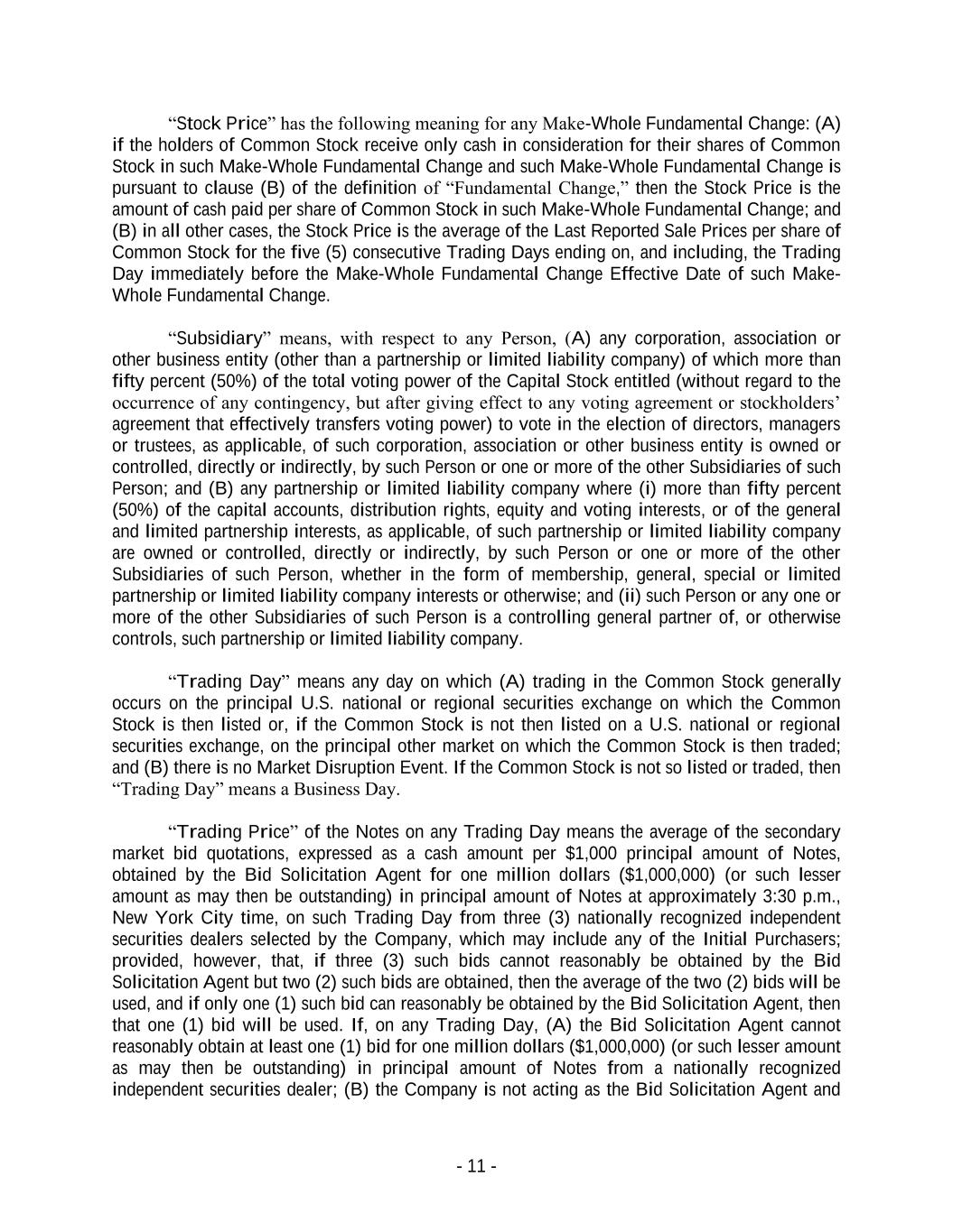 - 11 - “Stock Price” has the following meaning for any Make-Whole Fundamental Change: (A) if the holders of Common Stock receive only cash in consideration for their shares of Common Stock in such Make-Whole Fundamental Change and such Make-Whole Fundamental Change is pursuant to clause (B) of the definition of “Fundamental Change,” then the Stock Price is the amount of cash paid per share of Common Stock in such Make-Whole Fundamental Change; and (B) in all other cases, the Stock Price is the average of the Last Reported Sale Prices per share of Common Stock for the five (5) consecutive Trading Days ending on, and including, the Trading Day immediately before the Make-Whole Fundamental Change Effective Date of such Make- Whole Fundamental Change. “Subsidiary” means, with respect to any Person, (A) any corporation, association or other business entity (other than a partnership or limited liability company) of which more than fifty percent (50%) of the total voting power of the Capital Stock entitled (without regard to the occurrence of any contingency, but after giving effect to any voting agreement or stockholders’ agreement that effectively transfers voting power) to vote in the election of directors, managers or trustees, as applicable, of such corporation, association or other business entity is owned or controlled, directly or indirectly, by such Person or one or more of the other Subsidiaries of such Person; and (B) any partnership or limited liability company where (i) more than fifty percent (50%) of the capital accounts, distribution rights, equity and voting interests, or of the general and limited partnership interests, as applicable, of such partnership or limited liability company are owned or controlled, directly or indirectly, by such Person or one or more of the other Subsidiaries of such Person, whether in the form of membership, general, special or limited partnership or limited liability company interests or otherwise; and (ii) such Person or any one or more of the other Subsidiaries of such Person is a controlling general partner of, or otherwise controls, such partnership or limited liability company. “Trading Day” means any day on which (A) trading in the Common Stock generally occurs on the principal U.S. national or regional securities exchange on which the Common Stock is then listed or, if the Common Stock is not then listed on a U.S. national or regional securities exchange, on the principal other market on which the Common Stock is then traded; and (B) there is no Market Disruption Event. If the Common Stock is not so listed or traded, then “Trading Day” means a Business Day. “Trading Price” of the Notes on any Trading Day means the average of the secondary market bid quotations, expressed as a cash amount per $1,000 principal amount of Notes, obtained by the Bid Solicitation Agent for one million dollars ($1,000,000) (or such lesser amount as may then be outstanding) in principal amount of Notes at approximately 3:30 p.m., New York City time, on such Trading Day from three (3) nationally recognized independent securities dealers selected by the Company, which may include any of the Initial Purchasers; provided, however, that, if three (3) such bids cannot reasonably be obtained by the Bid Solicitation Agent but two (2) such bids are obtained, then the average of the two (2) bids will be used, and if only one (1) such bid can reasonably be obtained by the Bid Solicitation Agent, then that one (1) bid will be used. If, on any Trading Day, (A) the Bid Solicitation Agent cannot reasonably obtain at least one (1) bid for one million dollars ($1,000,000) (or such lesser amount as may then be outstanding) in principal amount of Notes from a nationally recognized independent securities dealer; (B) the Company is not acting as the Bid Solicitation Agent and