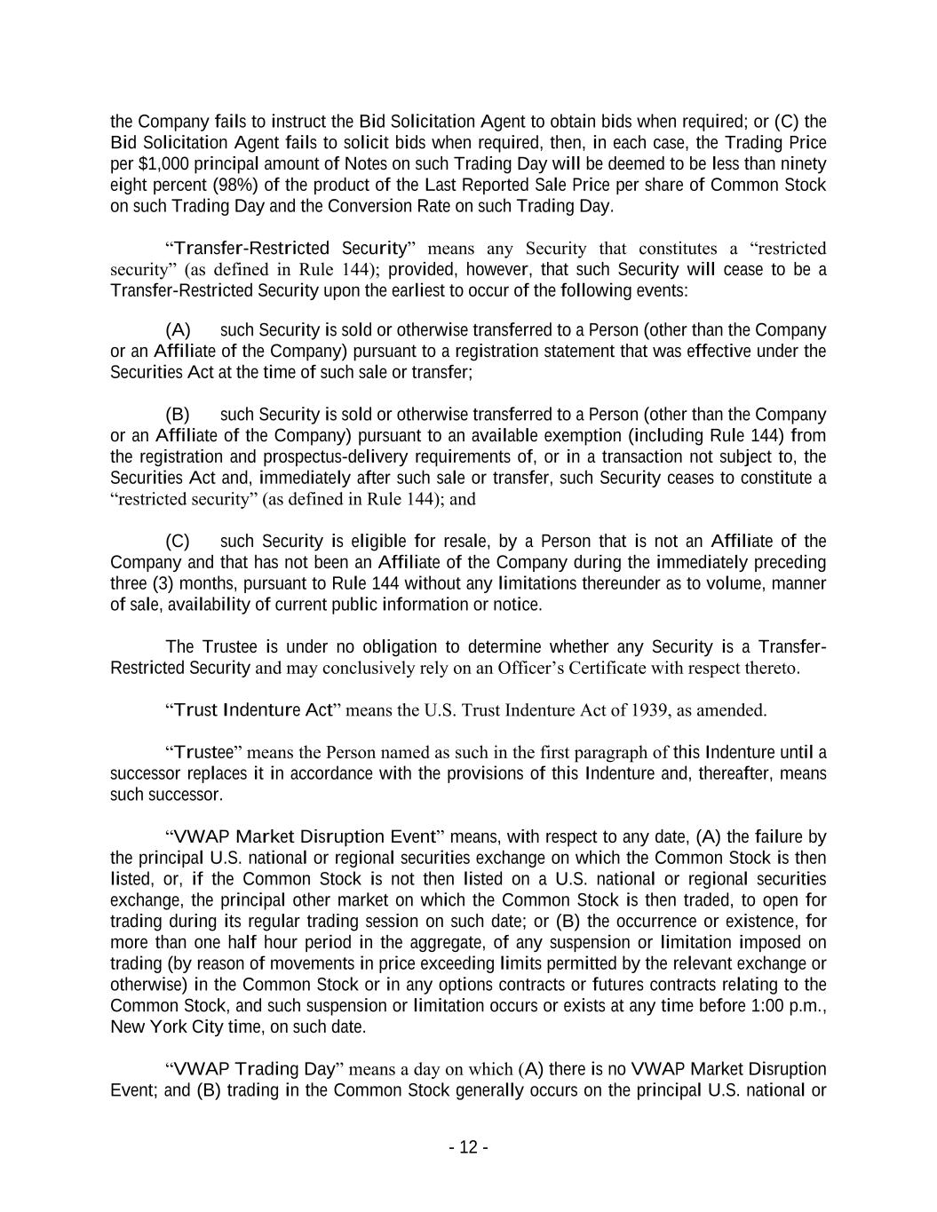 - 12 - the Company fails to instruct the Bid Solicitation Agent to obtain bids when required; or (C) the Bid Solicitation Agent fails to solicit bids when required, then, in each case, the Trading Price per $1,000 principal amount of Notes on such Trading Day will be deemed to be less than ninety eight percent (98%) of the product of the Last Reported Sale Price per share of Common Stock on such Trading Day and the Conversion Rate on such Trading Day. “Transfer-Restricted Security” means any Security that constitutes a “restricted security” (as defined in Rule 144); provided, however, that such Security will cease to be a Transfer-Restricted Security upon the earliest to occur of the following events: (A) such Security is sold or otherwise transferred to a Person (other than the Company or an Affiliate of the Company) pursuant to a registration statement that was effective under the Securities Act at the time of such sale or transfer; (B) such Security is sold or otherwise transferred to a Person (other than the Company or an Affiliate of the Company) pursuant to an available exemption (including Rule 144) from the registration and prospectus-delivery requirements of, or in a transaction not subject to, the Securities Act and, immediately after such sale or transfer, such Security ceases to constitute a “restricted security” (as defined in Rule 144); and (C) such Security is eligible for resale, by a Person that is not an Affiliate of the Company and that has not been an Affiliate of the Company during the immediately preceding three (3) months, pursuant to Rule 144 without any limitations thereunder as to volume, manner of sale, availability of current public information or notice. The Trustee is under no obligation to determine whether any Security is a Transfer- Restricted Security and may conclusively rely on an Officer’s Certificate with respect thereto. “Trust Indenture Act” means the U.S. Trust Indenture Act of 1939, as amended. “Trustee” means the Person named as such in the first paragraph of this Indenture until a successor replaces it in accordance with the provisions of this Indenture and, thereafter, means such successor. “VWAP Market Disruption Event” means, with respect to any date, (A) the failure by the principal U.S. national or regional securities exchange on which the Common Stock is then listed, or, if the Common Stock is not then listed on a U.S. national or regional securities exchange, the principal other market on which the Common Stock is then traded, to open for trading during its regular trading session on such date; or (B) the occurrence or existence, for more than one half hour period in the aggregate, of any suspension or limitation imposed on trading (by reason of movements in price exceeding limits permitted by the relevant exchange or otherwise) in the Common Stock or in any options contracts or futures contracts relating to the Common Stock, and such suspension or limitation occurs or exists at any time before 1:00 p.m., New York City time, on such date. “VWAP Trading Day” means a day on which (A) there is no VWAP Market Disruption Event; and (B) trading in the Common Stock generally occurs on the principal U.S. national or