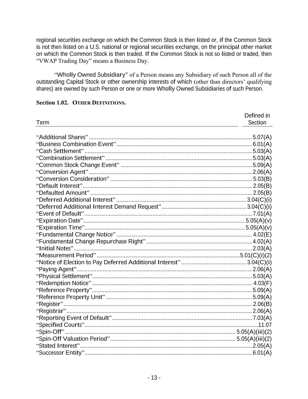 - 13 - regional securities exchange on which the Common Stock is then listed or, if the Common Stock is not then listed on a U.S. national or regional securities exchange, on the principal other market on which the Common Stock is then traded. If the Common Stock is not so listed or traded, then “VWAP Trading Day” means a Business Day. “Wholly Owned Subsidiary” of a Person means any Subsidiary of such Person all of the outstanding Capital Stock or other ownership interests of which (other than directors’ qualifying shares) are owned by such Person or one or more Wholly Owned Subsidiaries of such Person. Section 1.02. OTHER DEFINITIONS. Term Defined in Section “Additional Shares” ............................................................................................................ 5.07(A) “Business Combination Event” .......................................................................................... 6.01(A) “Cash Settlement” ............................................................................................................... 5.03(A) “Combination Settlement” ................................................................................................. 5.03(A) “Common Stock Change Event” ....................................................................................... 5.09(A) “Conversion Agent” ............................................................................................................ 2.06(A) “Conversion Consideration” .............................................................................................. 5.03(B) “Default Interest” ................................................................................................................ 2.05(B) “Defaulted Amount” ........................................................................................................... 2.05(B) “Deferred Additional Interest” ...................................................................................... 3.04(C)(i) “Deferred Additional Interest Demand Request” ........................................................ 3.04(C)(i) “Event of Default” ............................................................................................................... 7.01(A) “Expiration Date”........................................................................................................... 5.05(A)(v) “Expiration Time” .......................................................................................................... 5.05(A)(v) “Fundamental Change Notice” .......................................................................................... 4.02(E) “Fundamental Change Repurchase Right” ...................................................................... 4.02(A) “Initial Notes” ...................................................................................................................... 2.03(A) “Measurement Period” ...............................................................................................5.01(C)(i)(2) “Notice of Election to Pay Deferred Additional Interest” ........................................... 3.04(C)(i) “Paying Agent” .................................................................................................................... 2.06(A) “Physical Settlement” .......................................................................................................... 5.03(A) “Redemption Notice” .......................................................................................................... 4.03(F) “Reference Property” .......................................................................................................... 5.09(A) “Reference Property Unit” ................................................................................................. 5.09(A) “Register” ............................................................................................................................. 2.06(B) “Registrar” ........................................................................................................................... 2.06(A) “Reporting Event of Default” ............................................................................................. 7.03(A) “Specified Courts” ...................................................................................................................11.07 “Spin-Off” ................................................................................................................. 5.05(A)(iii)(2) “Spin-Off Valuation Period” ................................................................................... 5.05(A)(iii)(2) “Stated Interest” .................................................................................................................. 2.05(A) “Successor Entity” ............................................................................................................... 6.01(A)