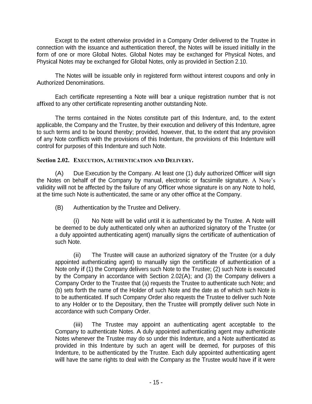 - 15 - Except to the extent otherwise provided in a Company Order delivered to the Trustee in connection with the issuance and authentication thereof, the Notes will be issued initially in the form of one or more Global Notes. Global Notes may be exchanged for Physical Notes, and Physical Notes may be exchanged for Global Notes, only as provided in Section 2.10. The Notes will be issuable only in registered form without interest coupons and only in Authorized Denominations. Each certificate representing a Note will bear a unique registration number that is not affixed to any other certificate representing another outstanding Note. The terms contained in the Notes constitute part of this Indenture, and, to the extent applicable, the Company and the Trustee, by their execution and delivery of this Indenture, agree to such terms and to be bound thereby; provided, however, that, to the extent that any provision of any Note conflicts with the provisions of this Indenture, the provisions of this Indenture will control for purposes of this Indenture and such Note. Section 2.02. EXECUTION, AUTHENTICATION AND DELIVERY. (A) Due Execution by the Company. At least one (1) duly authorized Officer will sign the Notes on behalf of the Company by manual, electronic or facsimile signature. A Note’s validity will not be affected by the failure of any Officer whose signature is on any Note to hold, at the time such Note is authenticated, the same or any other office at the Company. (B) Authentication by the Trustee and Delivery. (i) No Note will be valid until it is authenticated by the Trustee. A Note will be deemed to be duly authenticated only when an authorized signatory of the Trustee (or a duly appointed authenticating agent) manually signs the certificate of authentication of such Note. (ii) The Trustee will cause an authorized signatory of the Trustee (or a duly appointed authenticating agent) to manually sign the certificate of authentication of a Note only if (1) the Company delivers such Note to the Trustee; (2) such Note is executed by the Company in accordance with Section 2.02(A); and (3) the Company delivers a Company Order to the Trustee that (a) requests the Trustee to authenticate such Note; and (b) sets forth the name of the Holder of such Note and the date as of which such Note is to be authenticated. If such Company Order also requests the Trustee to deliver such Note to any Holder or to the Depositary, then the Trustee will promptly deliver such Note in accordance with such Company Order. (iii) The Trustee may appoint an authenticating agent acceptable to the Company to authenticate Notes. A duly appointed authenticating agent may authenticate Notes whenever the Trustee may do so under this Indenture, and a Note authenticated as provided in this Indenture by such an agent will be deemed, for purposes of this Indenture, to be authenticated by the Trustee. Each duly appointed authenticating agent will have the same rights to deal with the Company as the Trustee would have if it were