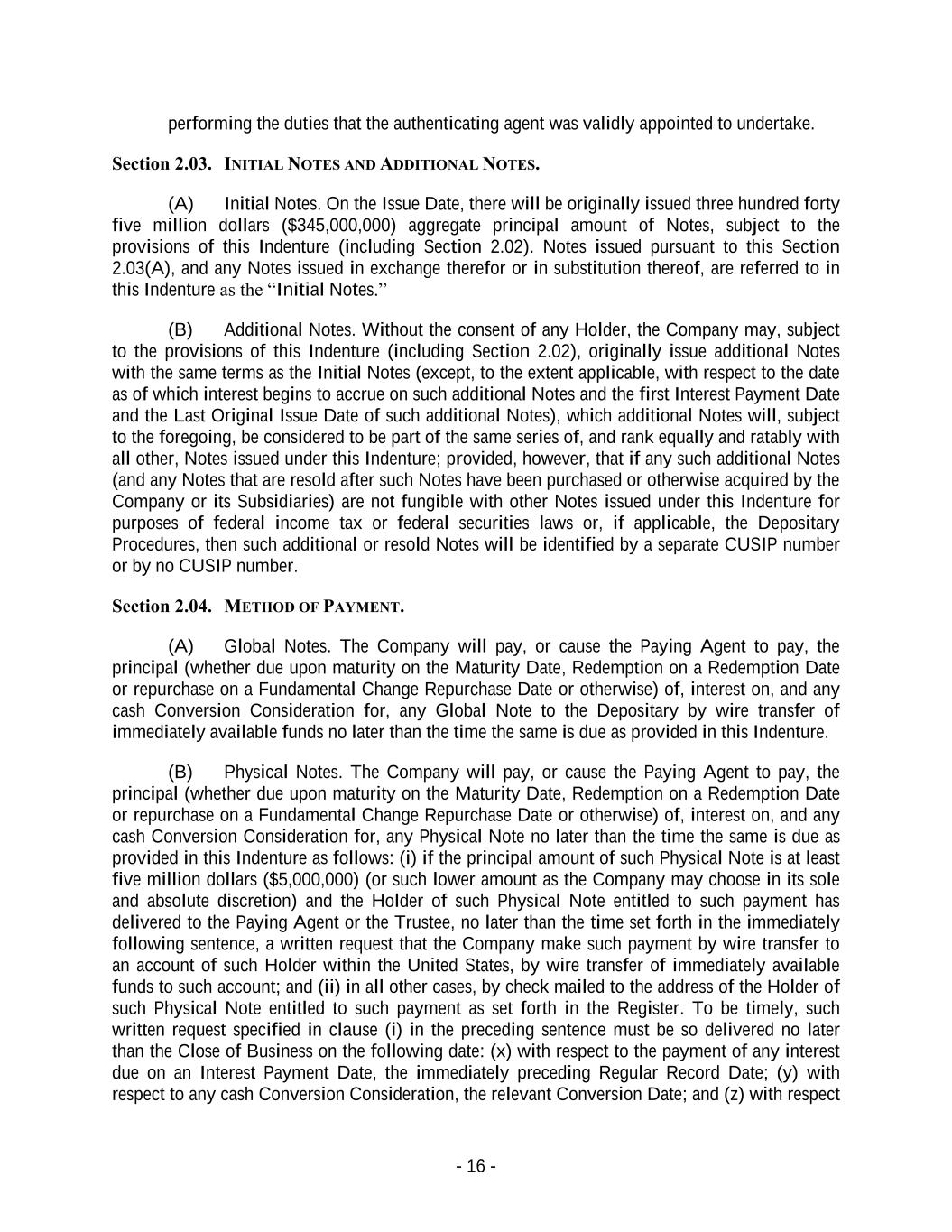 - 16 - performing the duties that the authenticating agent was validly appointed to undertake. Section 2.03. INITIAL NOTES AND ADDITIONAL NOTES. (A) Initial Notes. On the Issue Date, there will be originally issued three hundred forty five million dollars ($345,000,000) aggregate principal amount of Notes, subject to the provisions of this Indenture (including Section 2.02). Notes issued pursuant to this Section 2.03(A), and any Notes issued in exchange therefor or in substitution thereof, are referred to in this Indenture as the “Initial Notes.” (B) Additional Notes. Without the consent of any Holder, the Company may, subject to the provisions of this Indenture (including Section 2.02), originally issue additional Notes with the same terms as the Initial Notes (except, to the extent applicable, with respect to the date as of which interest begins to accrue on such additional Notes and the first Interest Payment Date and the Last Original Issue Date of such additional Notes), which additional Notes will, subject to the foregoing, be considered to be part of the same series of, and rank equally and ratably with all other, Notes issued under this Indenture; provided, however, that if any such additional Notes (and any Notes that are resold after such Notes have been purchased or otherwise acquired by the Company or its Subsidiaries) are not fungible with other Notes issued under this Indenture for purposes of federal income tax or federal securities laws or, if applicable, the Depositary Procedures, then such additional or resold Notes will be identified by a separate CUSIP number or by no CUSIP number. Section 2.04. METHOD OF PAYMENT. (A) Global Notes. The Company will pay, or cause the Paying Agent to pay, the principal (whether due upon maturity on the Maturity Date, Redemption on a Redemption Date or repurchase on a Fundamental Change Repurchase Date or otherwise) of, interest on, and any cash Conversion Consideration for, any Global Note to the Depositary by wire transfer of immediately available funds no later than the time the same is due as provided in this Indenture. (B) Physical Notes. The Company will pay, or cause the Paying Agent to pay, the principal (whether due upon maturity on the Maturity Date, Redemption on a Redemption Date or repurchase on a Fundamental Change Repurchase Date or otherwise) of, interest on, and any cash Conversion Consideration for, any Physical Note no later than the time the same is due as provided in this Indenture as follows: (i) if the principal amount of such Physical Note is at least five million dollars ($5,000,000) (or such lower amount as the Company may choose in its sole and absolute discretion) and the Holder of such Physical Note entitled to such payment has delivered to the Paying Agent or the Trustee, no later than the time set forth in the immediately following sentence, a written request that the Company make such payment by wire transfer to an account of such Holder within the United States, by wire transfer of immediately available funds to such account; and (ii) in all other cases, by check mailed to the address of the Holder of such Physical Note entitled to such payment as set forth in the Register. To be timely, such written request specified in clause (i) in the preceding sentence must be so delivered no later than the Close of Business on the following date: (x) with respect to the payment of any interest due on an Interest Payment Date, the immediately preceding Regular Record Date; (y) with respect to any cash Conversion Consideration, the relevant Conversion Date; and (z) with respect